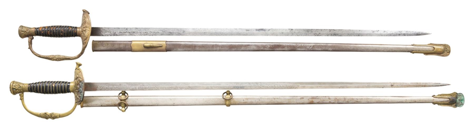 1) A GAR sword measuring 36 1/2" overall with an etched 29 1/2" blade. The etched blade decoration includes patriotic, military, GAR, and foliate motifs. Gilded brass hilt with a wire wrapped leather grip. There is a large "GAR" on the down turned guard. Gilded brass mounted plated scabbard. CONDITION: light wear overall with some verdigris on the guard. scabbard shows light wear with verdigris on the drag, 2) A GAR sword measuring 34 3/4" overall with a plain 28" blade. Gilded brass hilt with a wire wrapped leather grip. There is a large eagle with flags on the down turned guard. Gilded brass mounted plated scabbard with frog stud.. CONDITION: light wear overall with scuffs to the grip. Scabbard shows light wear.(02-24097/BF). NON-GUN. $250-400.