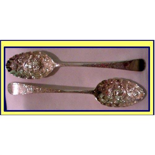 2 identical George III sterling silver berry spoons. London 1784 and 1795.<BR>Measure 9inches long and weigh a little under 5oz (together).<BR>Large bowl of each spoon has a frilly, scalloped border. It contains a central mask head surrounded by grapes, vines and scrolls. The handles are engraved and chased with similar patterns, the wide portion of the handle bearing a vacant cartouche. <BR>Backs of spoons are marked as follows:<BR>1) date mark i for 1784-5. London and sterling mark and maker's mark<BR>AB. 2) Maker's mark appears to be LH. Monarch head, lion, leopard, date mark u for 1795.<BR>Excellent condition.