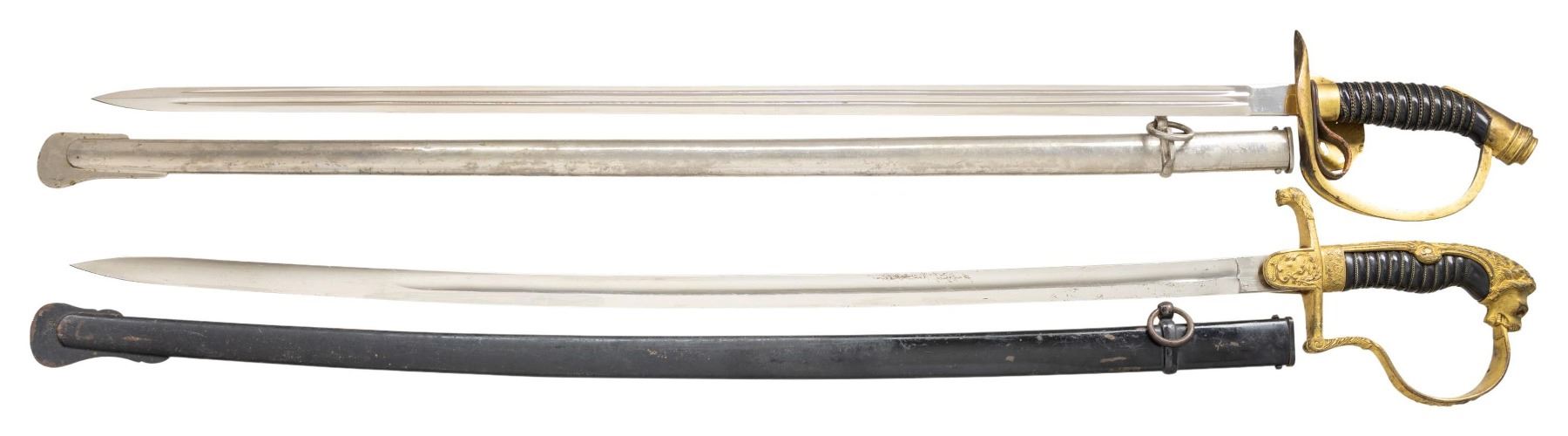 1) A nice Prussian M1889 folding guard Infantry Officer's sword measuring 35" overall with a 28 3/8" blade. The double fullered blade is marked at the ricasso "(knight's head) WKC". The gilded hilt has a folding guard, with a pierced Prussian eagle. Shaped wire wrapped composite grip and a plated scabbard. CONDITION: blade shows substantial original factory polish. Hilt and scabbard generally show light wear with a few oxidation spots on the eagle and knuckle bow. 2) A very fine German Artillery Officer's sword measuring 34 3/4" overall with a 28 1/2" blade. The single fullered blade is undecorated. The gilded hilt is highly embellished throughout with crossed cannons on one of the langets. The well articulated lion head pommel has "ruby" eyes. Shaped wire wrapped composite grip and a black enameled scabbard. CONDITION: blade shows light wear but could stand a cleaning. Hilt exhibits light wear. Scabbard has the majority of the finish intact. (02-25013/BF). $300-600.