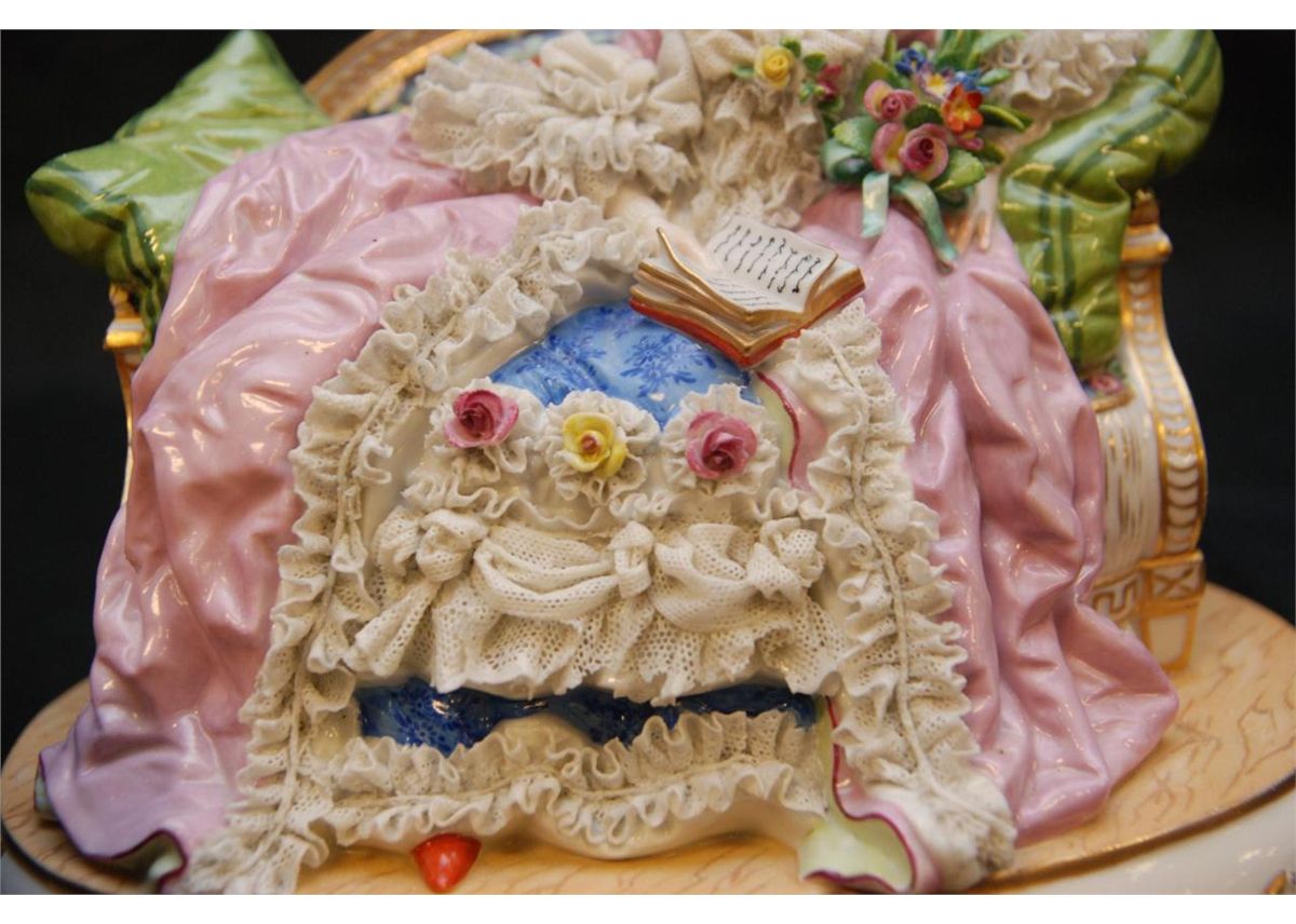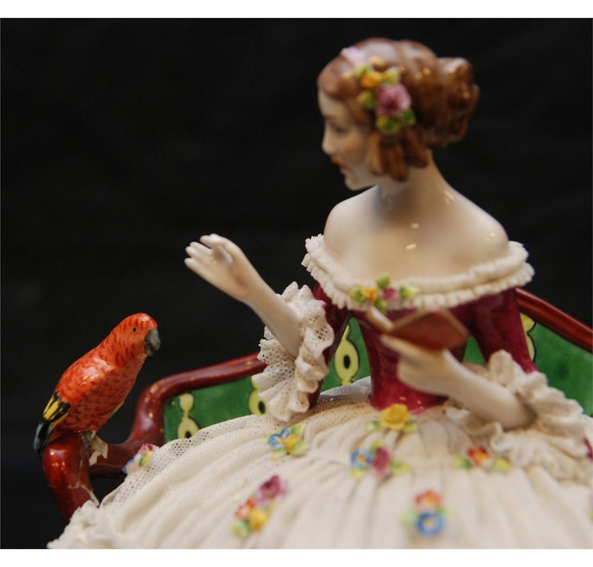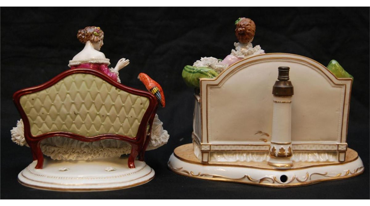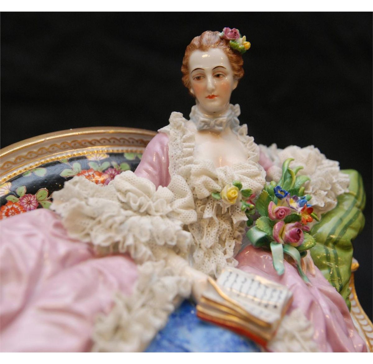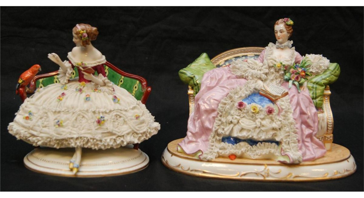 Pair of German hand painted porcelain figures depicting women sitting on a settee. Each having a lace porcelain design with figural flowers. One holding a crown mark to bottom. 19th/20th century. Largest measures 8" height x 10 3/4" length (20.3cm x 27.3cm). Total weight of 3177 grams.