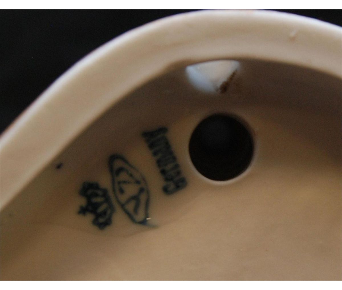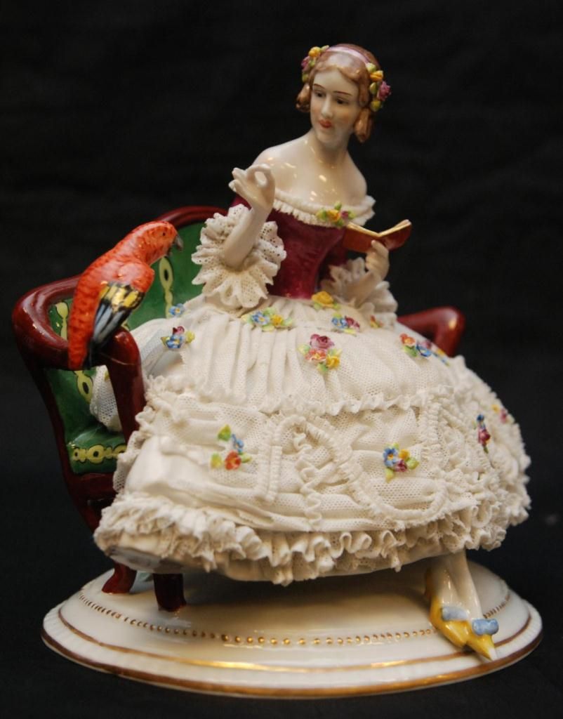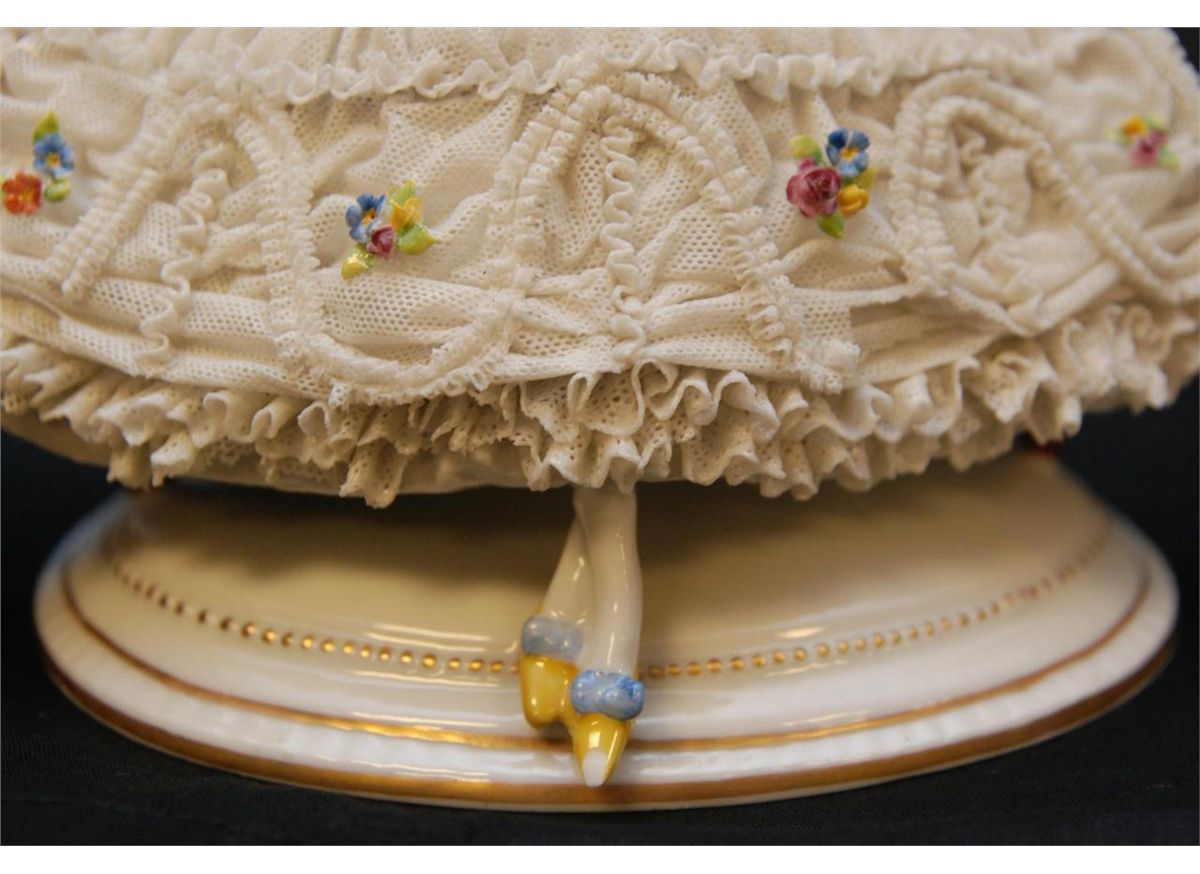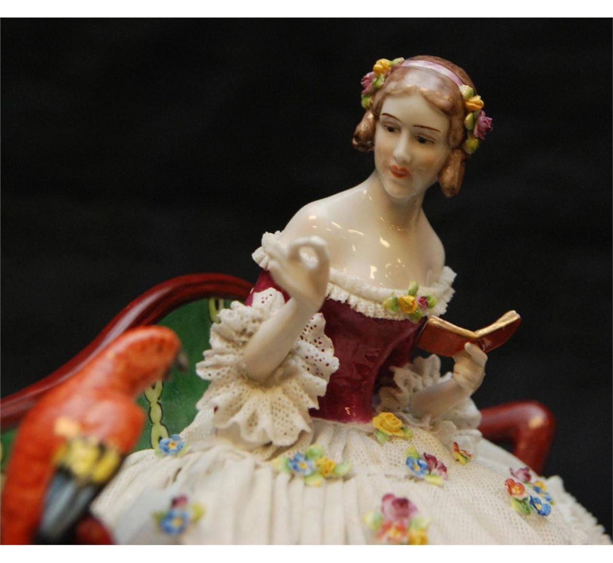 Pair of German hand painted porcelain figures depicting women sitting on a settee. Each having a lace porcelain design with figural flowers. One holding a crown mark to bottom. 19th/20th century. Largest measures 8" height x 10 3/4" length (20.3cm x 27.3cm). Total weight of 3177 grams.