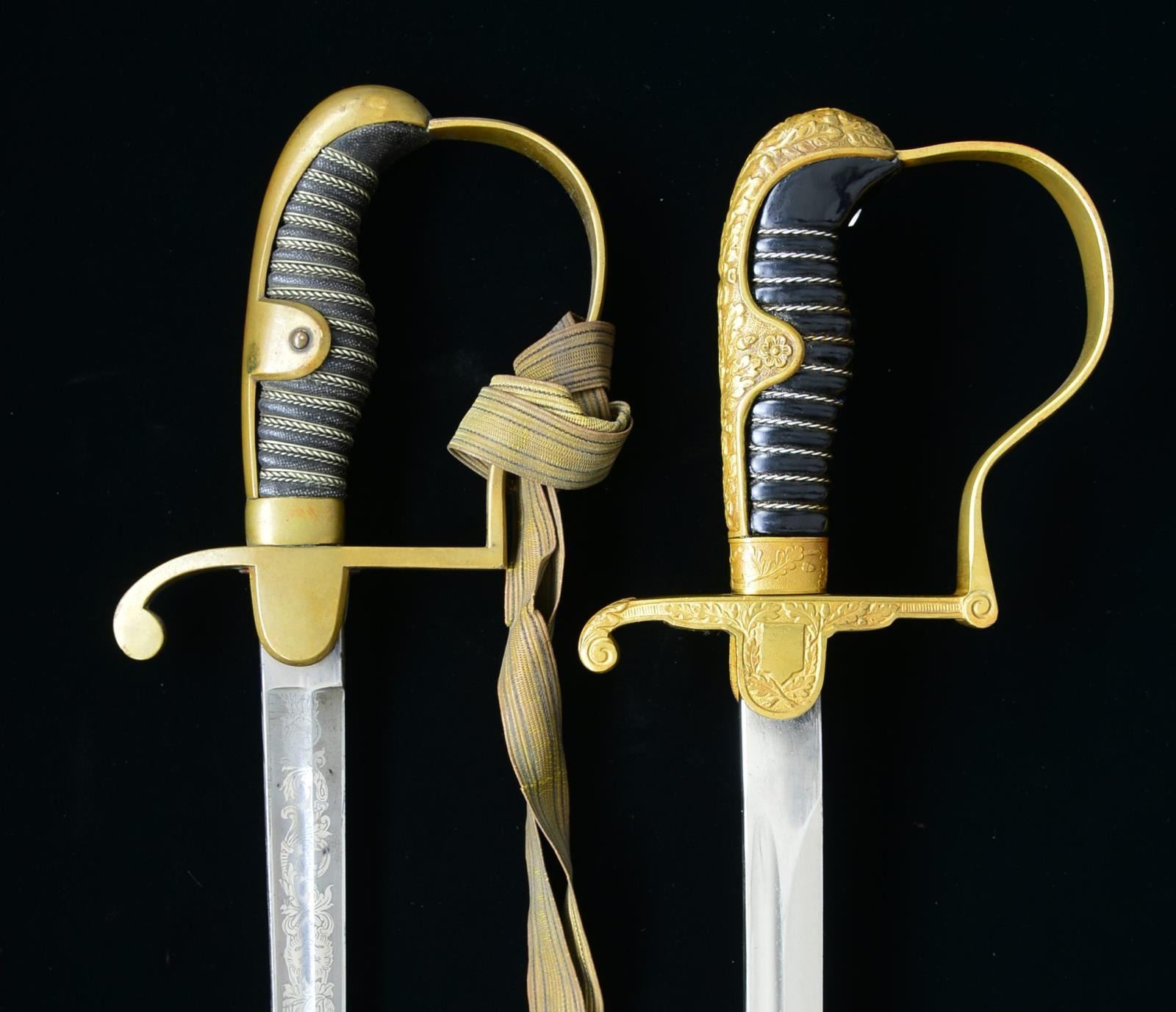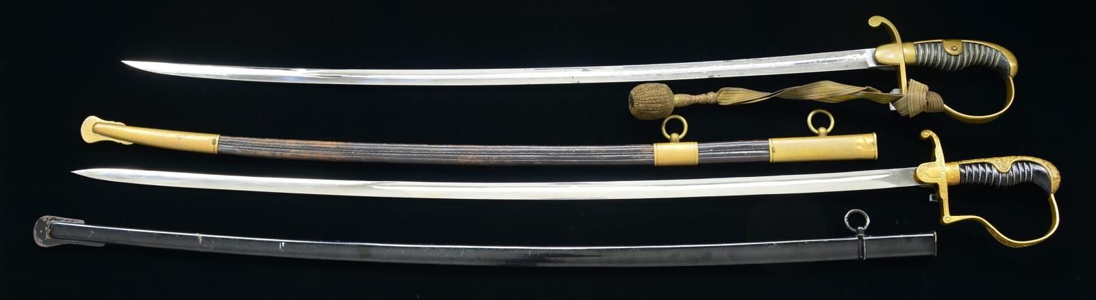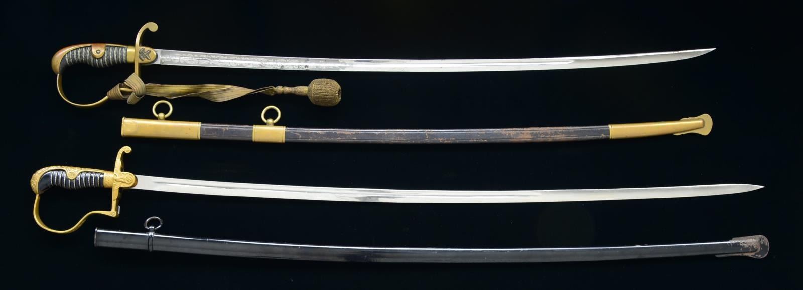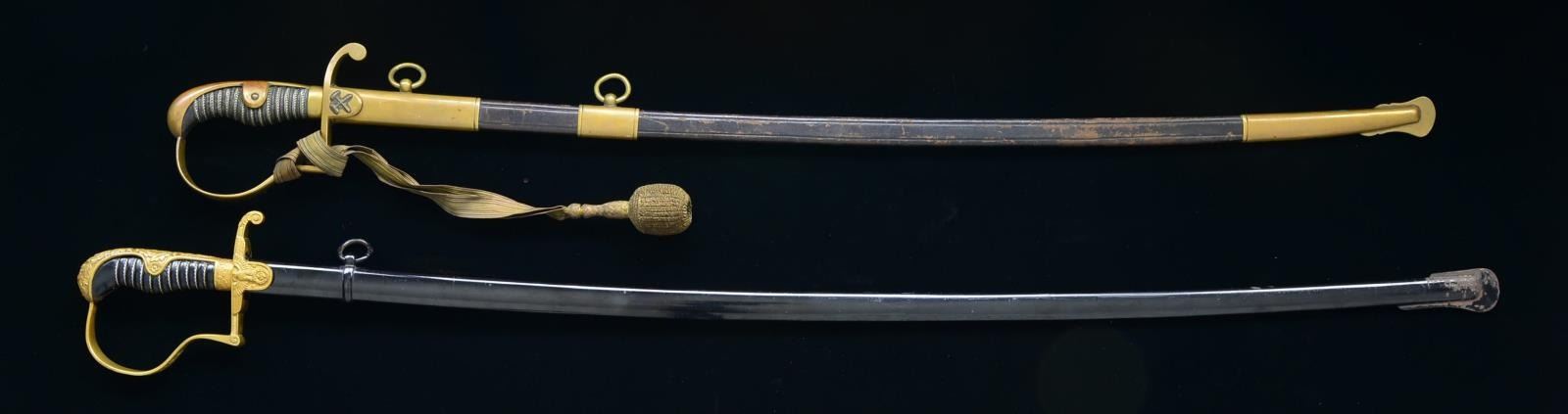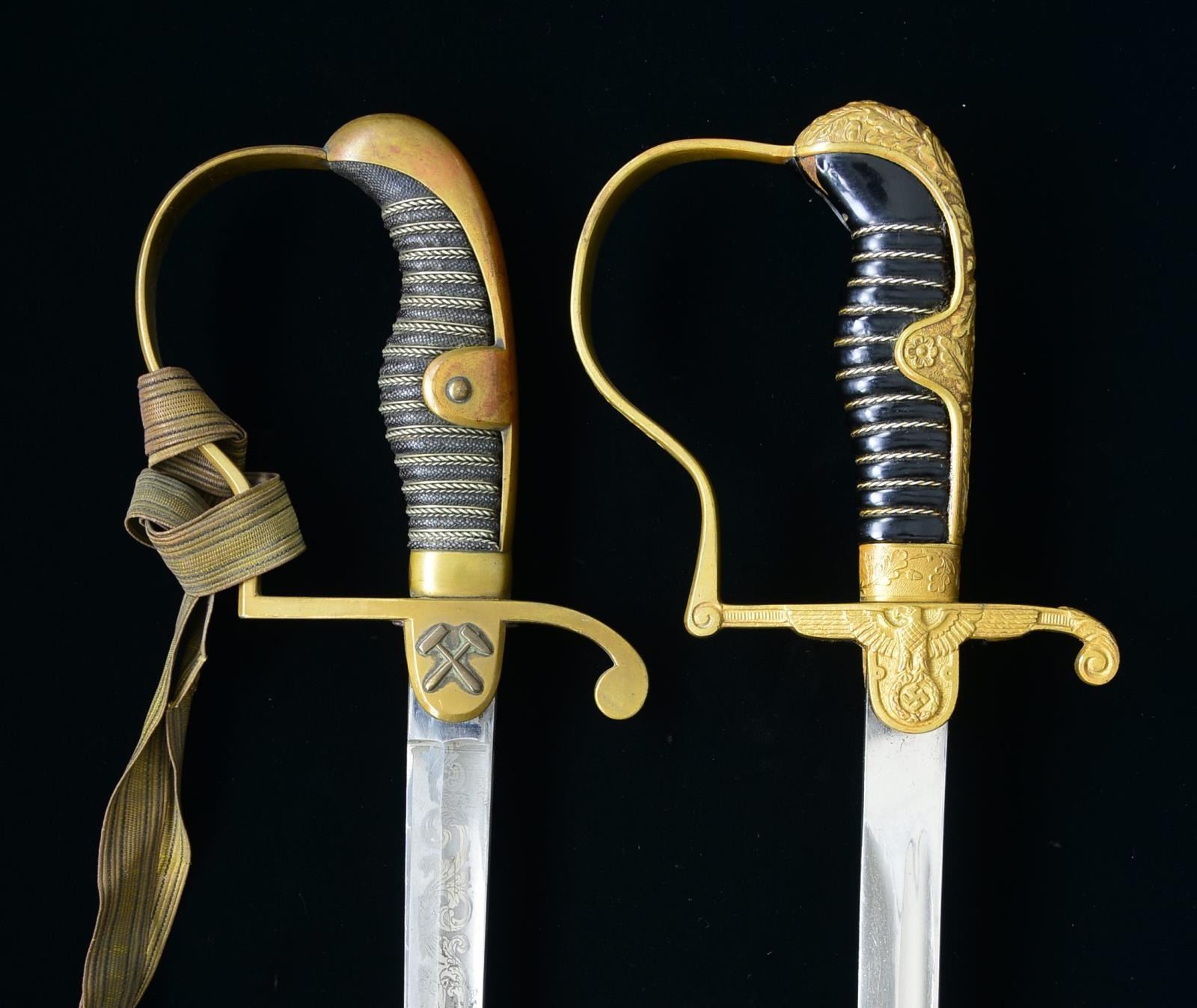 1) WWI MINERS SWORD. Overall length: 36 1/2". Blade length: 30 3/4". Single fullered blade etched over 1/3 of its length w/ various foliate motifs. Gilded brass hilt w/ crossed miner’s hammers on the languet. Wire wrapped sharkskin grip. There is a gold bullion sword knot attached to the hilt. Gilded brass mounted leather scabbard. CONDITION: blade shows substantial original factory polish w/ a few scattered dark spots. Etching is frosty. Traces of gilding remain on the hilt. Grip is undamaged. Sword knot shows light wear. Scabbard shows surface abrasions but no damage. (02-15000/BF). 2) WWII ARMY OFFICER'S SWORD. Overall length: 40 5/8". Blade length: 34 1/2". Plain single fullered blade. Gilded brass hilt w/ spread winged German eagle & Party symbol on the crossguard & languet. Knuckle bow & back strap are ornately embellished w/ an oak leaf motif. Black composite grip w/ silver wire wrap. Black enameled metal scabbard. CONDITION: blade shows substantial original factory polish. Hilt retains most of its original gilding. Grip has a sm. separation near the pommel. Wire is complete. Scabbard shows minor loss of finish concentrated near the drag. (02-15004/BF). $500-800.