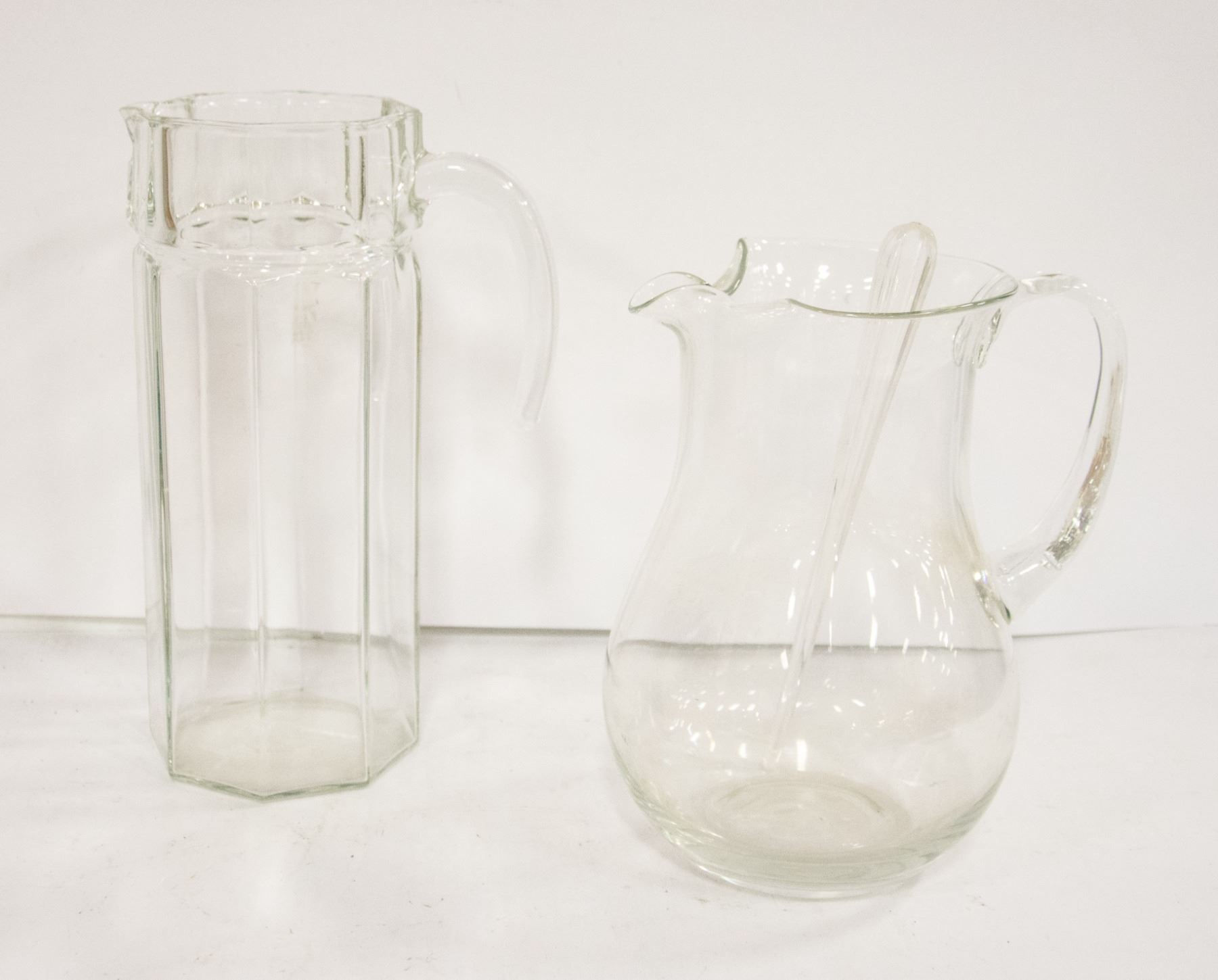 2 GLASS PITCHERS AND 9" GLASS BOWL
