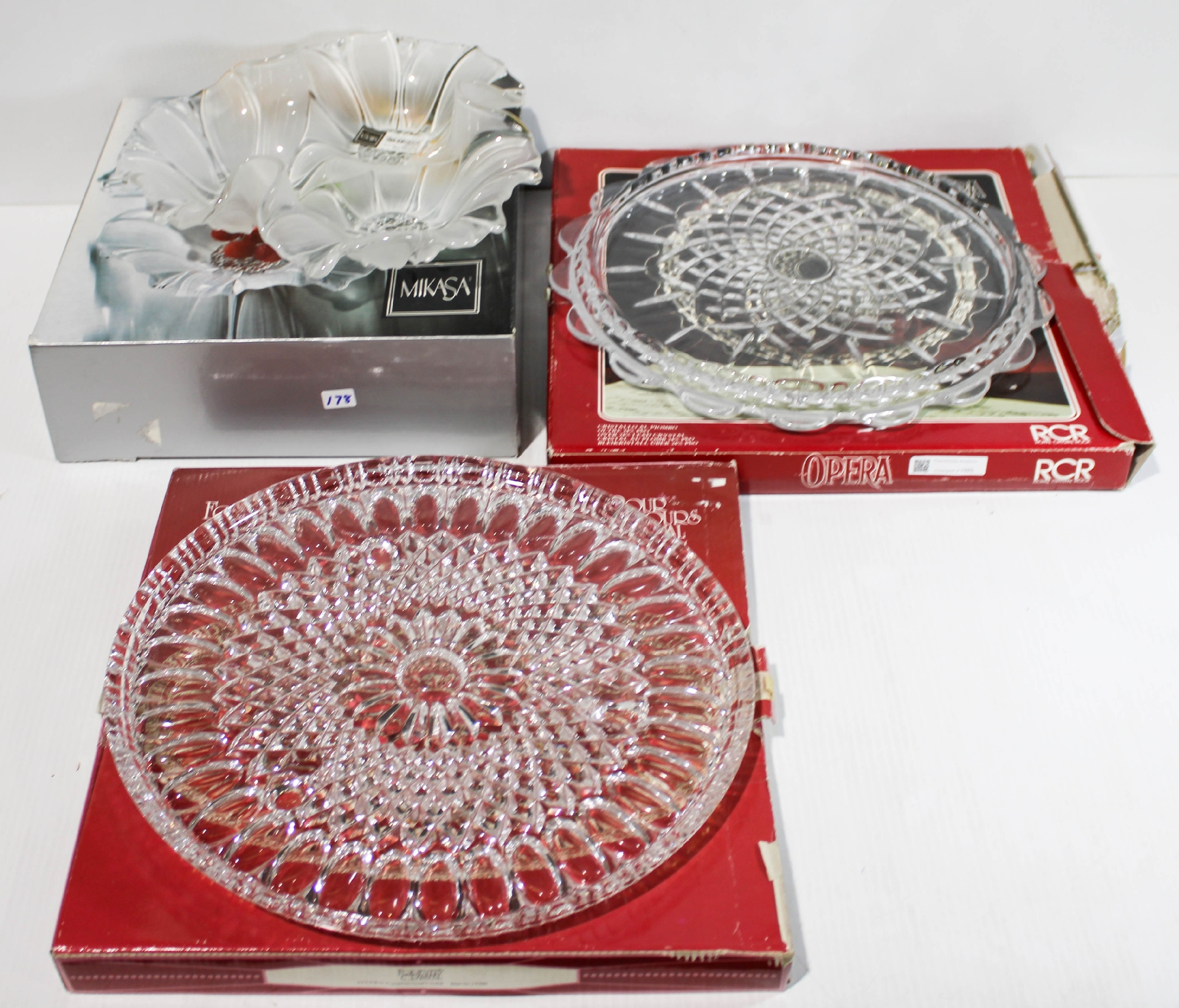 2 GLASS PLATTERS 1 FLORAL DIVIDED RELISH BOWL