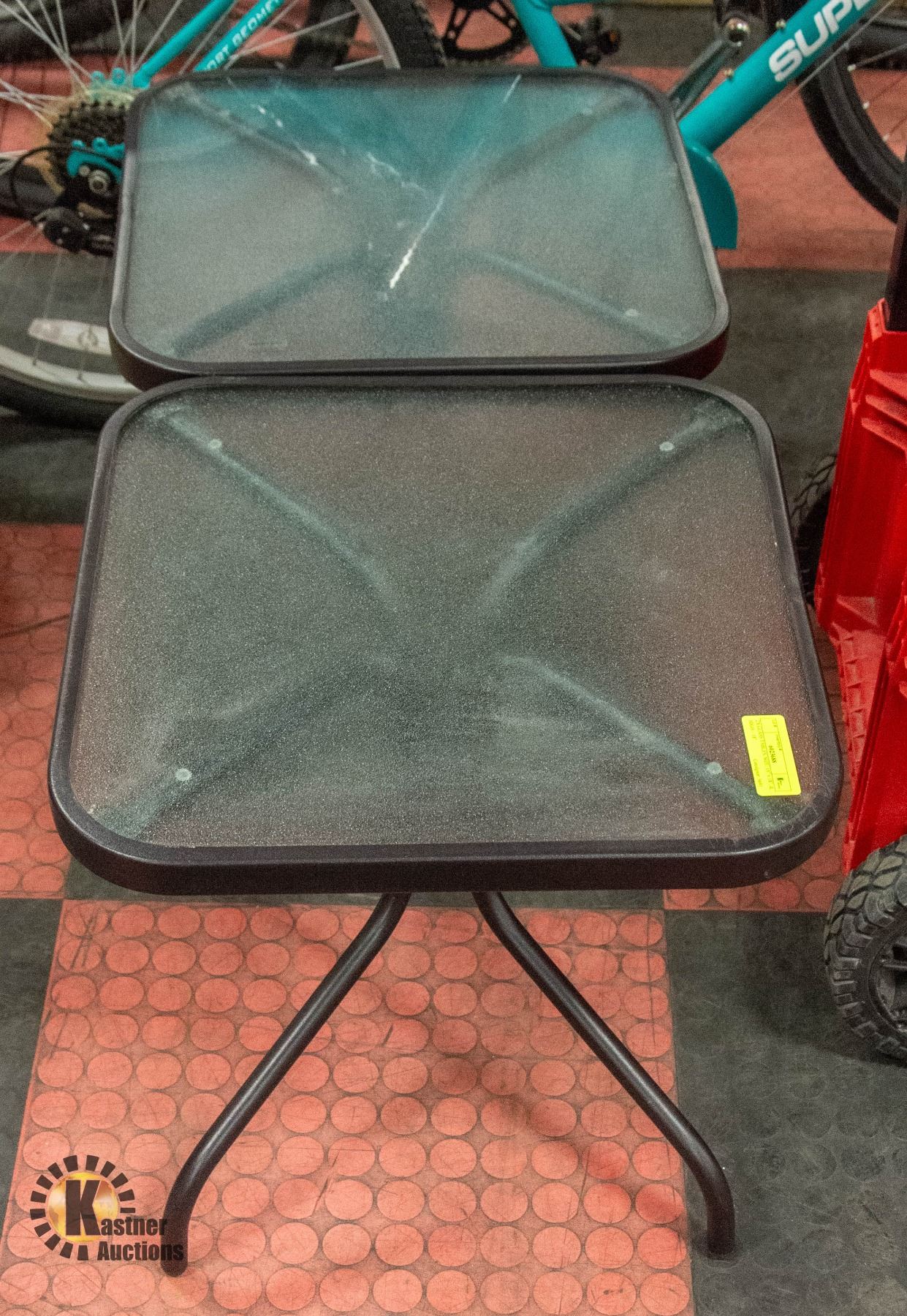 2 GLASS TABLES, SIZE: 18” X 18” H-18”
