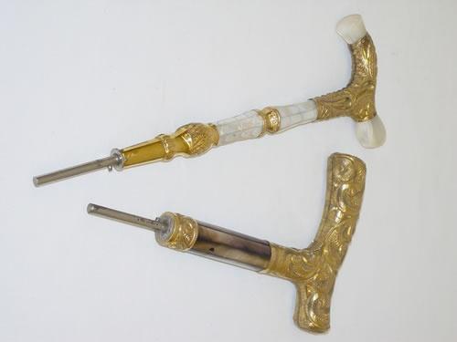 (2) GOLD & MOTHER OF PEARL CANE HANDLES: (1) 10" & (1) 8" - UNTESTED (PROBABLY GOLD FILLED), NO MARKINGS, MINOR IMPERFECTIONS