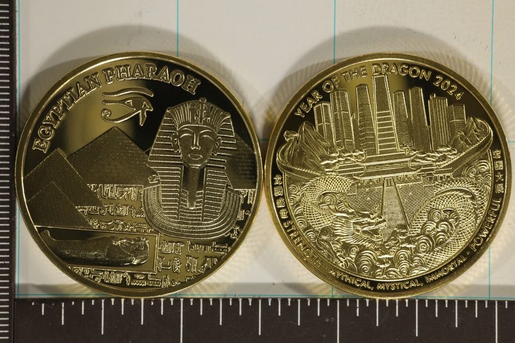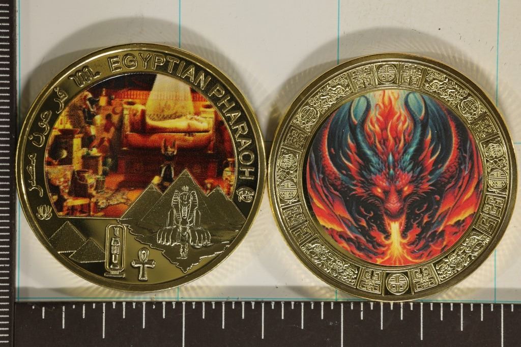 OBVERSE, EGYPTIAN PHARAOH'S AND YEAR OF THE DRAGON, BOTH IN HARD PLASTIC CAPSULES