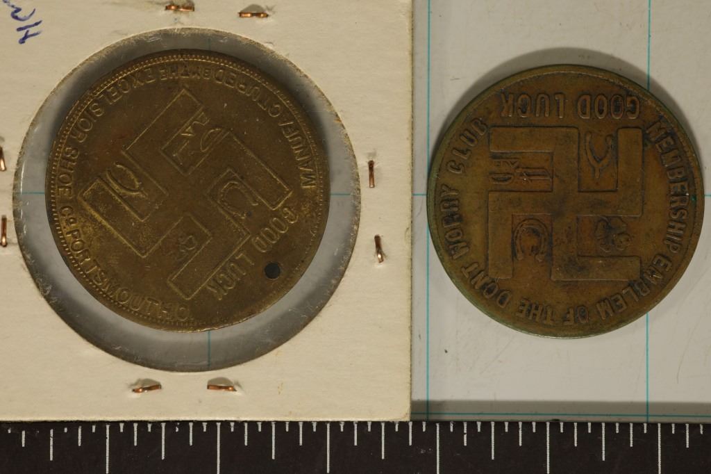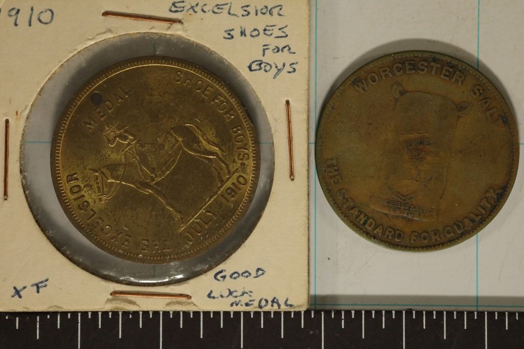 EXCELSIOR SHOES FOR BOYS WITH HOLE AND WORCESTER SALT WITH WHAT LOOK LIKE SWASTIKAS BUT ARE REVERSED AS IT USED TO BE A SYMBOL OF GOOD LUCK.
