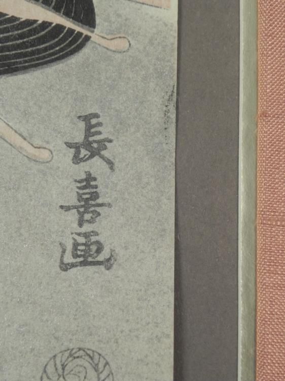 This is a portrait of 2 Geisha, done in the style of master woodblock artist Utamaro. The figures have traditional a traditional look, and the background has a silver sheen. * * * * Medium: Woodblock on rice paper * Circa 1940's * Image size: 9 3/4 x 14 3/4 inches * Framing: On olive green backing with gold foil trim, matted in mauve linen matte, in gold chrome metal frame * Frame size: 17 1/4 1/4 x 22 1/4 inches * Condition: Excellent