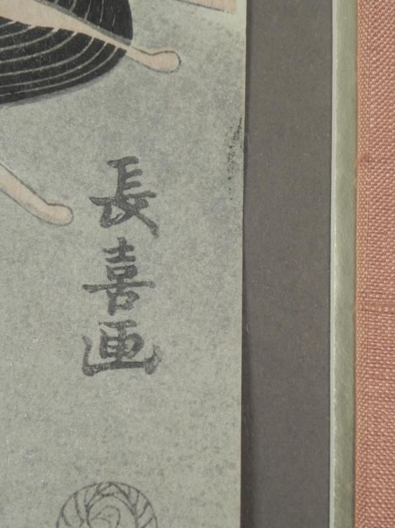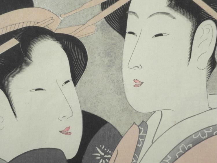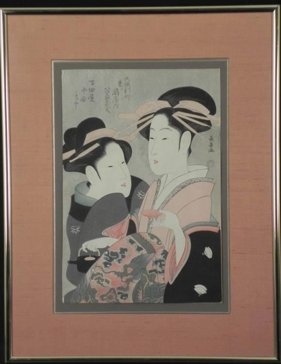 This is a portrait of 2 Geisha, done in the style of master woodblock artist Utamaro. The figures have traditional a traditional look, and the background has a silver sheen. Medium: Woodblock on rice paper Circa 1940's Image size: 9 3/4 x 14 3/4 inches Framing: On olive green backing with gold foil trim, matted in mauve linen matte, in gold chrome metal frame Frame size: 17 1/4 1/4 x 22 1/4 inches Condition: Excellent