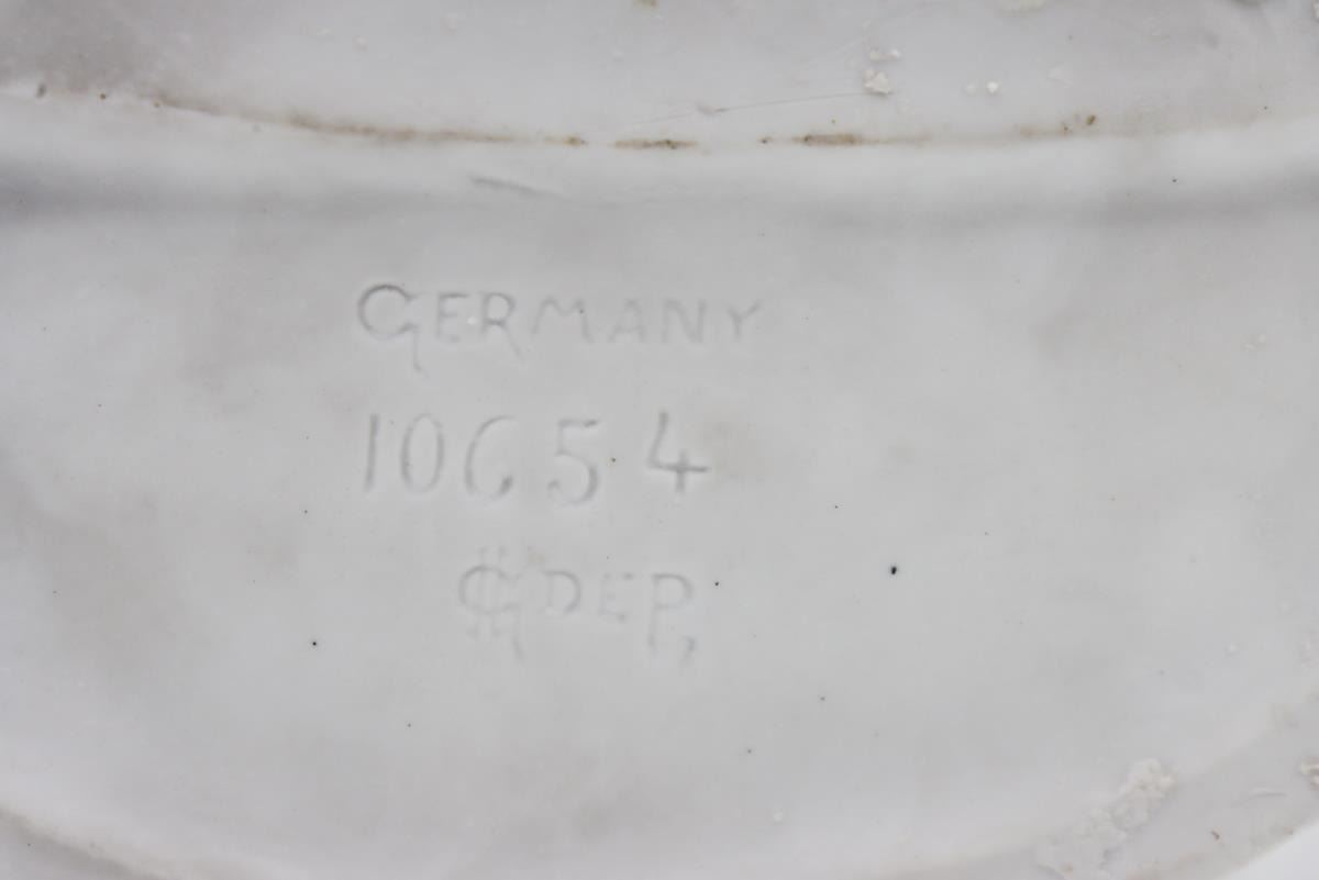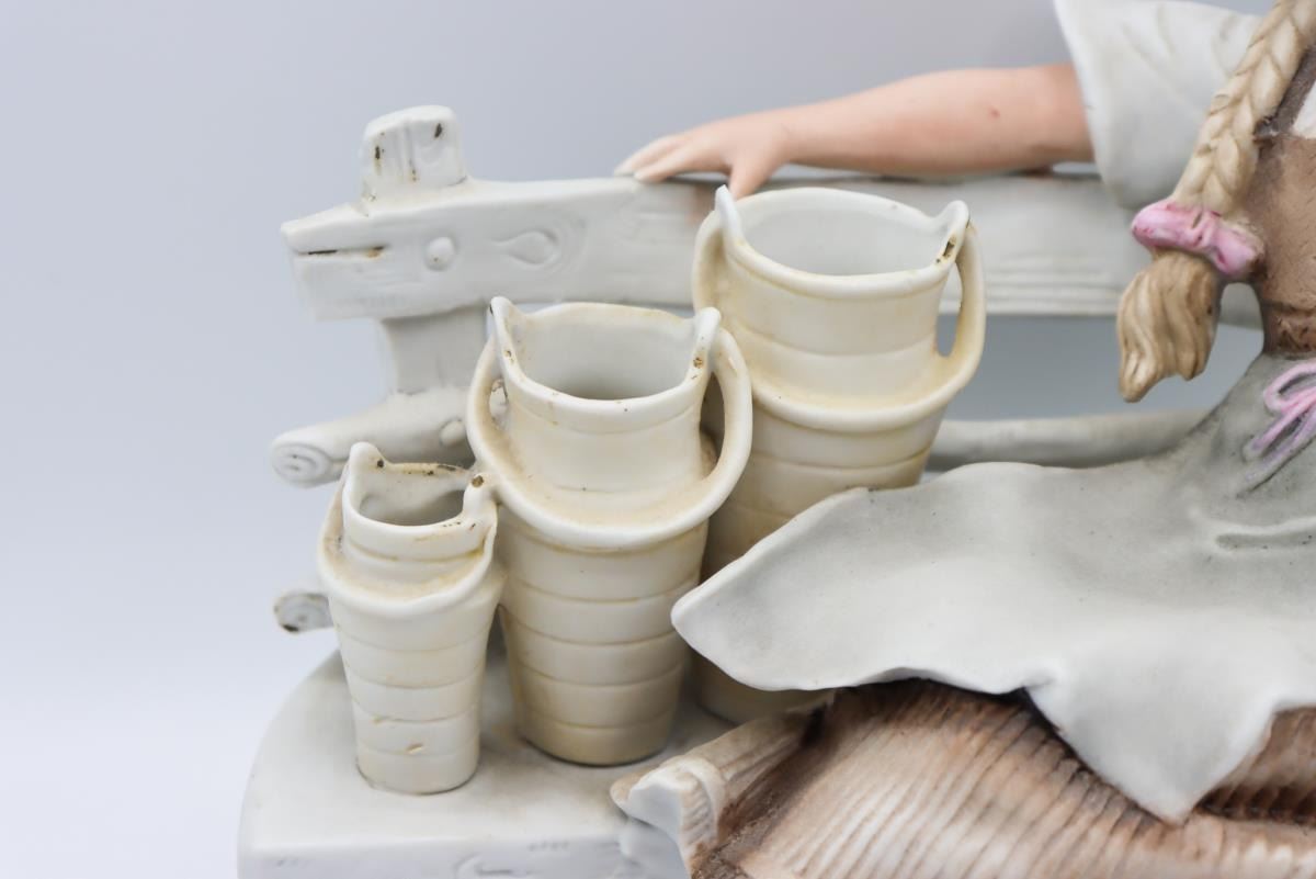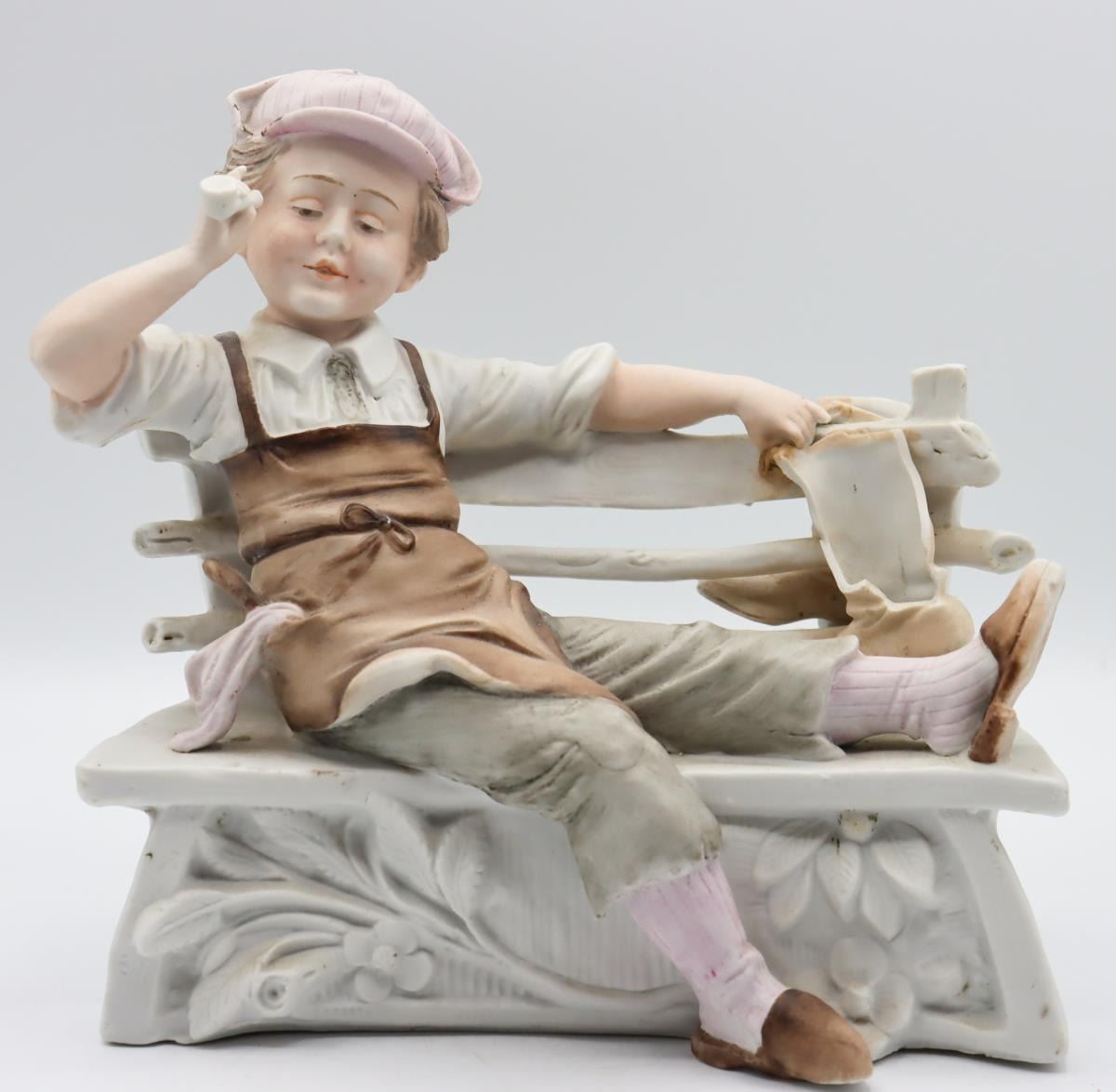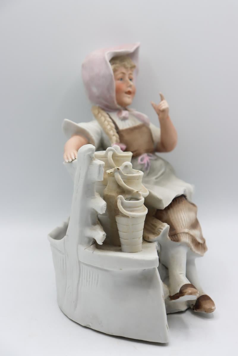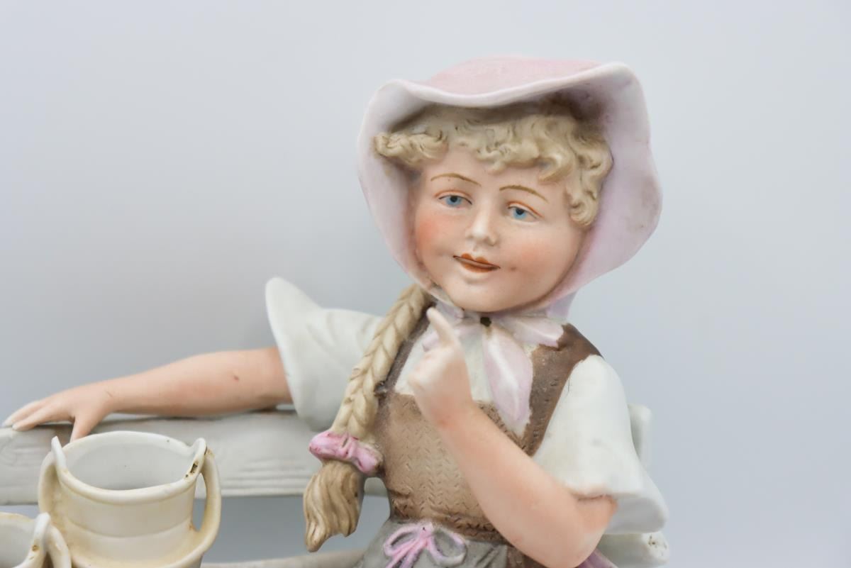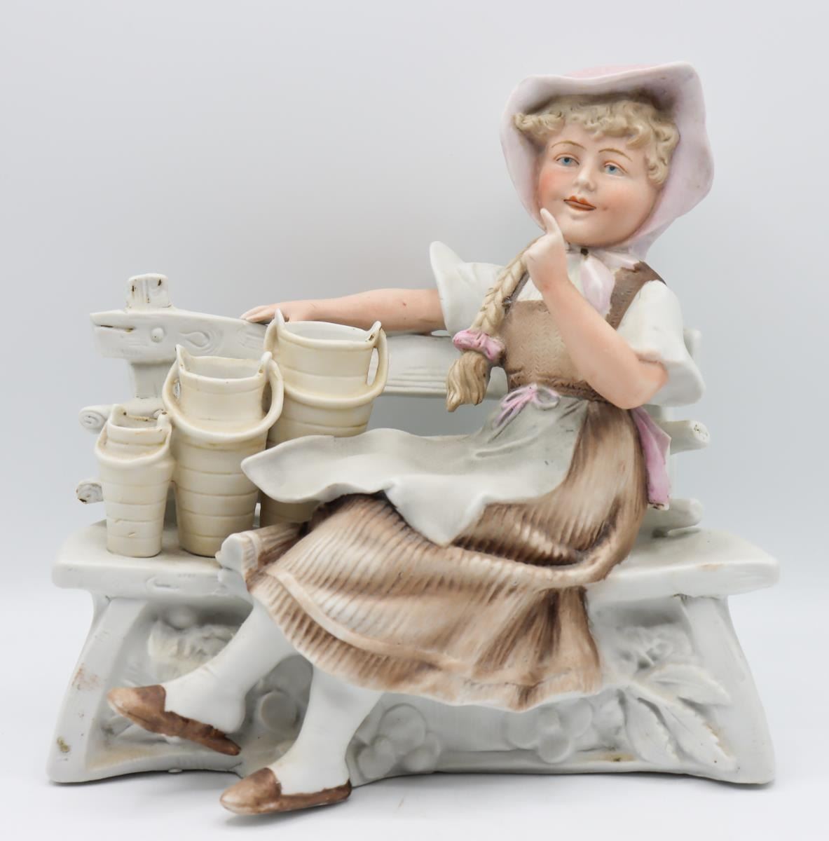 Porcelain figurines from Germany, one is a milkmaid, the other a workboy with apron. German maker's mark on bottom.