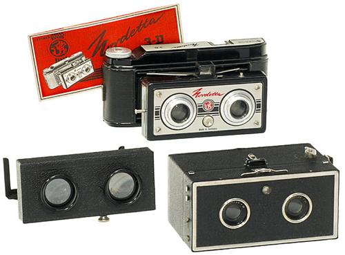 2 deutsche Stereo-Kameras 1) "Eho Stereo Box", 1933, EHO, Dresden. Für 60 x 60 mm auf Rollfilm 120, Eho "Duplar 11/75", Fixfocus-Objektive, schöne klassische Stereo-Box mit Brillant- und Rahmensucher sowie 2 Wasserwaagen. Komplett mit Eho Stereobetrachter, Anleitung und Karton. Tolles Set! (1-/2) - Und: 2) "Nordetta 3-D", 1951, Vredeborch, Nordenham. Für 40 x 60 mm auf Rollfilm 127, f 11/80 mm Fixfocus-Objektive. Besonders dekorativ durch die sichtbaren Balgen! Komplett mit Anleitung und Karton! (2/2)