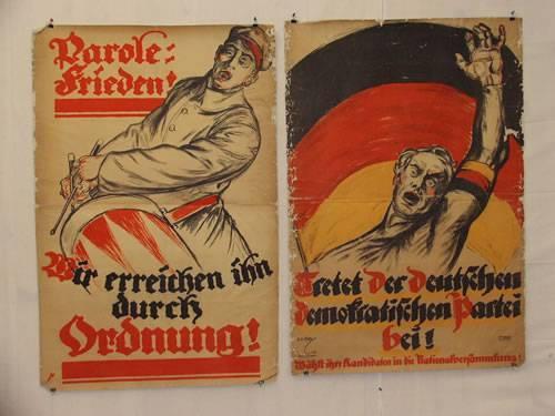 2 German WWI "Reconstruction" Posters: "Gertet Der Deutschen Demokratischen Partei Bei! etc.", Artist-A.M. Cay-1918, Printer-Hollerbaum and Schmidt-Berlin, Together w/ "Darole Frieden! etc.", Artist-Not Provided, Printer-Not Provided, Both Approx. 55" x 37", Condition – Poor/Fair: Folding, Corner and Compression Creases, Splits, Border Tears, Wrinkling and Losses, Soiling; Linen Backed,