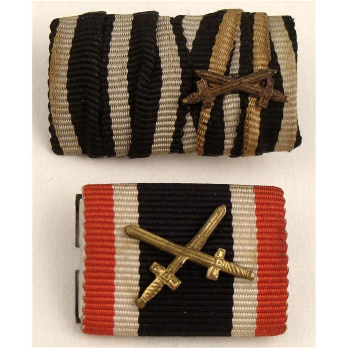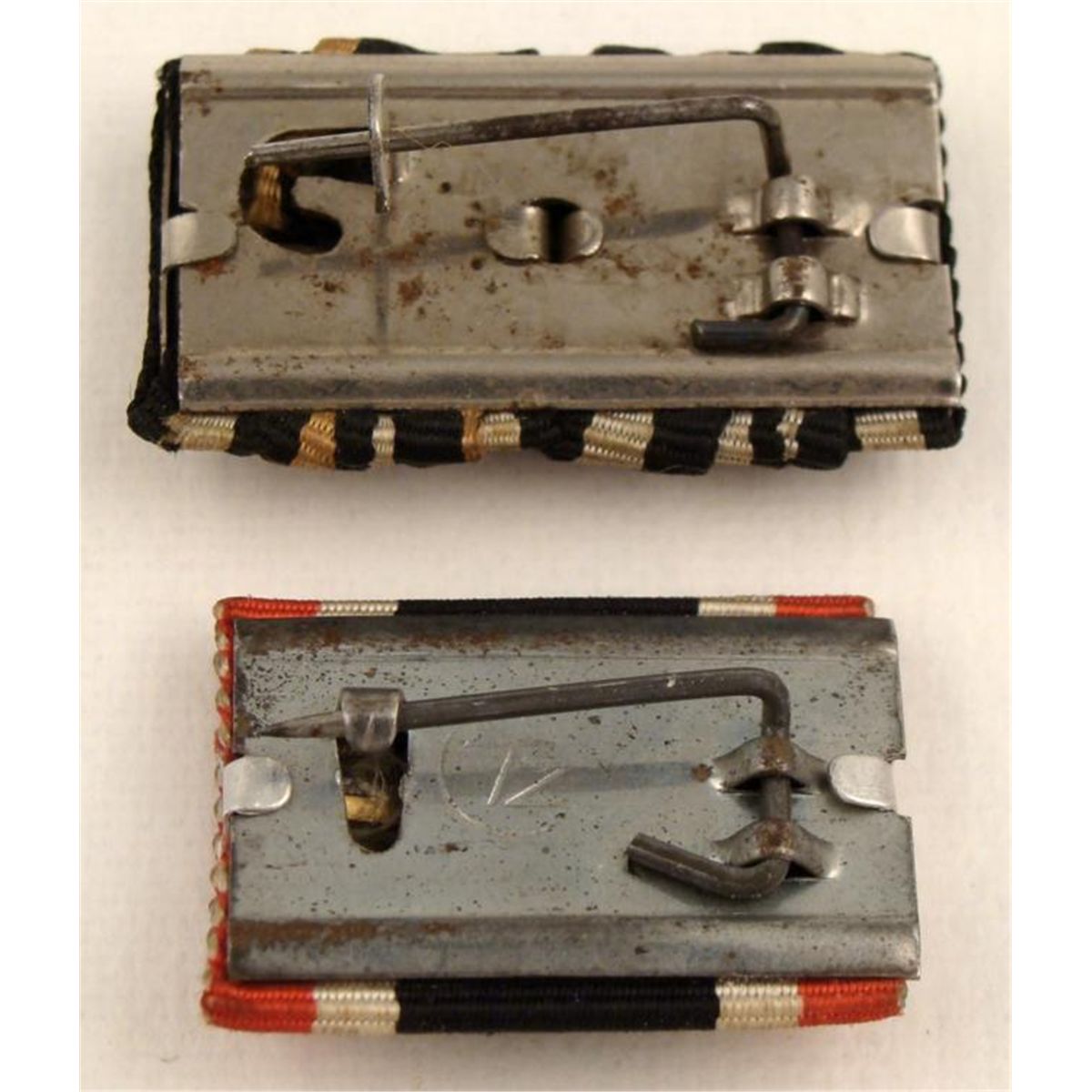 These are two original WWII era Merit Crosses. Both fabric covered, with metal crossed swords. The widths measure 1" and 1 1/4". The mark on back of the small one is TZ. It is in very good condition with full pin, and has some surface wear.