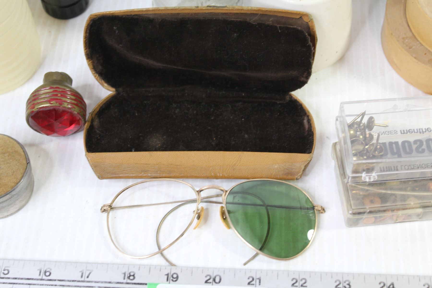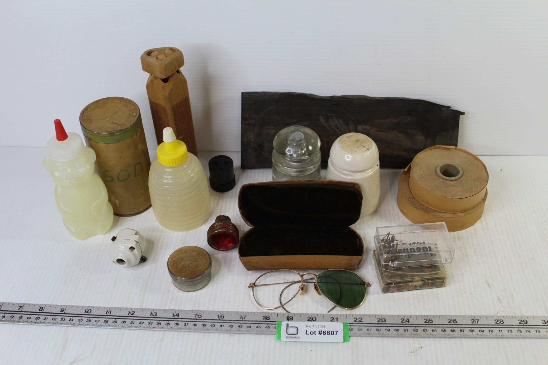 (2) Glass Insulators - Sunglasses - Vintage Containers - Paper Tape