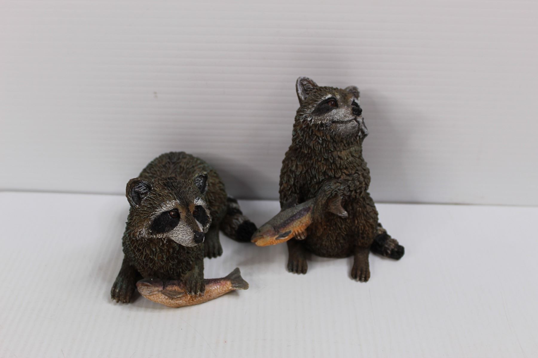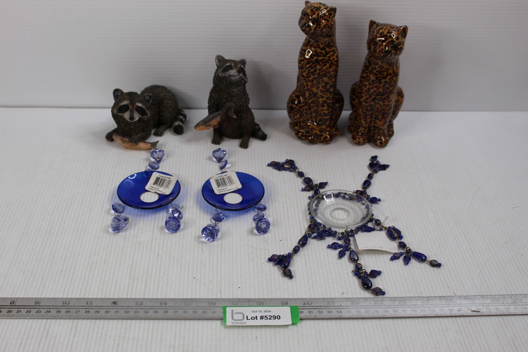(2) Glass Leopard ornaments, (2) Racoon Ornaments, (3) Pieces or Candlestick Decor