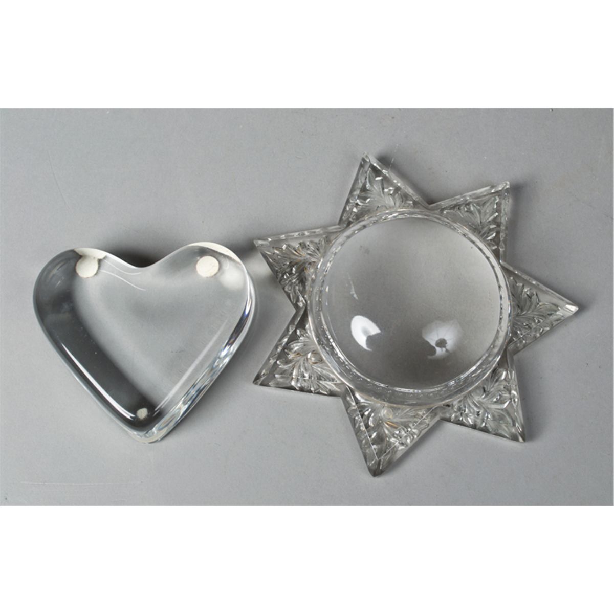 To include a heart shape glass paperweight, Baccarat signed. Together with a antique glass moon and star shaped paperweight apparently unsigned. Largest 6" W. Private collection Frasier, MI.