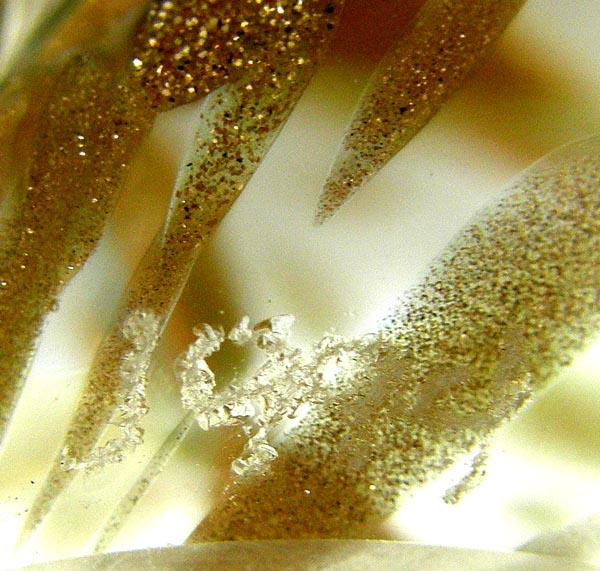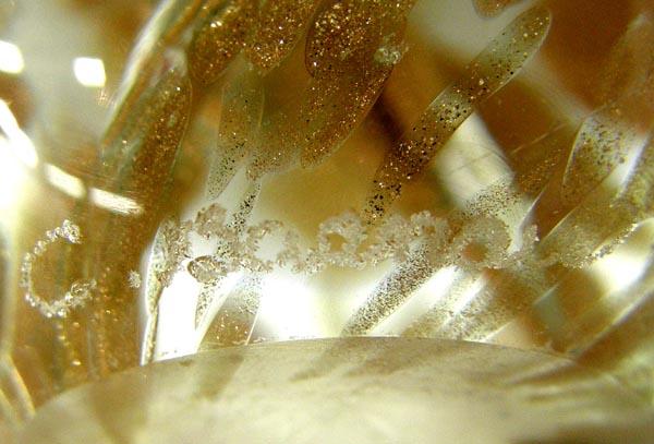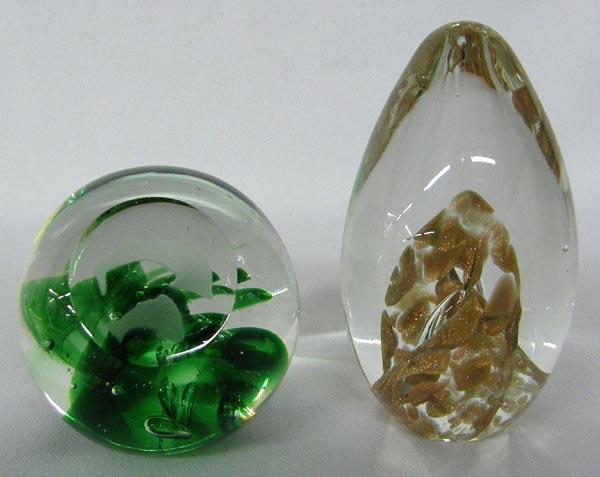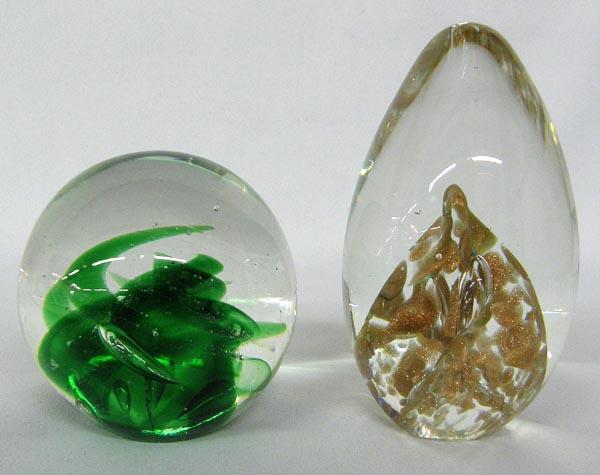 2 Glass Paperweights, 1 is egg shaped with swirls of metallic gold USA Fayetteville AR etched on bottom C. Baanau 1994 and the other one is clear glass with green wavy swirls and etched dolphins on top, largest measures approx. 3.5'' x 2.25''. SHI $25.