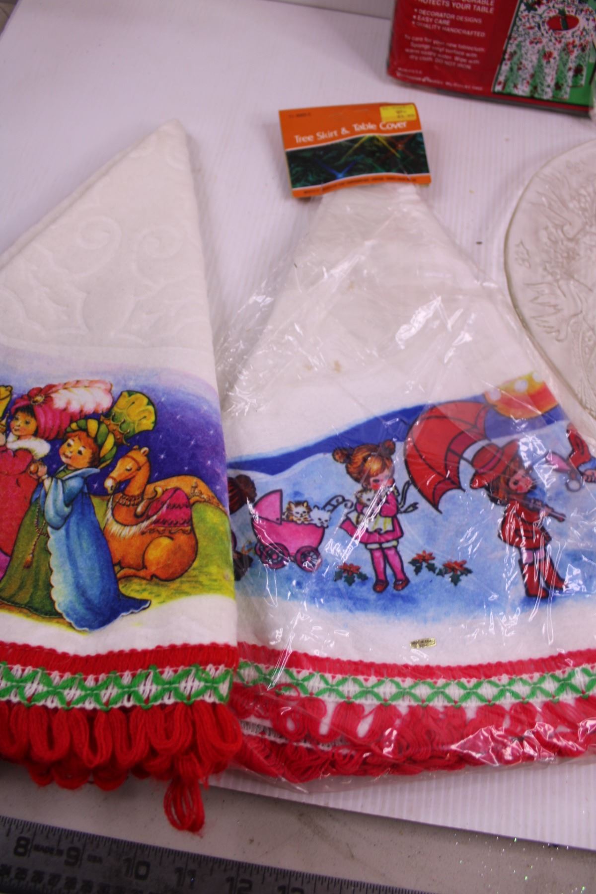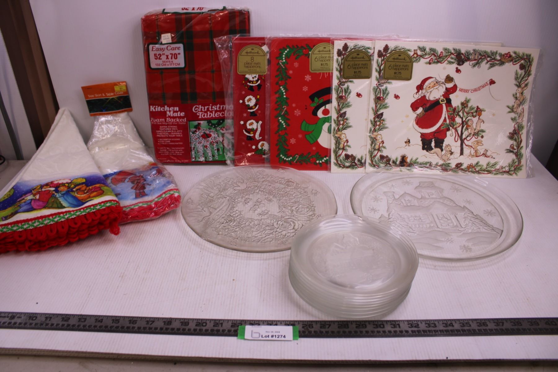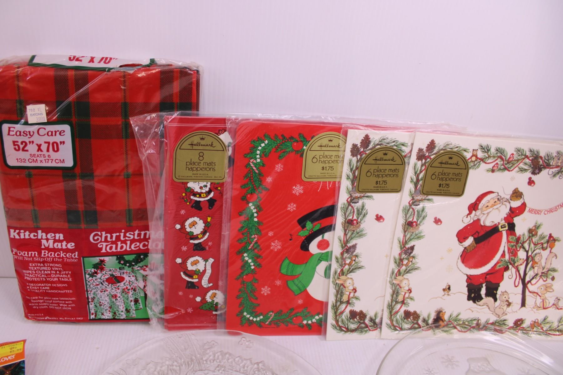 (2) Glass Serving Platters, (8) Glass Plates, (2) Tree Skirts, Placemats (NIB), Tablecloth (NIB)