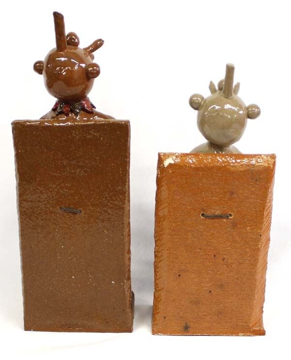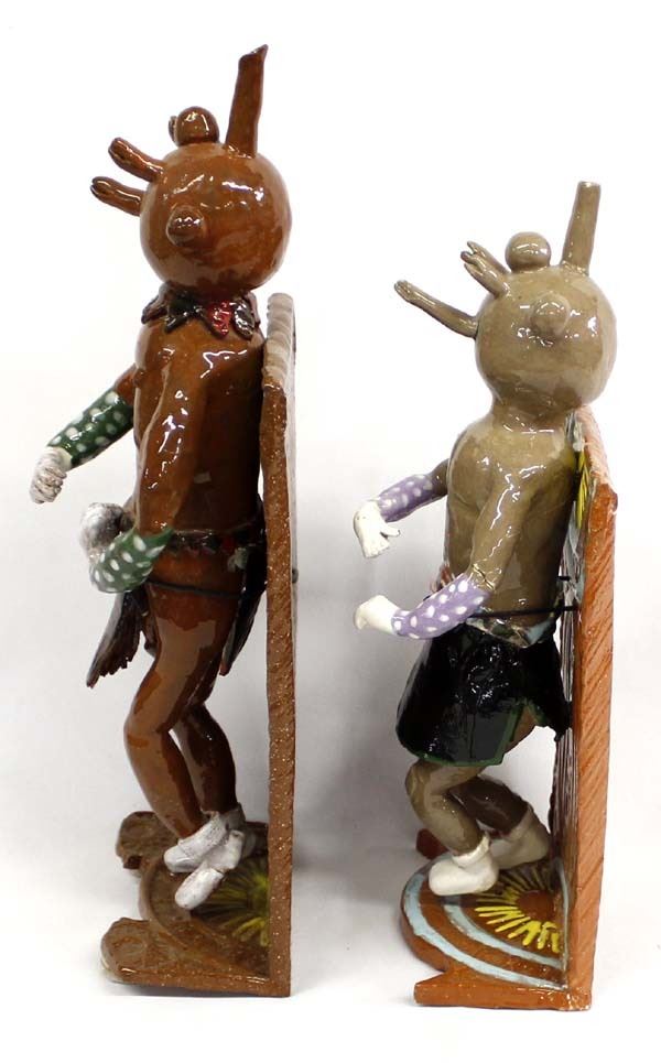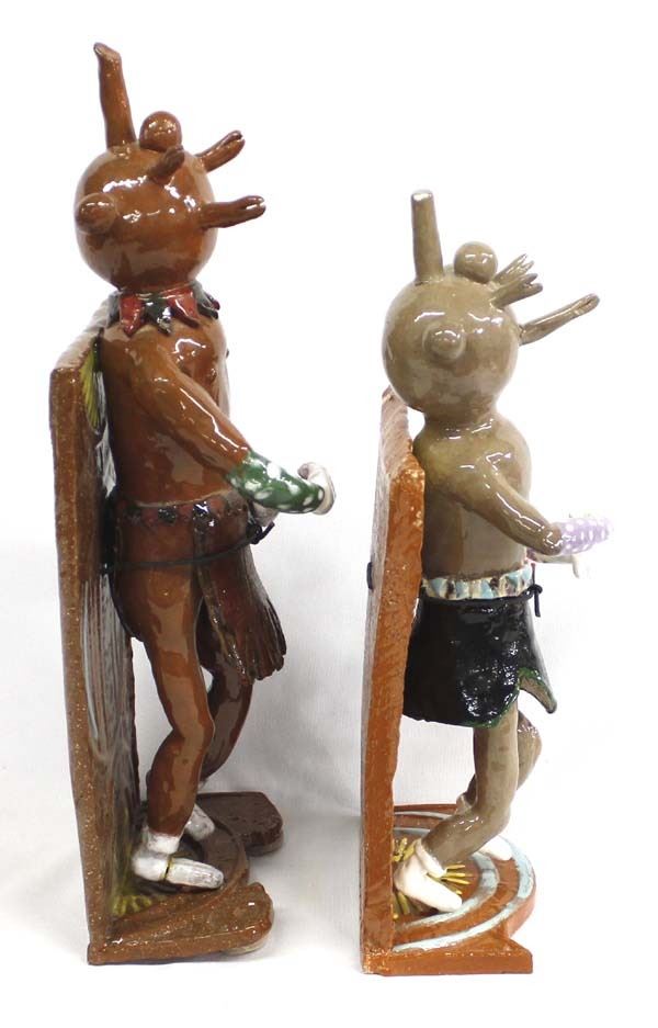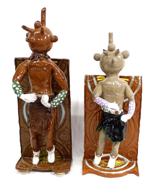 2 Glazed Slab Pottery Mudhead Kachinas by T. Mulenex, both are signed on the bottom, measure 16.5'' x 6'' x 4.5'', the one with the gray body's topknot and left arm has been glued as well as his right eye