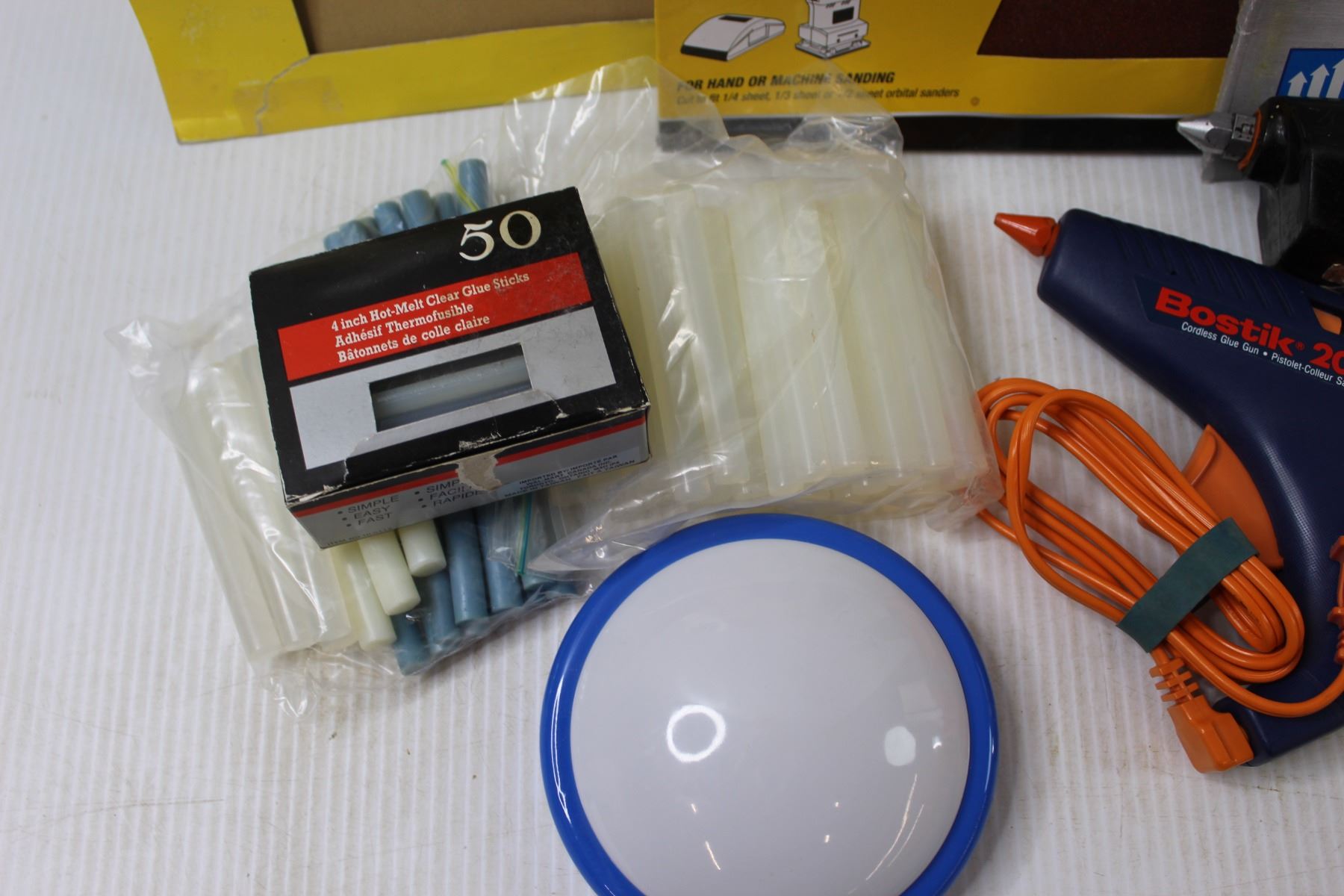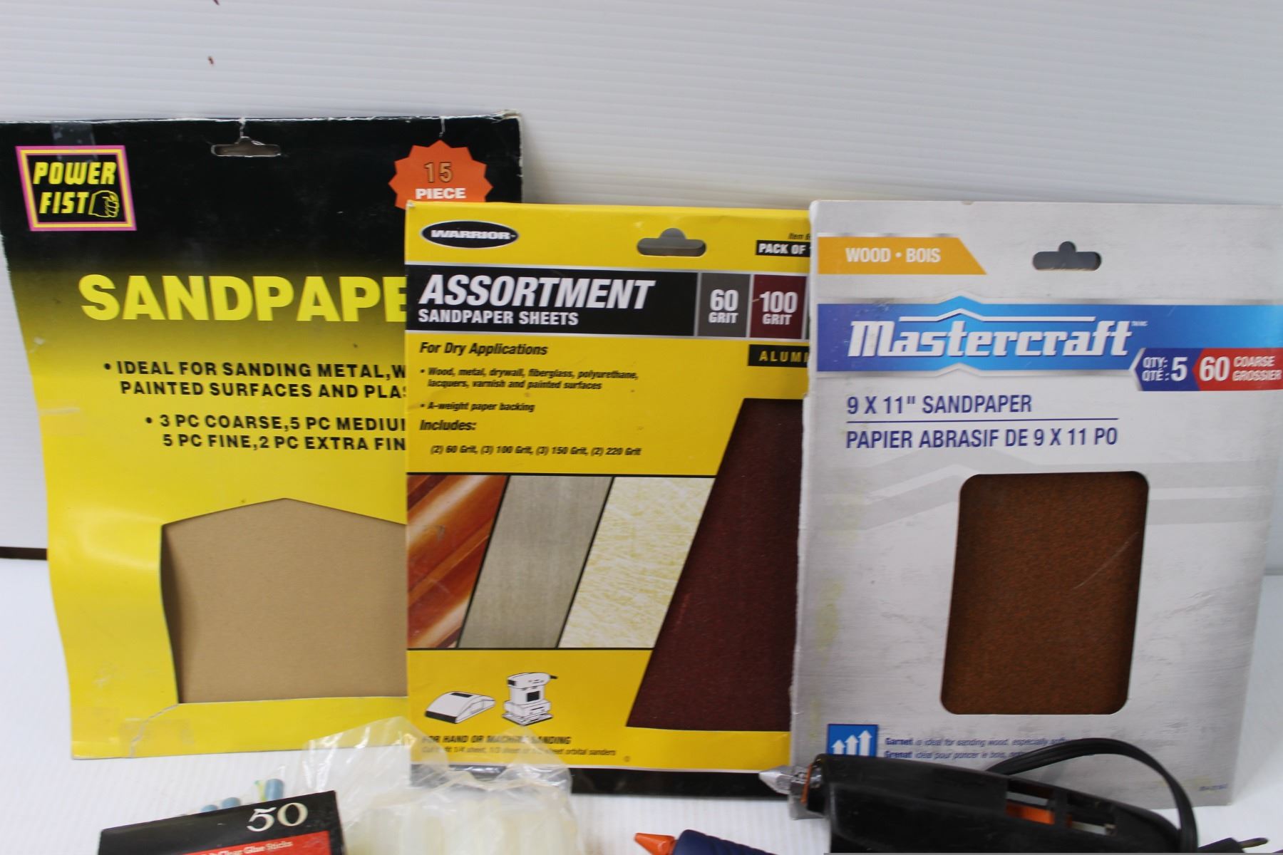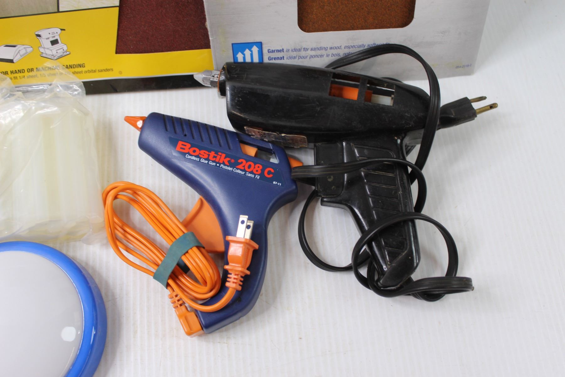 (2) Glue Guns, Glue Sticks, (3) Sand Paper