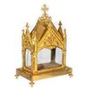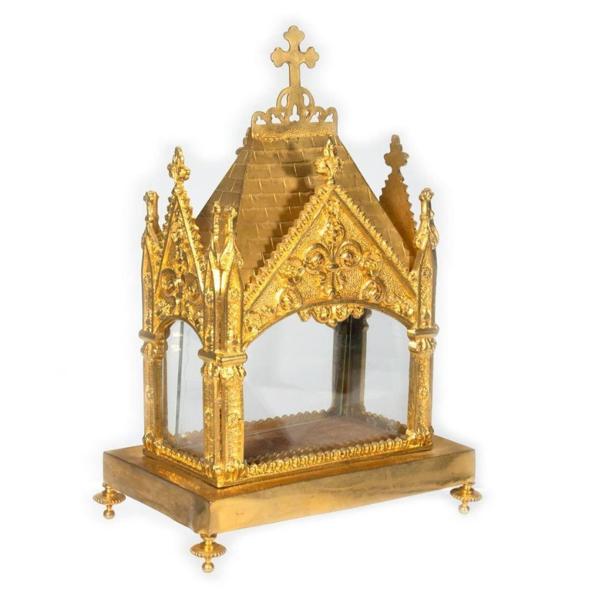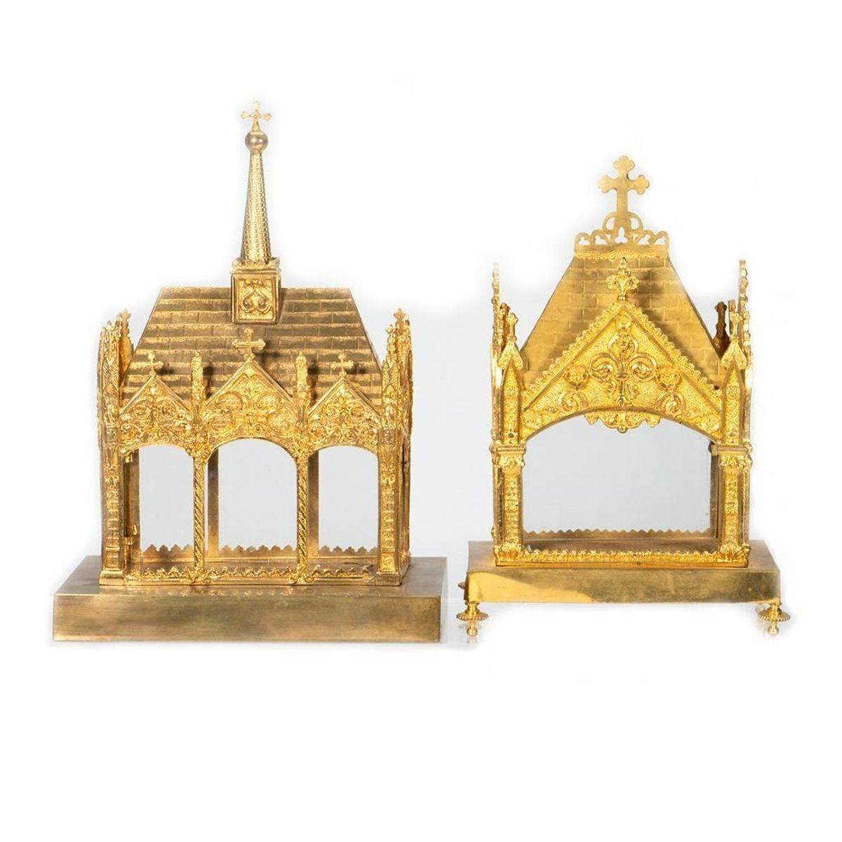 Each glass-sided box with roof-form lids; one on a footed base. 10in. x 7in. x 4 1/2in. and 9in. x 5 1/2in. x 3 1/2in. Good condition, light wear.