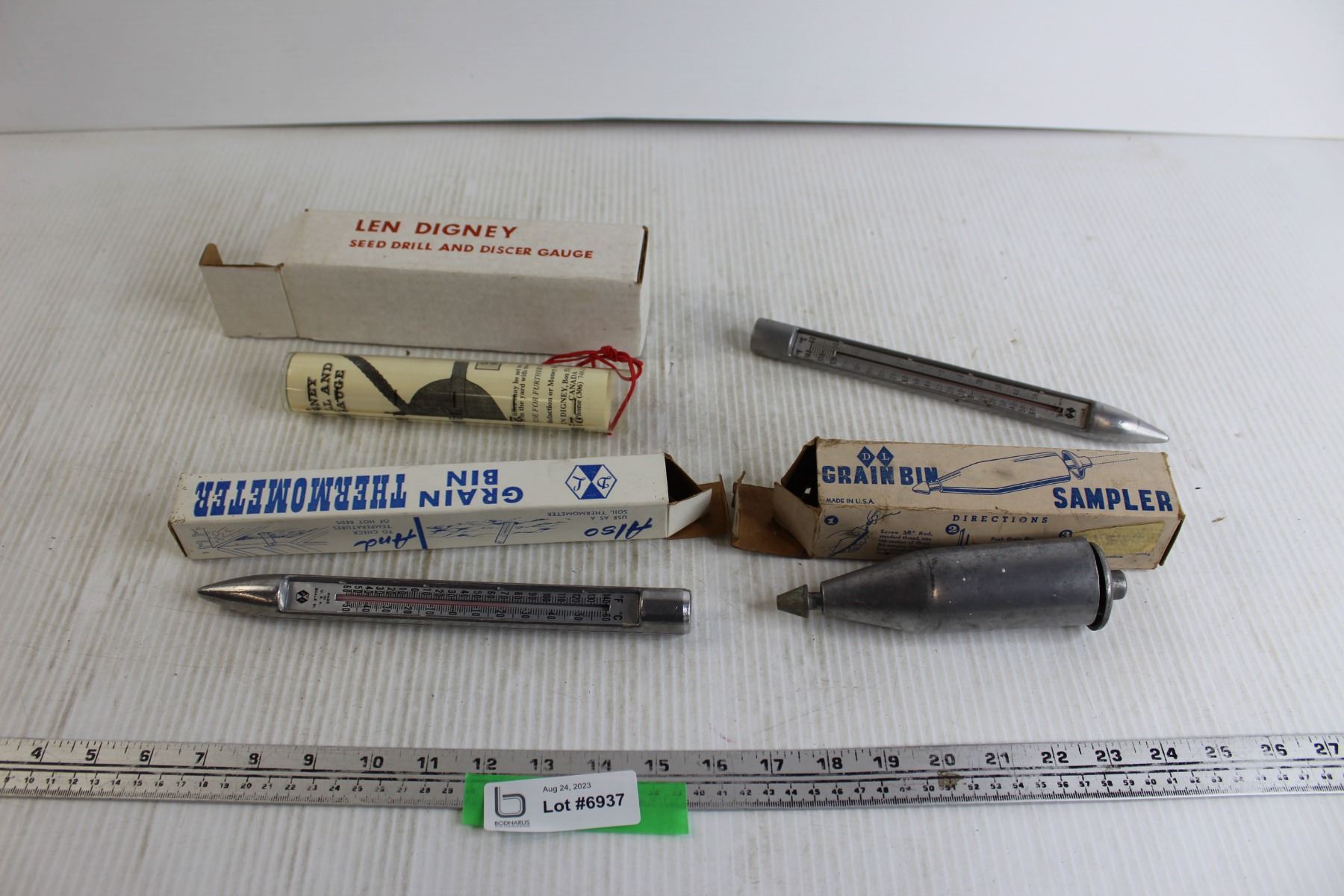 (2) Grain Bin Thermometers, Seed Drill and Discer Gauge, Grain Bin Sampler (3/4 Items in Box)