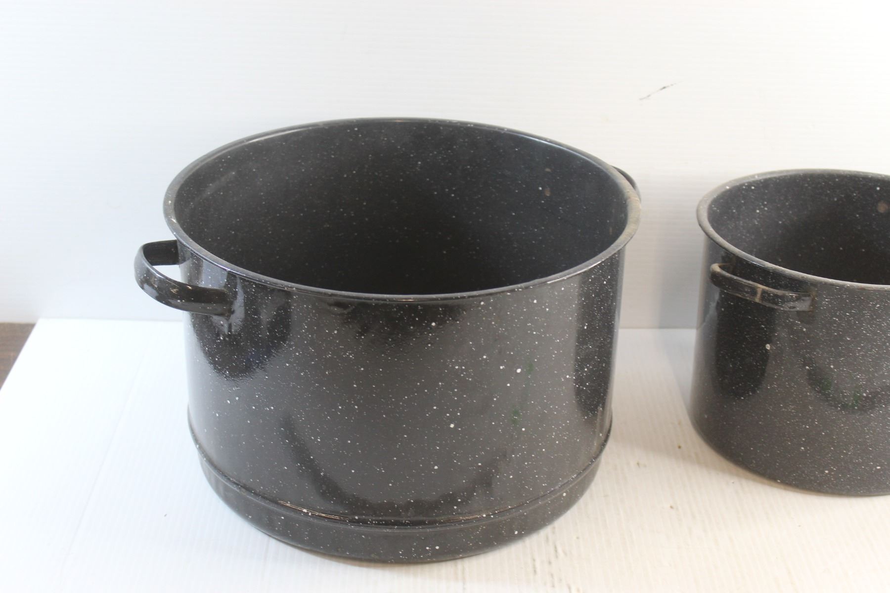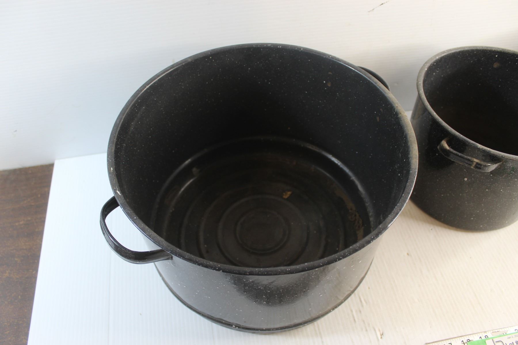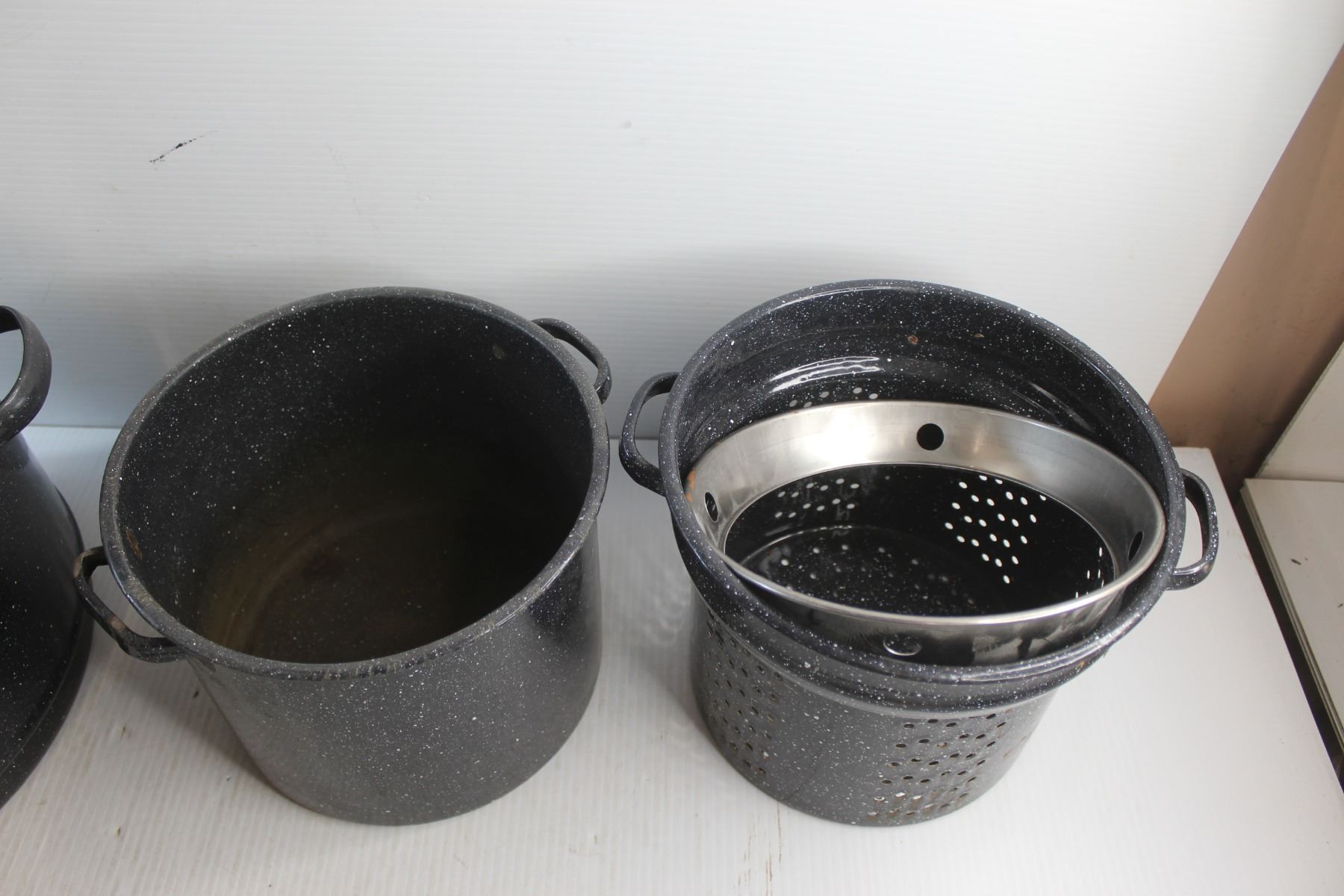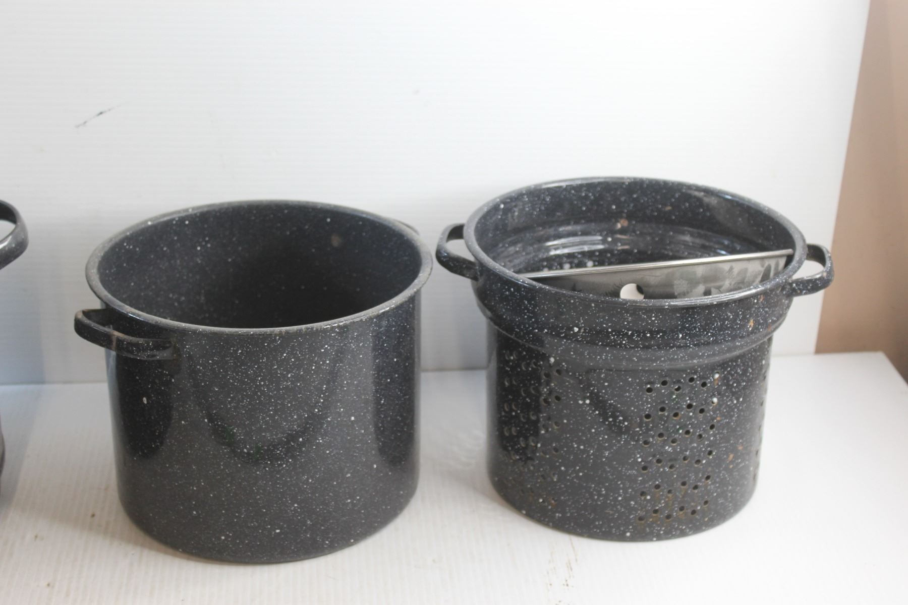 (2) Graniteware Pots and a Strainer Insert