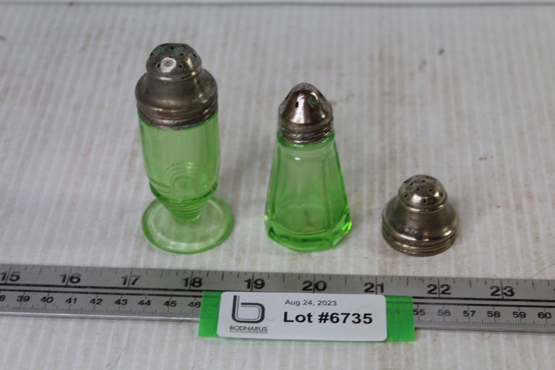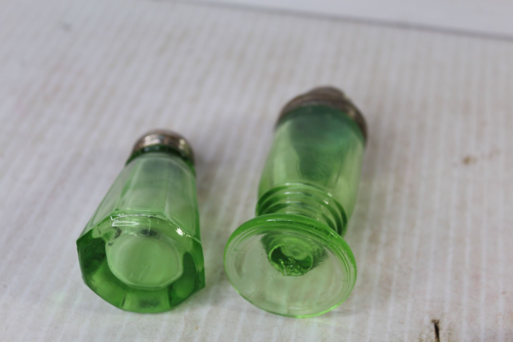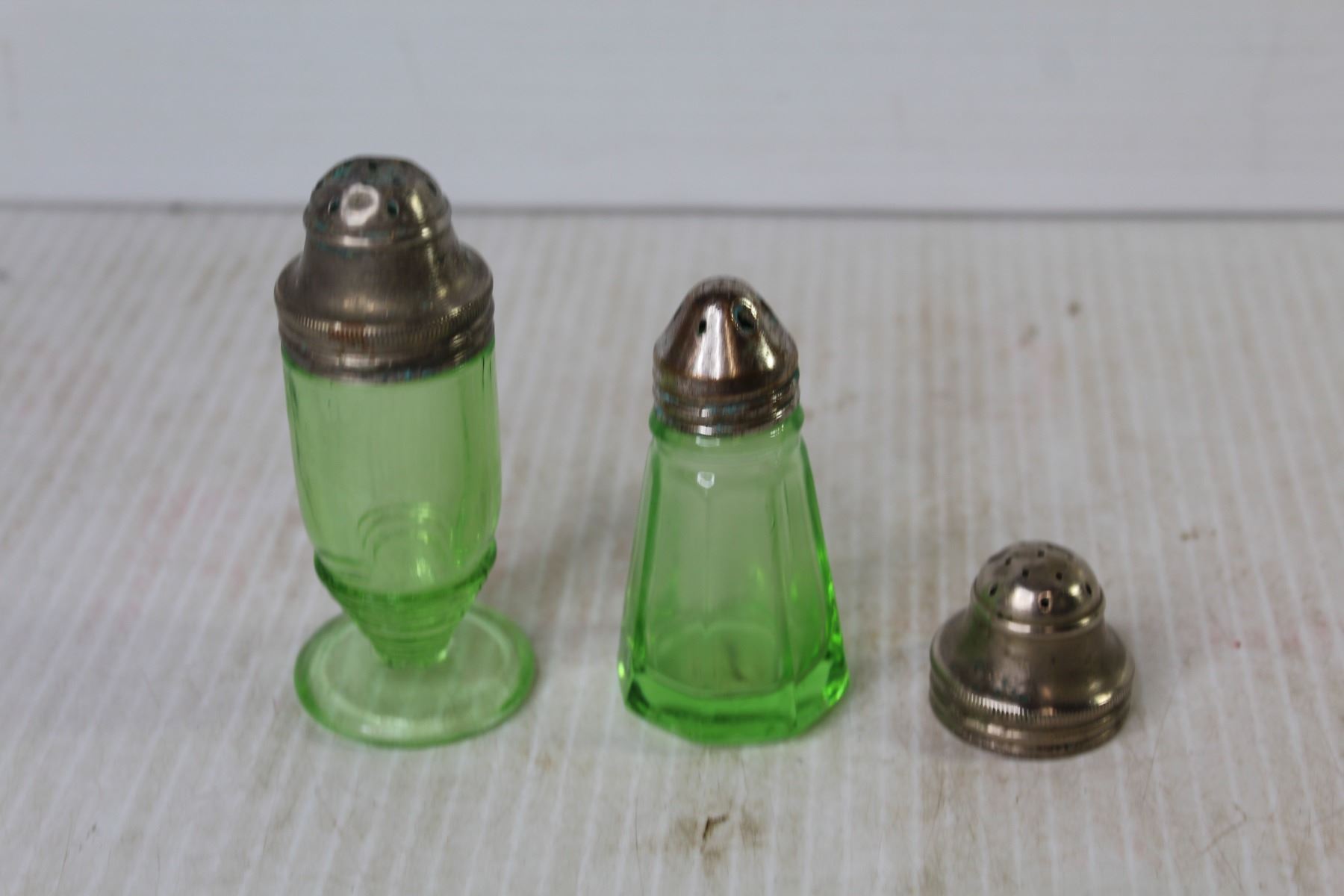 (2) Green Depression Glass Salt & Pepper Shakers - Extra Lid