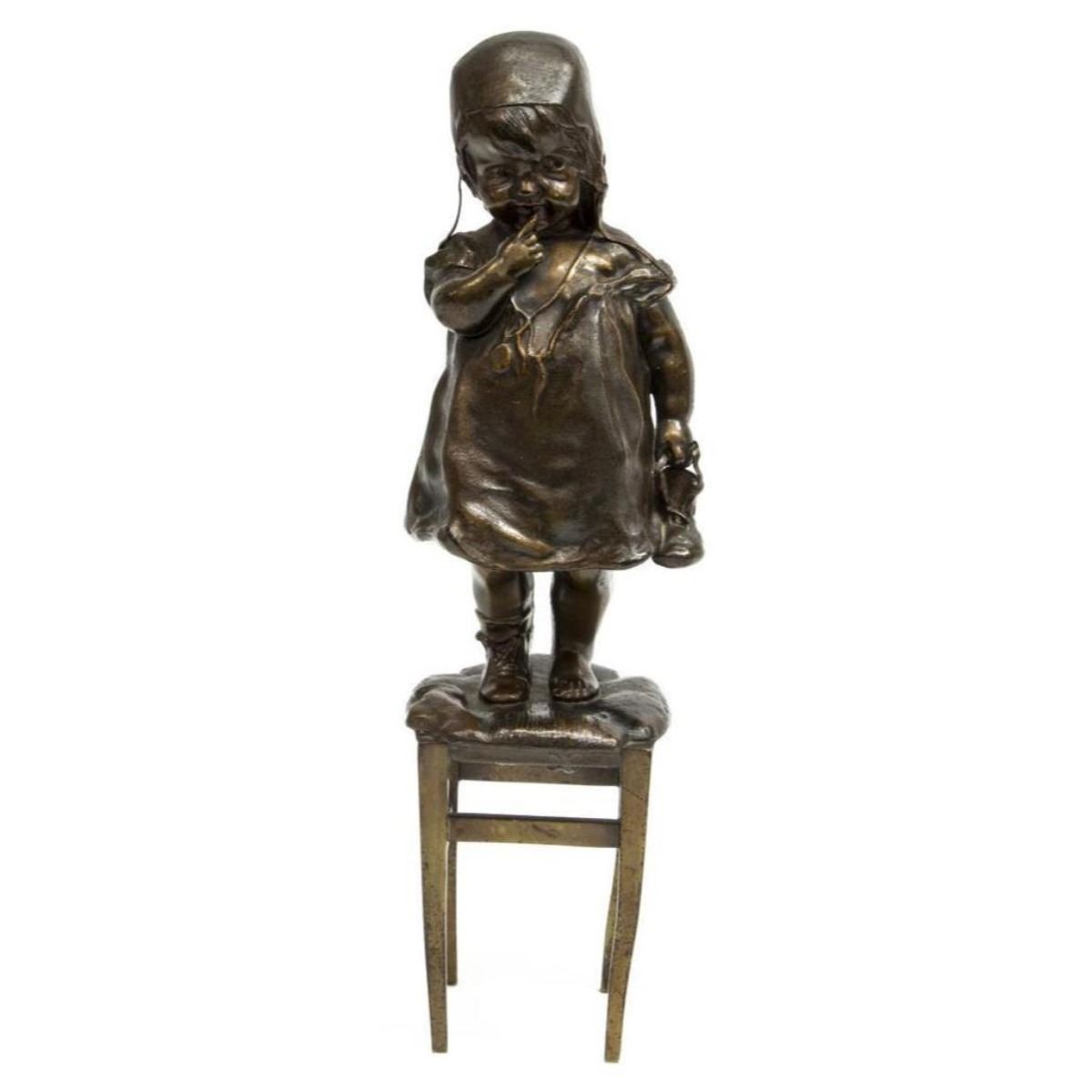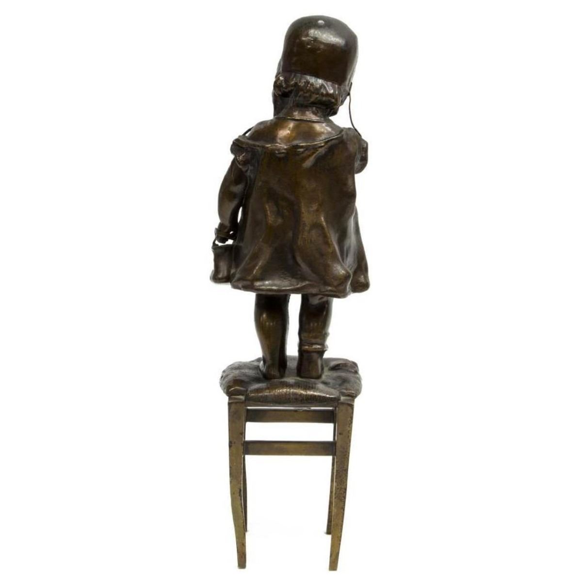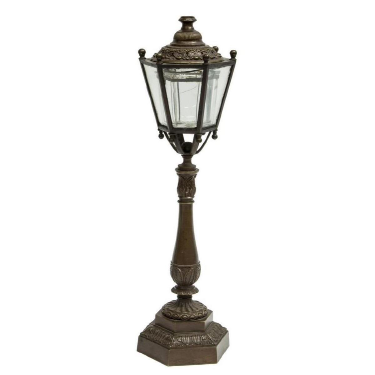 lot of 2) Group of bronze items, including: (1) figure, Young Girl on Stool, after Juan Clara Ayats (Spain, 1875-1958), approx 13.5"h, 4"w, 4"d; (1) table top cigar lighter, in the shape of a street lamp, having a removable glass oil reservoir, crack to glass, approx 12"h, 3.75"diam; 7.5lbs . - 10624-052018-LA-03296