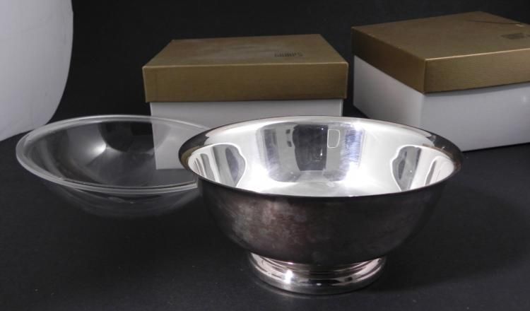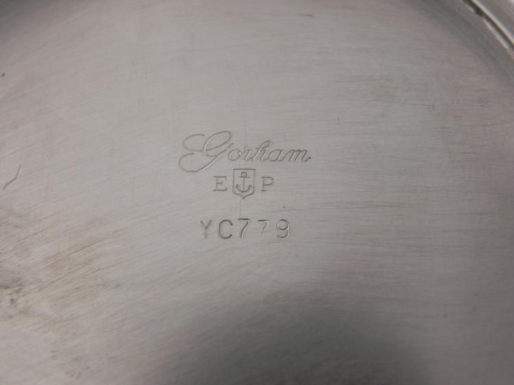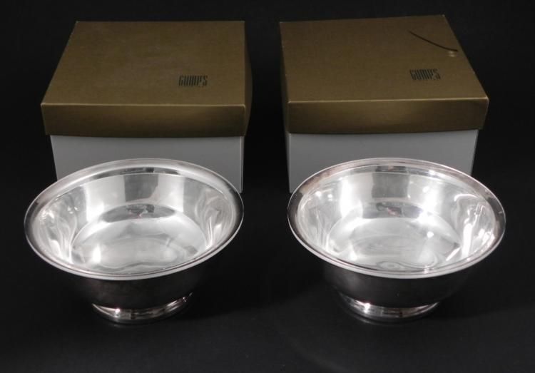 These are too matching Gorham silverplated bowls from the esteemed Gumps of San Francisco. Each is in excellent condition, and comes in the original box (one box has a marker mark on top). Each bowl includes a clear plastic insert that fits over the inside. The undersides have anchor hallmarks, and number YC779. They measure 3 x 6 1/2 inches. * It is great to find such fine Gorham in these boxes, and these are nice enough to give as gifts.