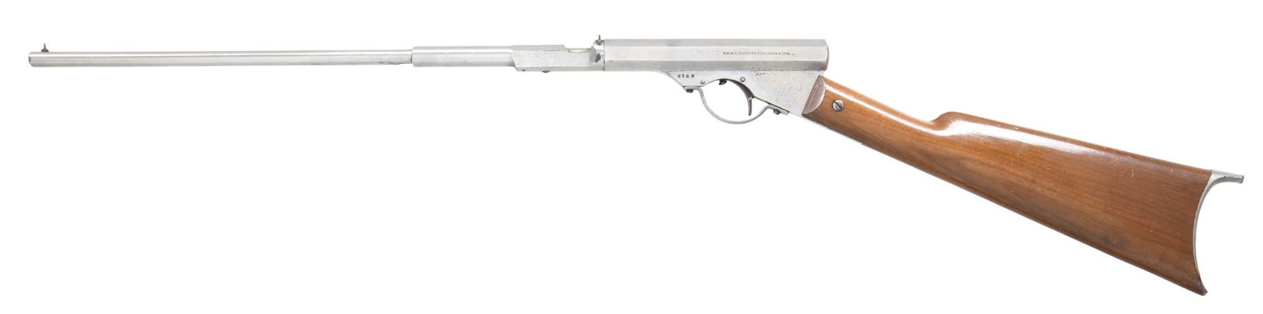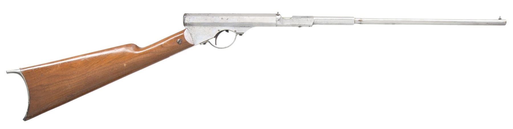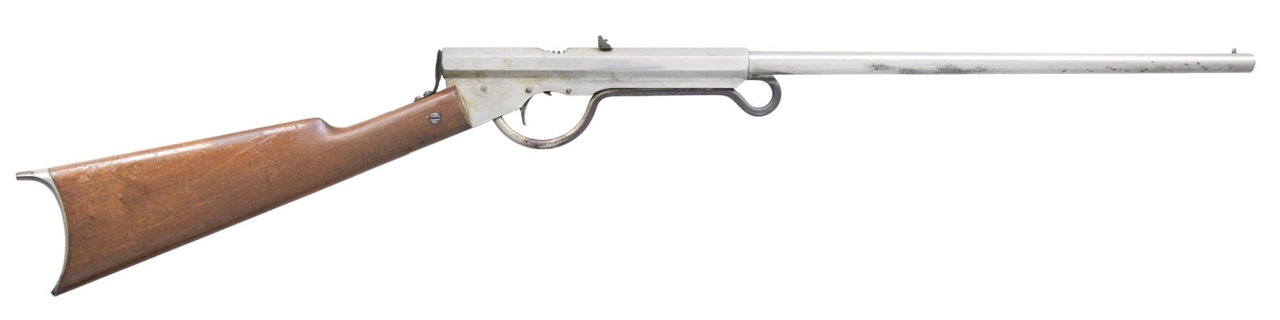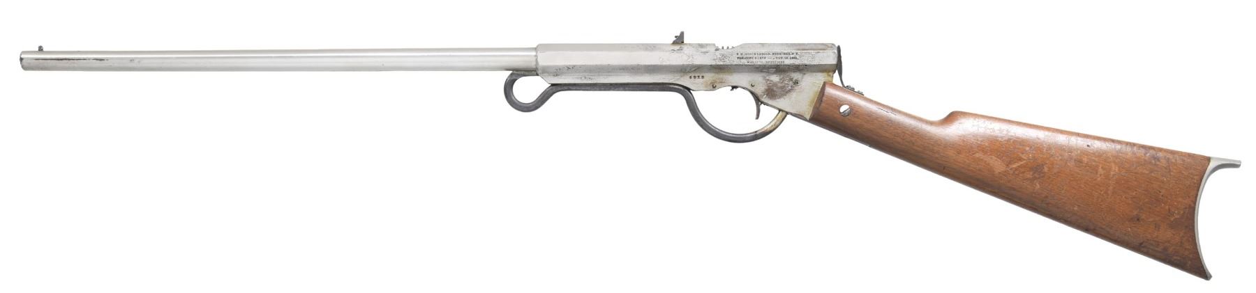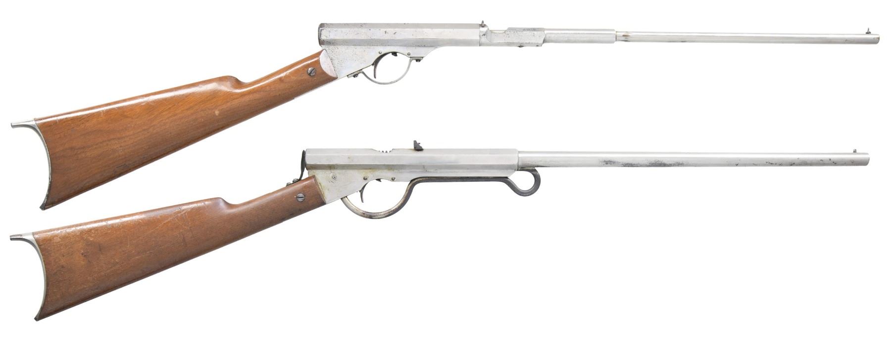 ALL: Cal. 21. Spring pistol actions. Nickel finish. Walnut stocks w/ crescent buttplates. 1) MODEL 1. Cal. .21. S# 4146. Barrel 16.25" smoothbore. CONDITION: Action spring is missing. Good nickel with pinprick patina & deep marks throughout. Wood has good finish with deep handling marks. Fair bore. (02-23812/MD). 2) MODEL 2. Cal. .21. S# 5928. Barrel 18" smoothbore. CONDITION: Good nickel with fading finish on left side of receiver. Fair wood finish with spots of peeling throughout. Good bore. (02-23817/MD). $400-800.