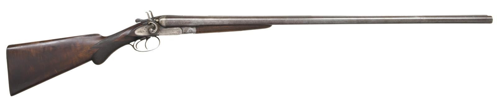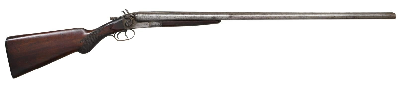 1) SPENCER GUN CO. Cal. 12 GA. S# 11990. Bbl 29 7/8". Frame is marked "Spencer Gun Co." on either side. Solid matte rib with brass bead front sight. Furniture is comprised of a checkered wood round knob buttstock and checkered splinter pattern forend. Matching numbers are present on the frame, forend iron, and barrels. CONDITION: frame retains traces of its original case color hardened finish, with the balance exhibiting a mottled gray patina. Barrels show scattered spots of dark discoloration. Bores is bright, exhibiting pitting throughout. Wood furniture shows scattered marks from handling and storage, with the buttplate bearing a minor loss at the top. (23-2006/MLW). 2) EMPIRE ARMS CO. Cal. 12 GA. S# 64771. Bbl 32". Frame is marked "EMPIRE ARMS CO." on the sides. Light scroll work is present on the sides and underside of the frame, with some light scroll engraving on the trigger guard. Barrel rib is marked "EMPIRE ARMS CO. FINE DAMASCUS". Case color hardened frame with solid matte rib damascus barrels. Bead front sight is not present. Furniture is comprised of a checkered wood round knob buttstock and a checkered wood splinter pattern forend that features a small inlaid horn tip. CONDITION: frame retains traces of its original case color hardened finish, with the balance exhibiting a gray patina with scattered areas of discoloration. Barrels are very good overall. Mirror bores. Wood furniture shows scattered marks from handling and storage, but otherwise remains sturdy and serviceable. (23-2035/MLW). ALL CURIO. $400-600.