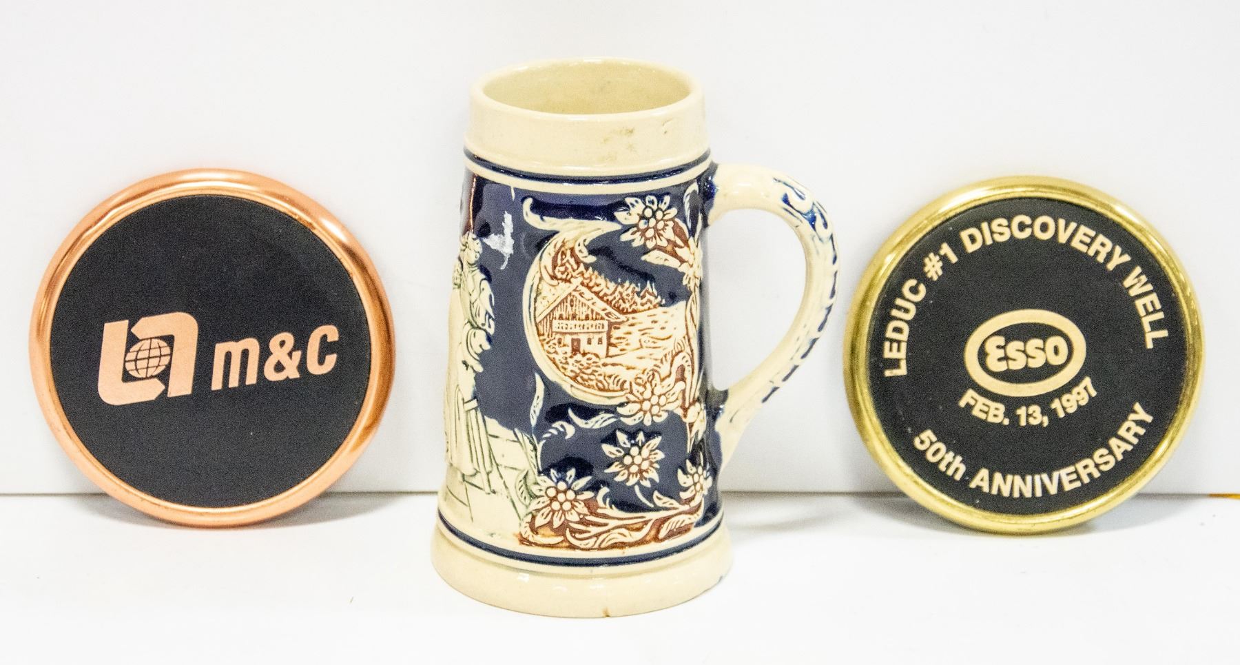 2 HEAVY METAL ADVERTISING COASTERS + STEIN STAMPED