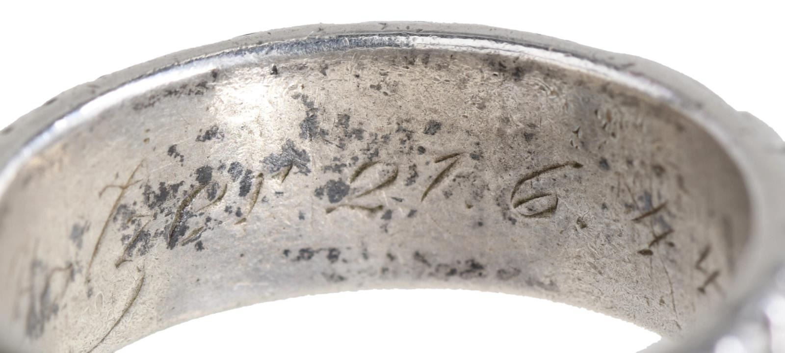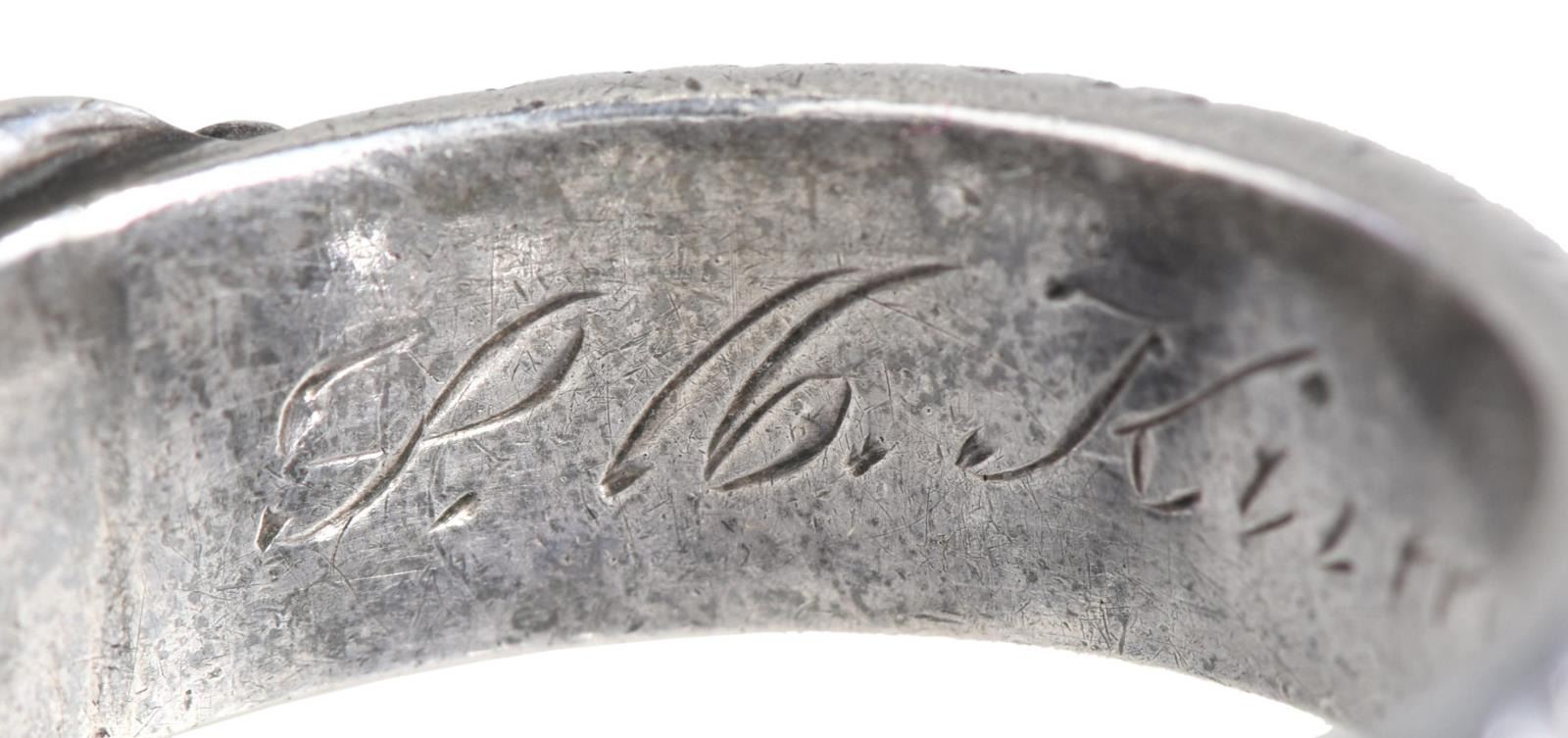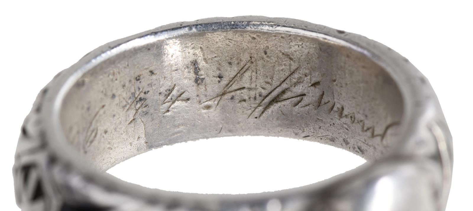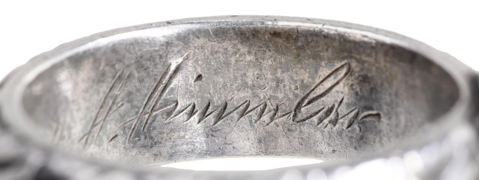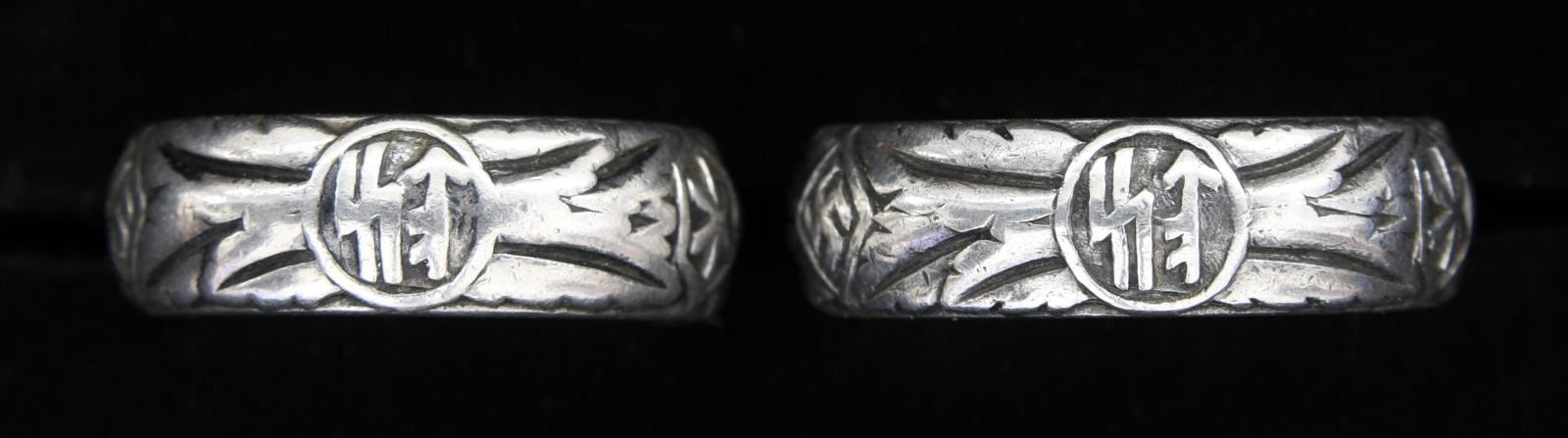 SILVER. The larger of the 2 rings has a skull & crossbones on the front of the ring w/ “SS” and other German symbols surrounding the band. The interior of the ring is engraved “L. N. Kimbier 21.6.44 H. Himmler.”. The smaller ring is of the same design, but the interior reads “S. N. Batzer 27.6.44. H. Himmler”. After close examination, we believe these rings are of post-WWII manufacturer, but we encourage interested parties to examine the rings in person and form their own opinion. CONDITION: both rings are exceptionally well-made and appear to be solid silver. Each has light overall wear with visible wear to the interior of the rings. (02-21042-8/BF). $200-400.