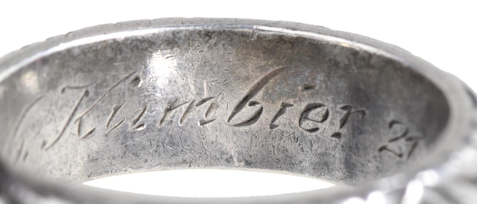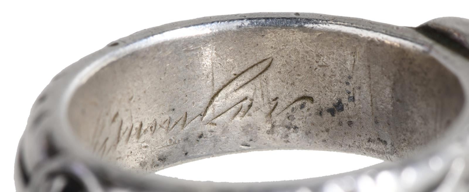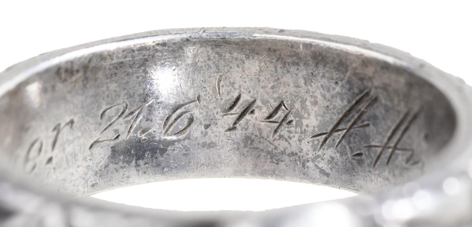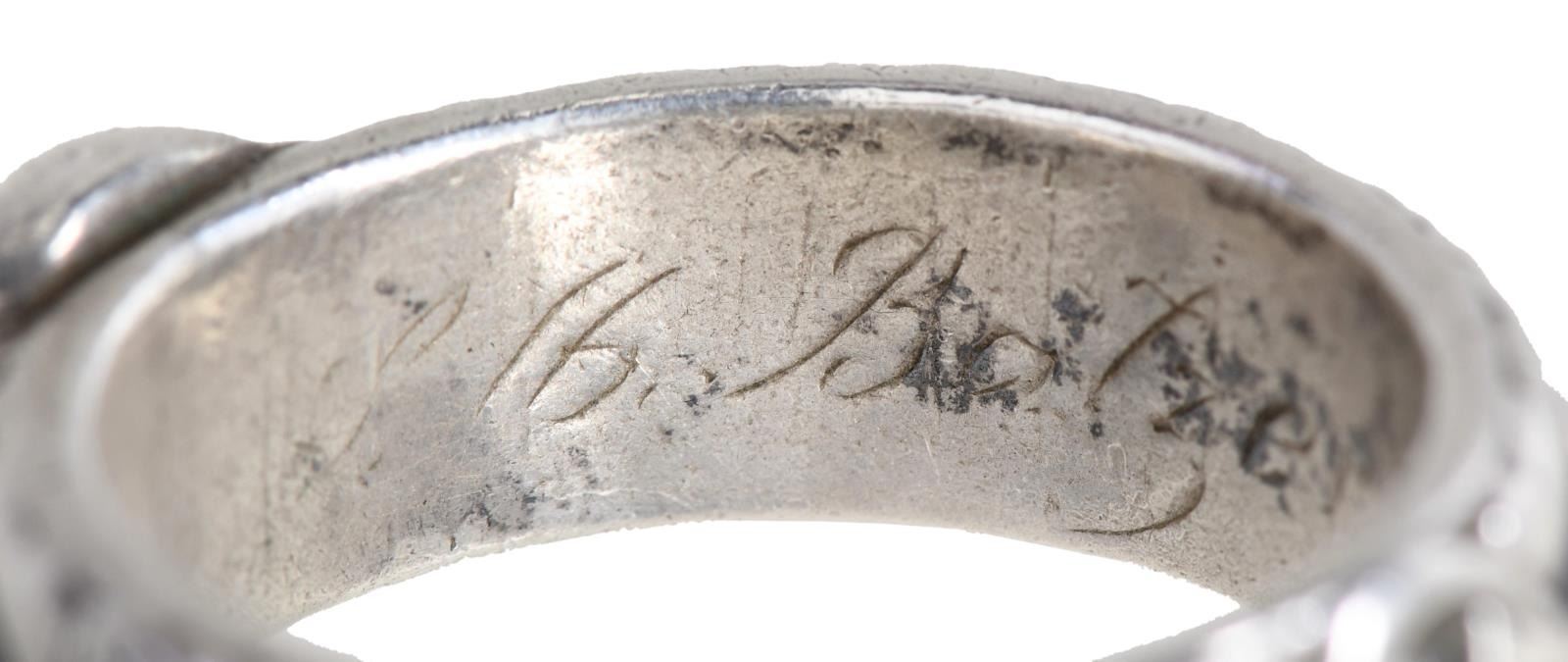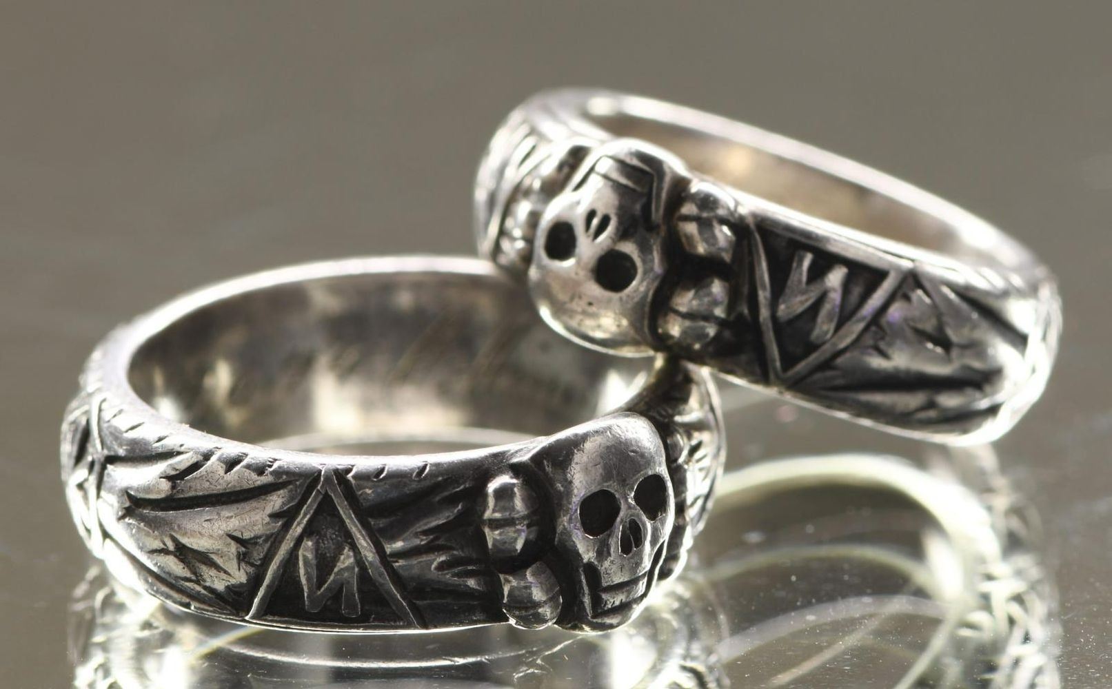 SILVER. The larger of the 2 rings has a skull & crossbones on the front of the ring w/ “SS” and other German symbols surrounding the band. The interior of the ring is engraved “L. N. Kimbier 21.6.44 H. Himmler.”. The smaller ring is of the same design, but the interior reads “S. N. Batzer 27.6.44. H. Himmler”. After close examination, we believe these rings are of post-WWII manufacturer, but we encourage interested parties to examine the rings in person and form their own opinion. CONDITION: both rings are exceptionally well-made and appear to be solid silver. Each has light overall wear with visible wear to the interior of the rings. (02-21042-8/BF). $200-400.