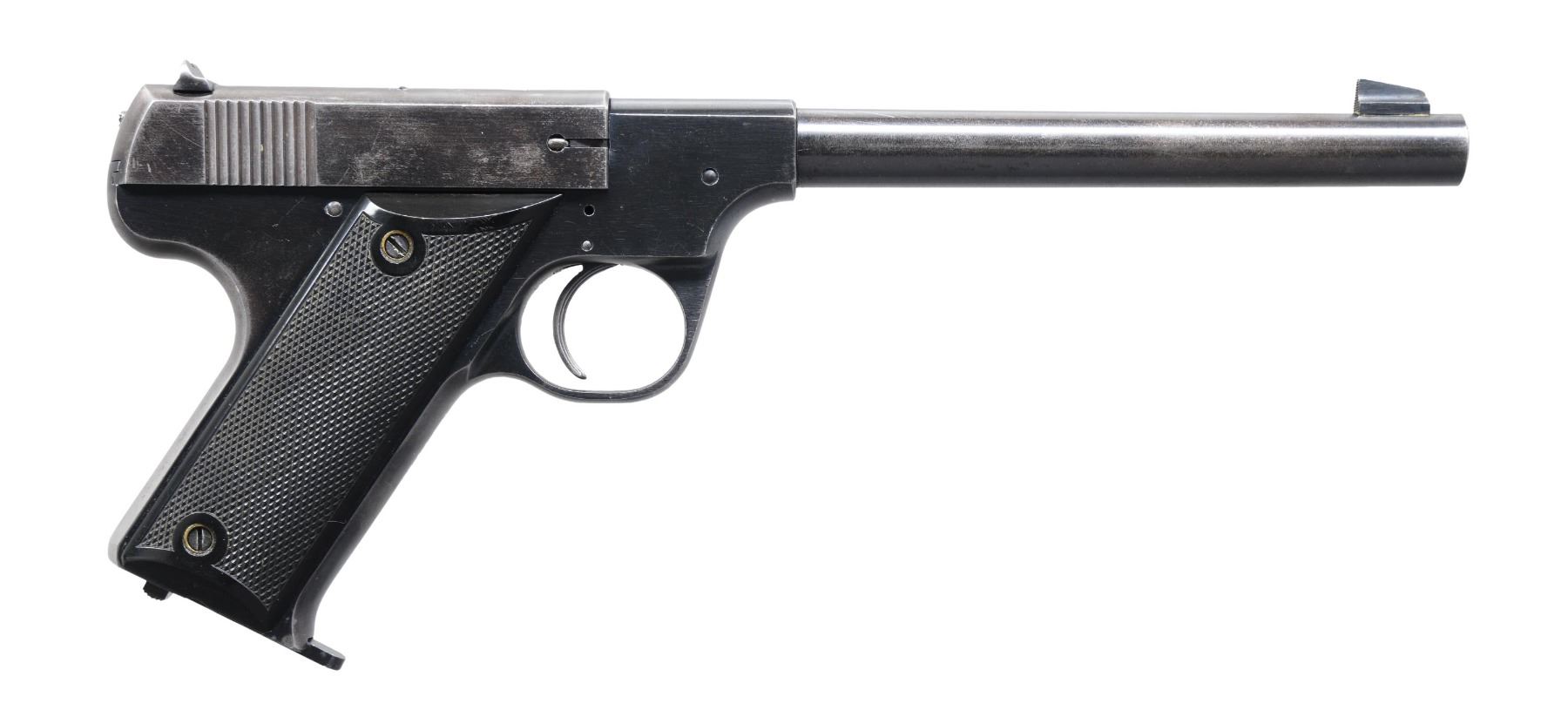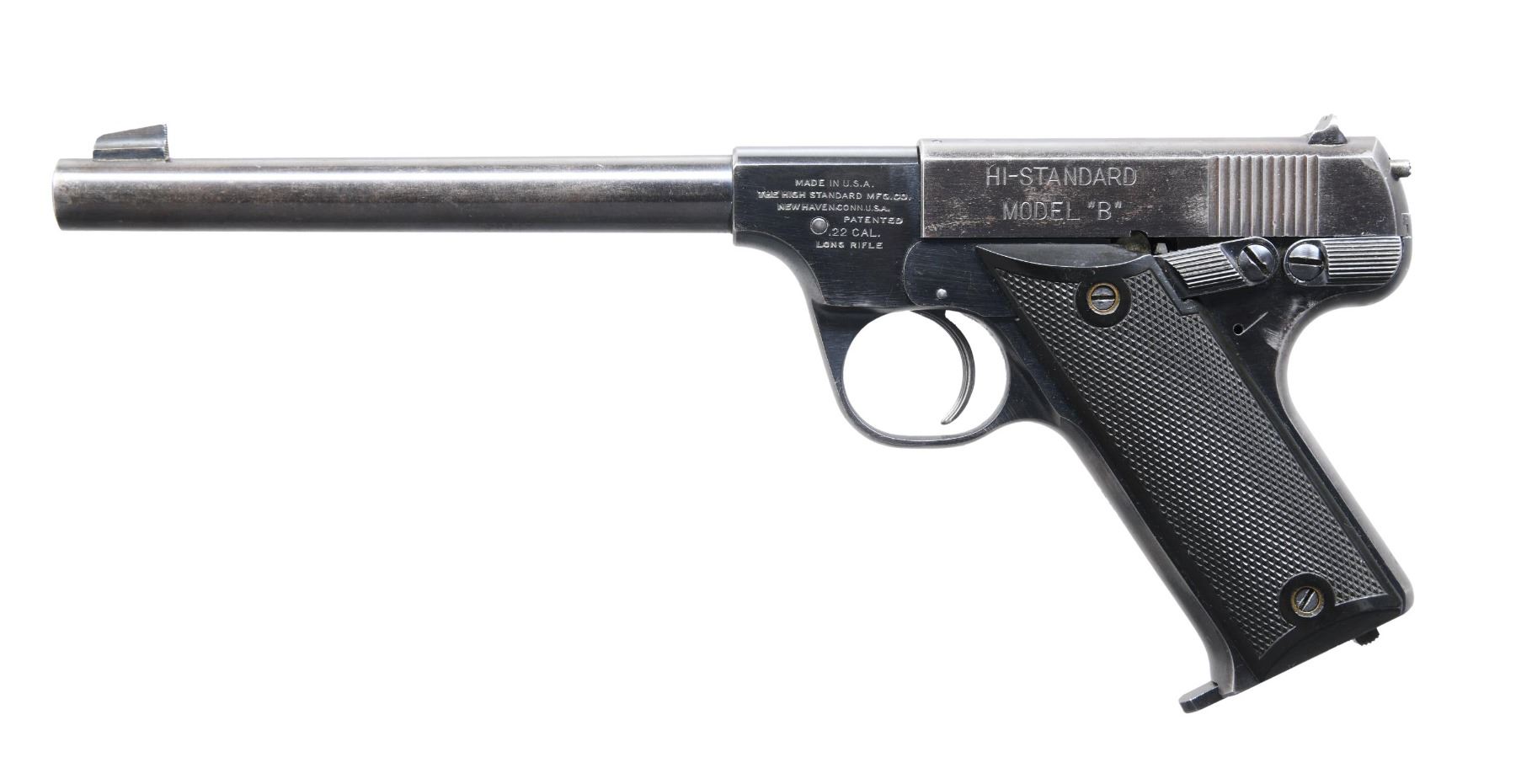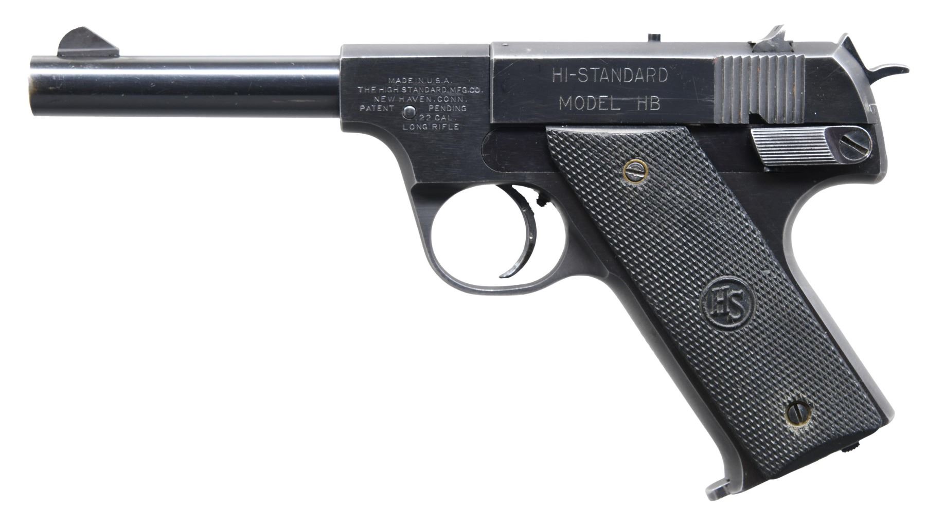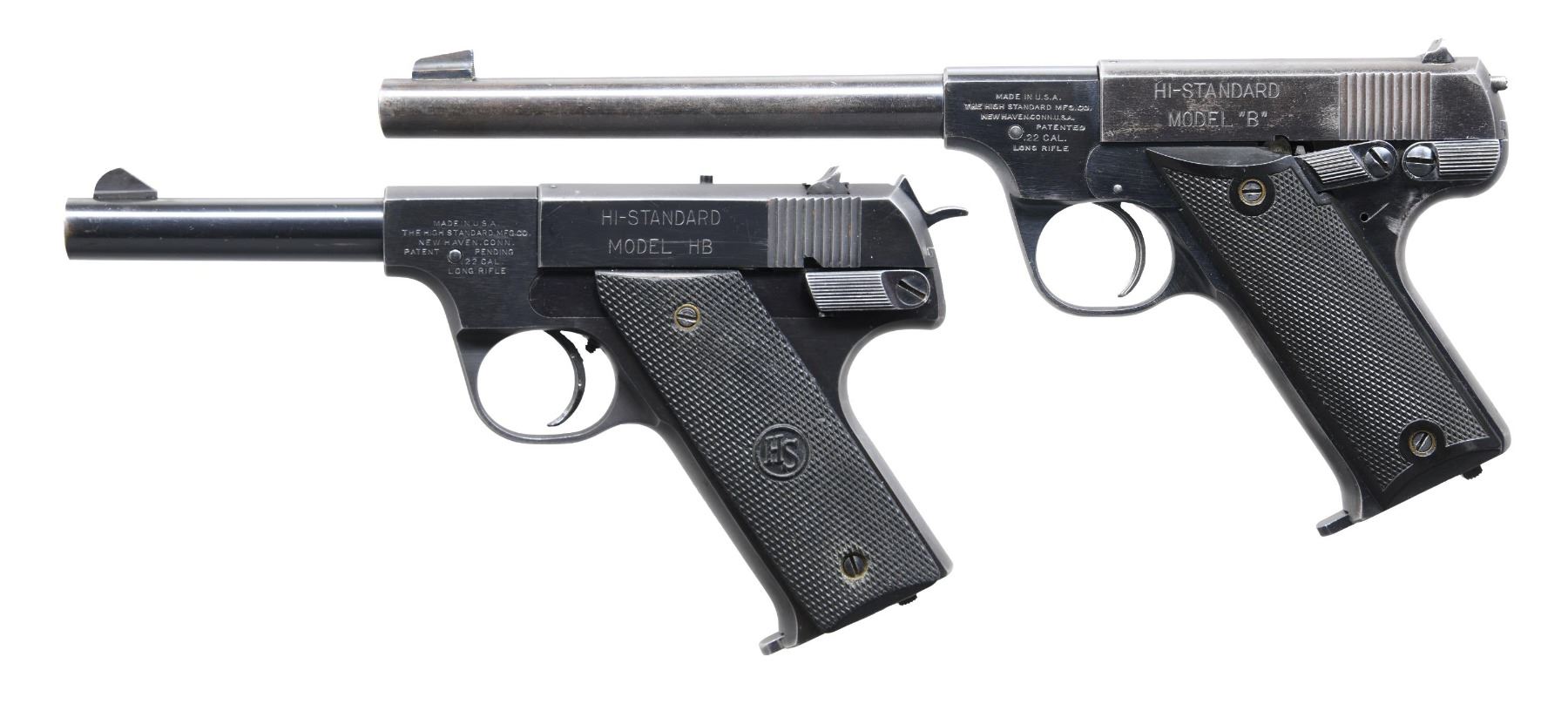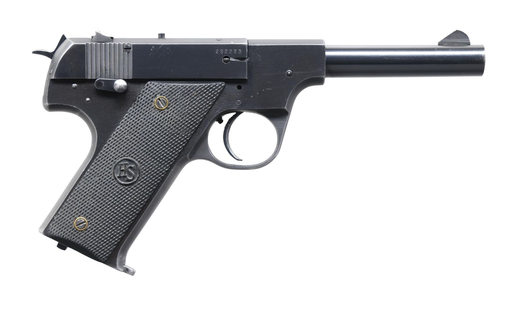 BOTH: Cal. 22 LR. Blued finishes with checkered hard rubber grips. Left side thumb safety levers and mag. latches on butts. Matching numbered slides. MAGS: 2 TOTAL 10 rd. (same mag. for each pistol); original 2 tone mags in very good condition. 1.) MODEL HB. S# 292223. Bbl. 4 1/2" with serrated angled blade front sight plus slide mounted windage adjustable rear. Mfg. 1948-1949 as Model #9003 being post war hammer version of Model B. Second model with exposed safety lever, over travel stop for trigger, HS logo on grips, right side takedown lever and exposed hammer. CONDITION: very good finish with thinning in grip area plus at high points. Light handling marks to include evidence of prior trigger shoe installation. Near excellent bore. (24-7227/NW). 2.) MODEL B. S# 8280. Bbl. 6 3/4" with serrated Patridge blade front sight plus slide mounted windage adjustable rear. Type I-A takedown assembly having round rod at rear of slide plus takedown lever and safety on left side of frame. Made 1932-1942 as Model 9001 have earlier border checkered grips without HS logo. CONDITION: good appearance with thinning finish having peppery oxidation plus some light handling marks. Near excellent bore and grips. (24-7230/NW). BOTH CURIO. $ 650-900 FOR BOTH.