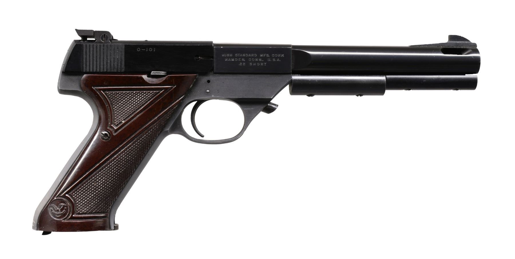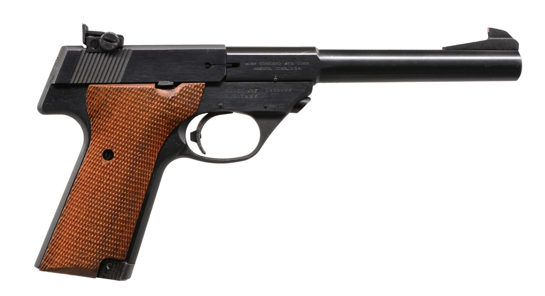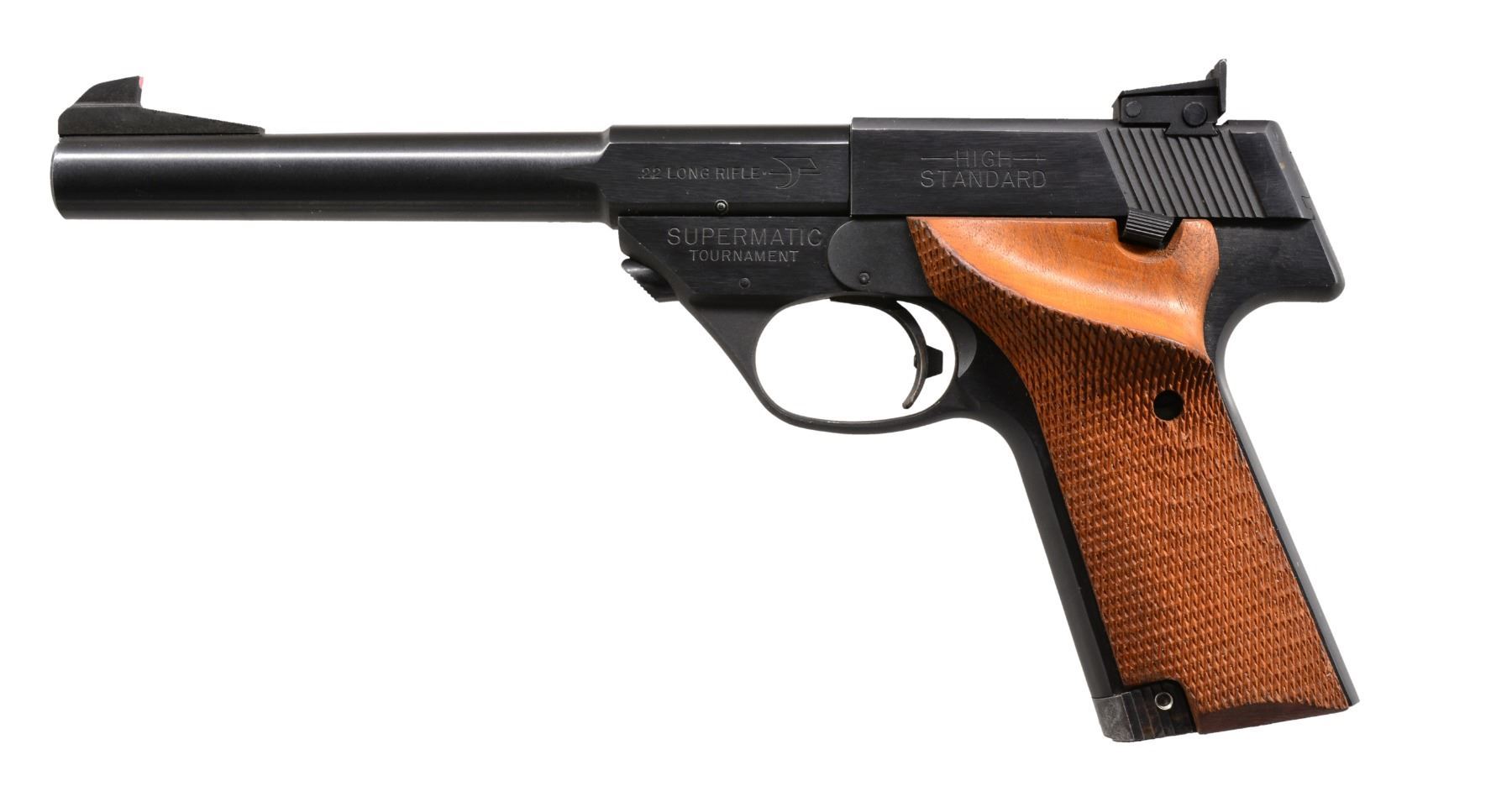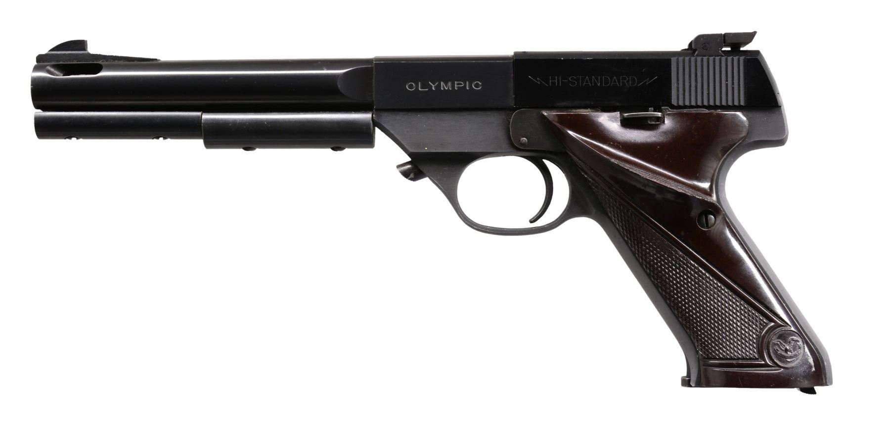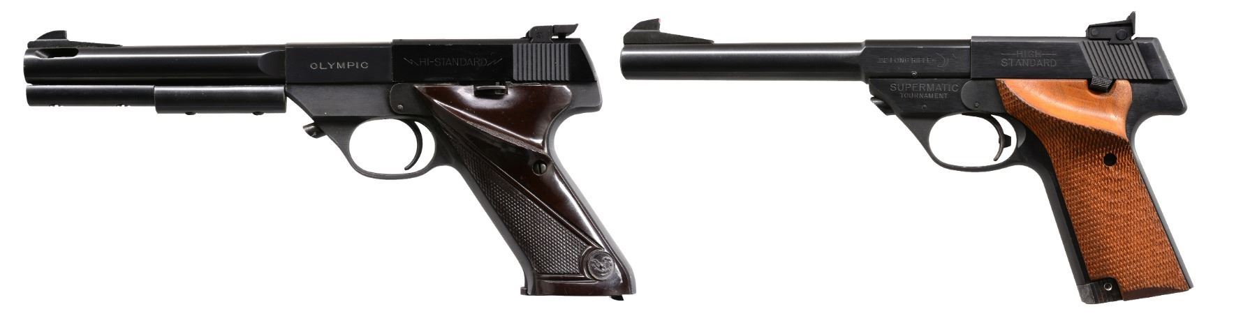 1) MODEL 0-101 OLYMPIC. Cal. 22 Short. S# 511066 (on frame under slide). Bbl. 6 3/4" w/ push button takedown & porting. Ramp mounted Patridge front sight w/ square notch adj. target rear sight. Bbl. fitted w/ 2 weights. Alloy slide. Blue finish w/ matte finished frame. 2 Piece checkered brown plastic grips. MAGS: 1 detachable 10 rd. CONDITION: over 95% metal finish showing edge wear & light fading on grip straps. Grips show scattered handling marks. Bore is bright w/ strong rifling. (20-47/DS). CURIO. 2) MODEL 107 SUPERMATIC TOURNAMENT MILITARY. Cal. 22 LR. S# 1938294. Bbl. 6 3/4". Ramp mounted patridge front sight w/ square notch adj. rear sight. Steel frame & slide. Blue finish. 2 Piece checkered finger rest wood grips. MAGS: 1 detachable 10 rd. CONDITION: 98% blue showing sm. scratches. Very good grips. Bore is bright w/ sharp rifling. (20-62/DS). MODERN. $1,000-1,400.