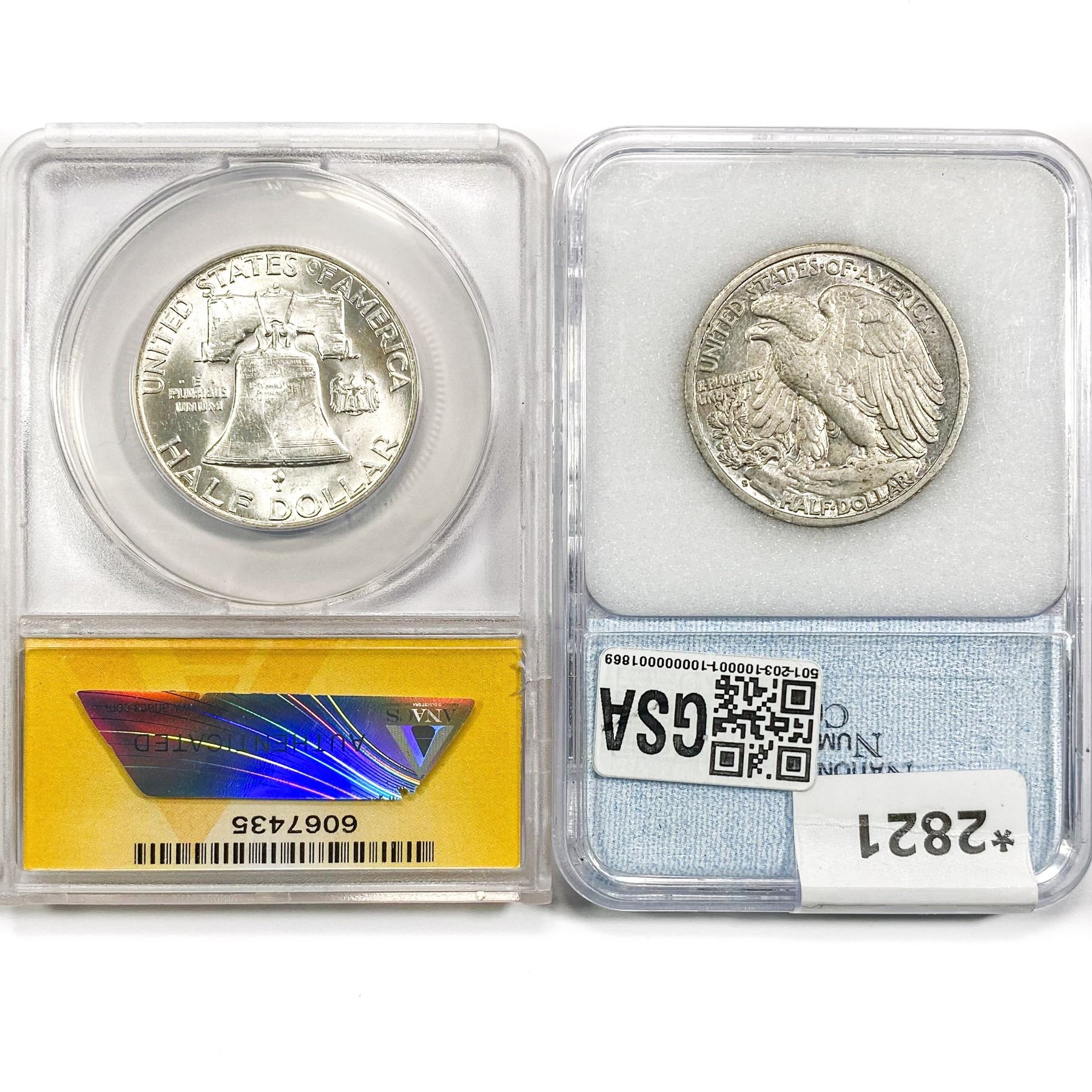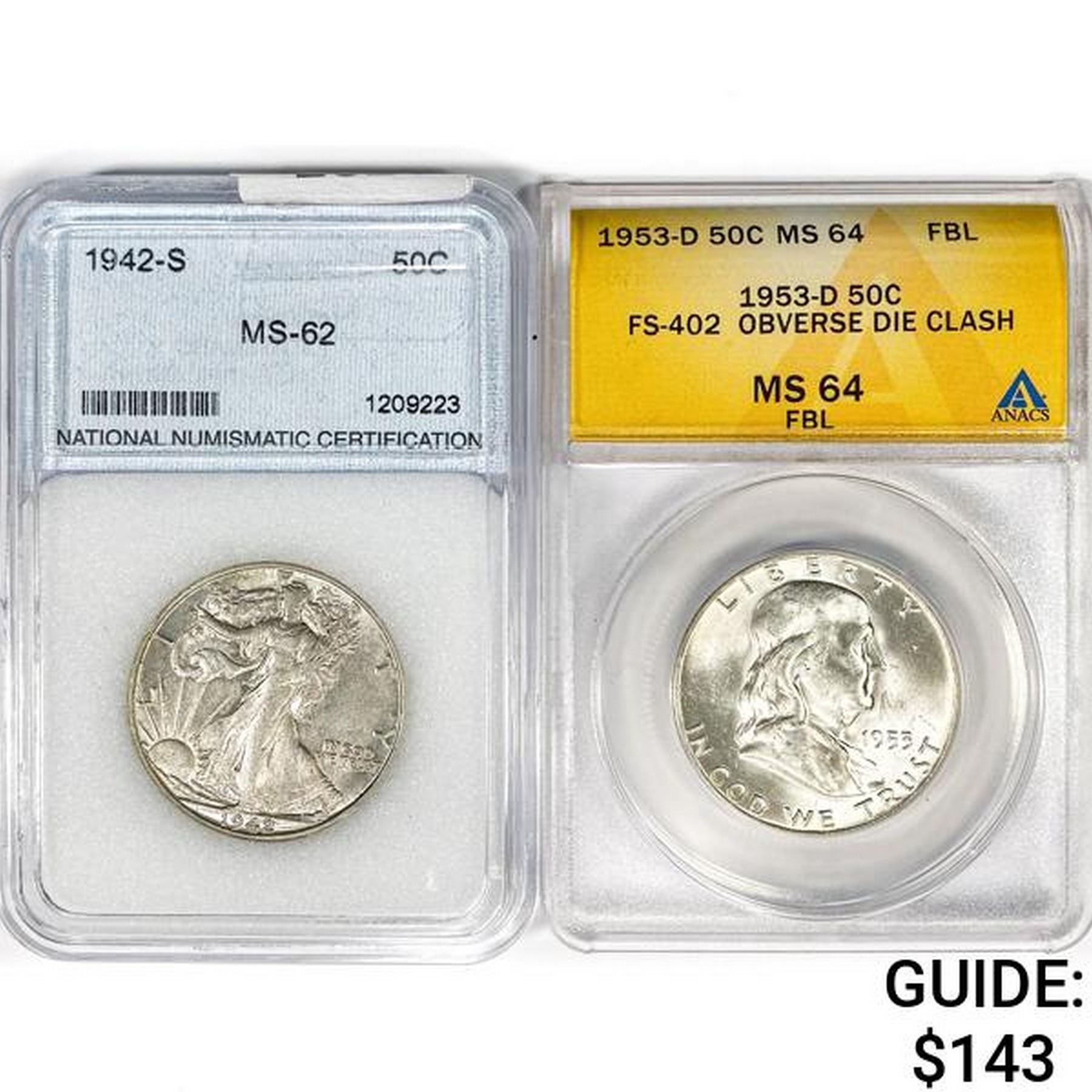 (2) Half Dollars w/OBV DC NNC,ANACS MS 1942-1953