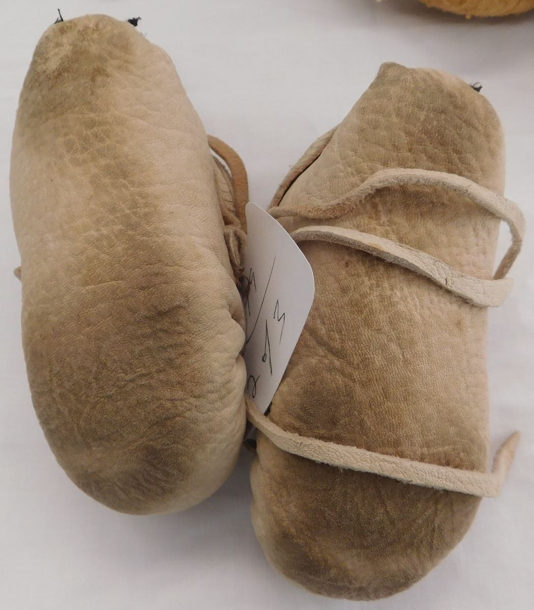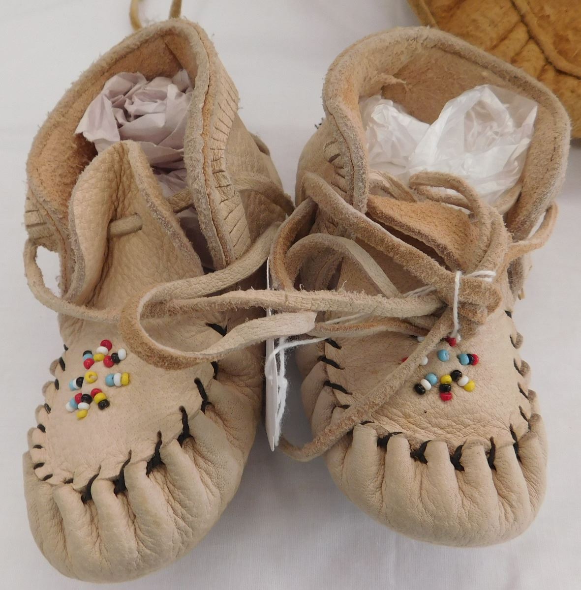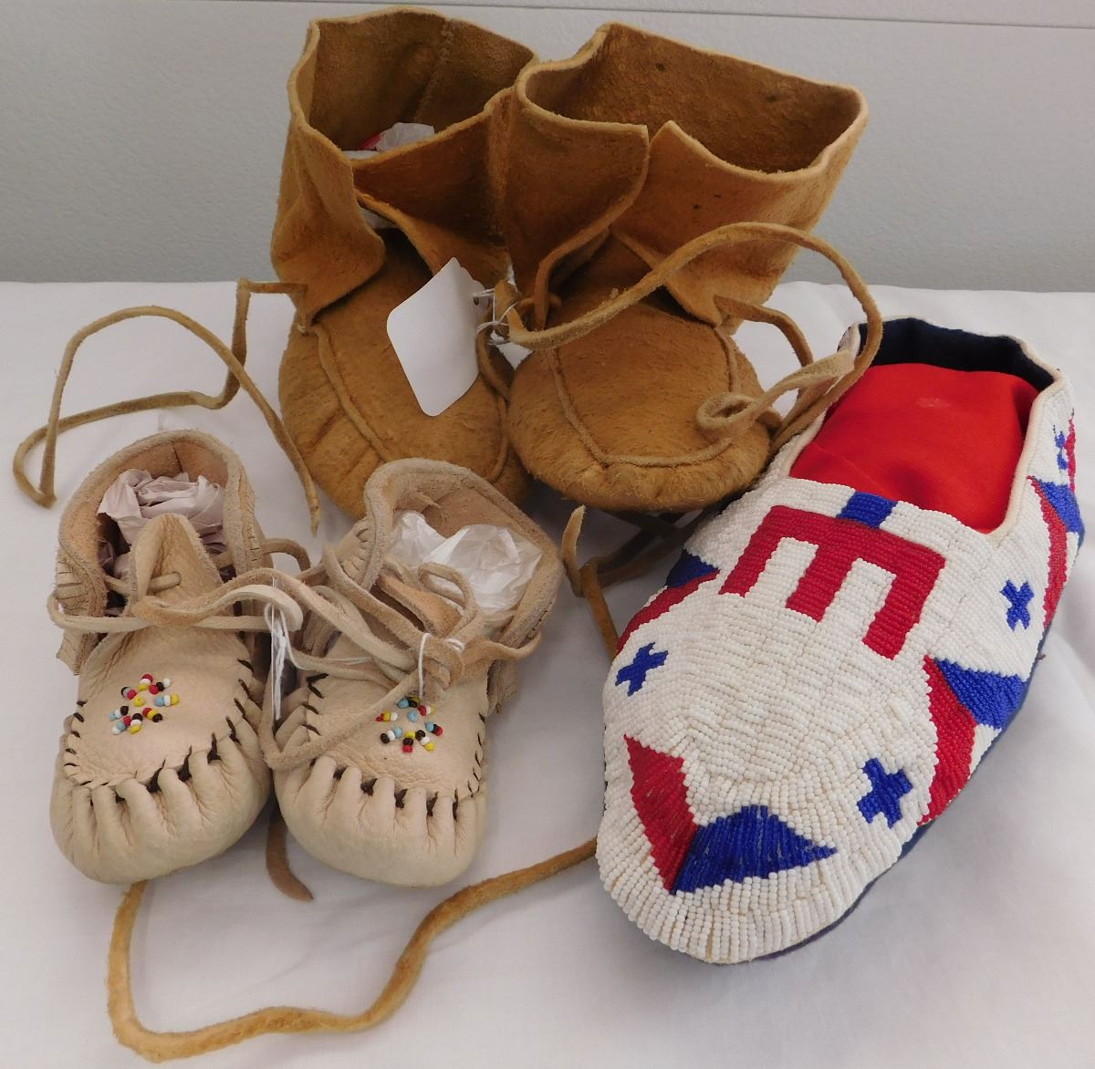 2 & Half Pair of Moccasins. 2 pairs circa 1930s, half a pair likely 1980s. Items are made of moosehide, deerhide and glass beads with cloth. Items measure 10.5 x 4 x 3, 8 x 6 x 4, and 6 x 2 x 2 inches. From Central Canada, Cree. Condition: One single moccasin included, see images. Shipping: $24.50.