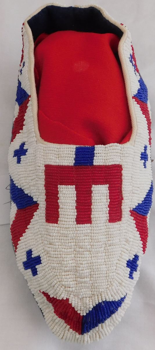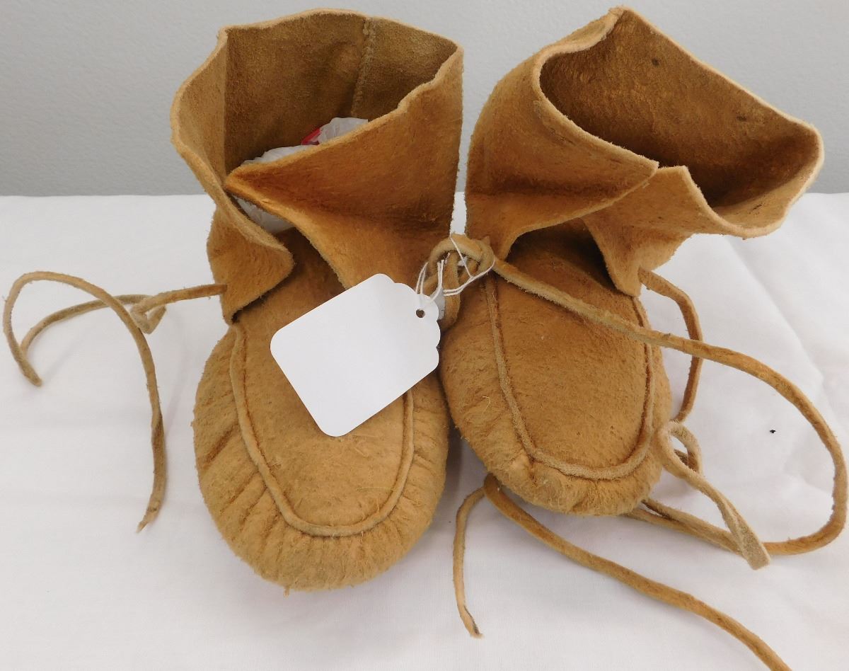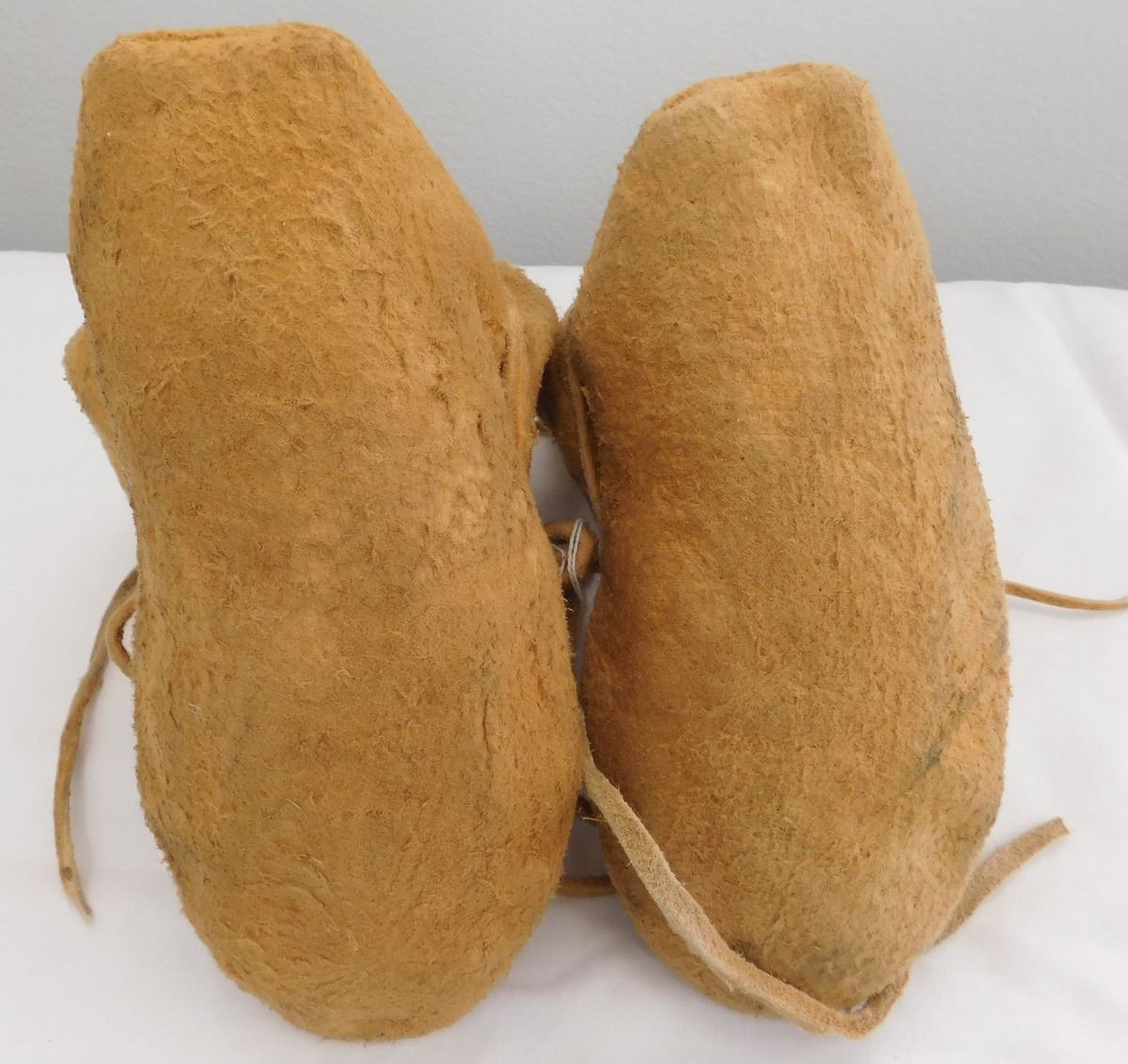 2 & Half Pair of Moccasins. 2 pairs circa 1930s, half a pair likely 1980s. Items are made of moosehide, deerhide and glass beads with cloth. Items measure 10.5 x 4 x 3, 8 x 6 x 4, and 6 x 2 x 2 inches. From Central Canada, Cree. Condition: One single moccasin included, see images. Shipping: $24.50.