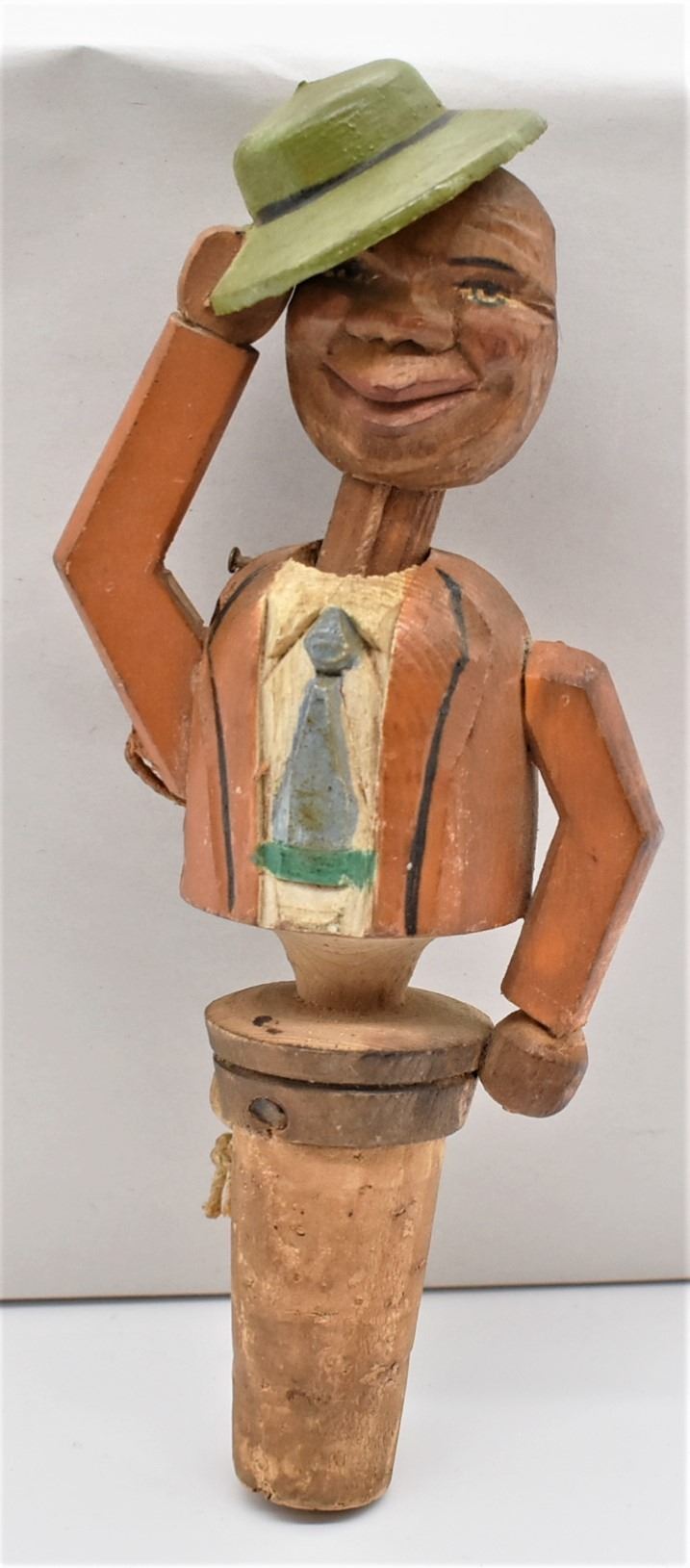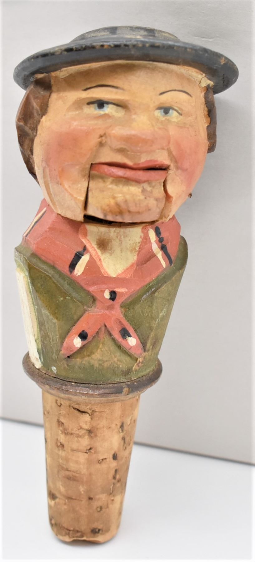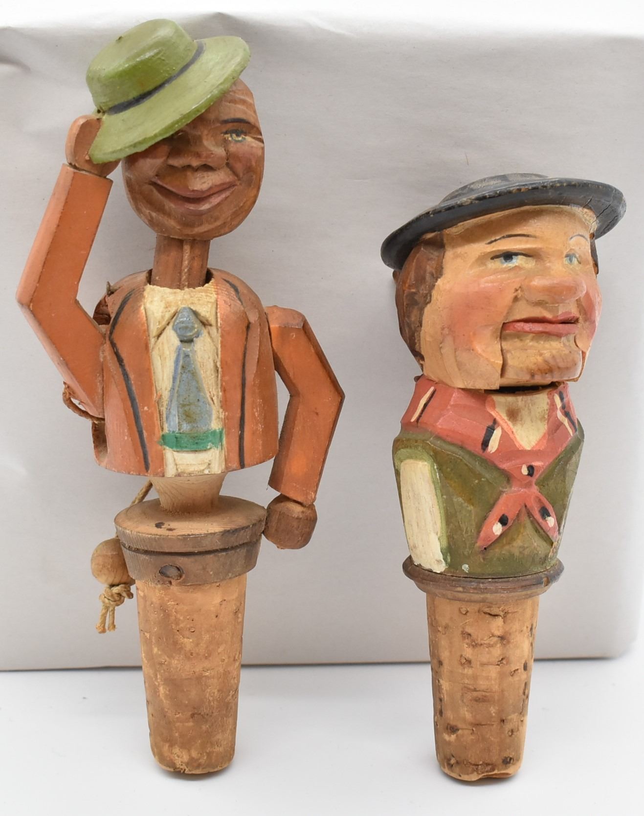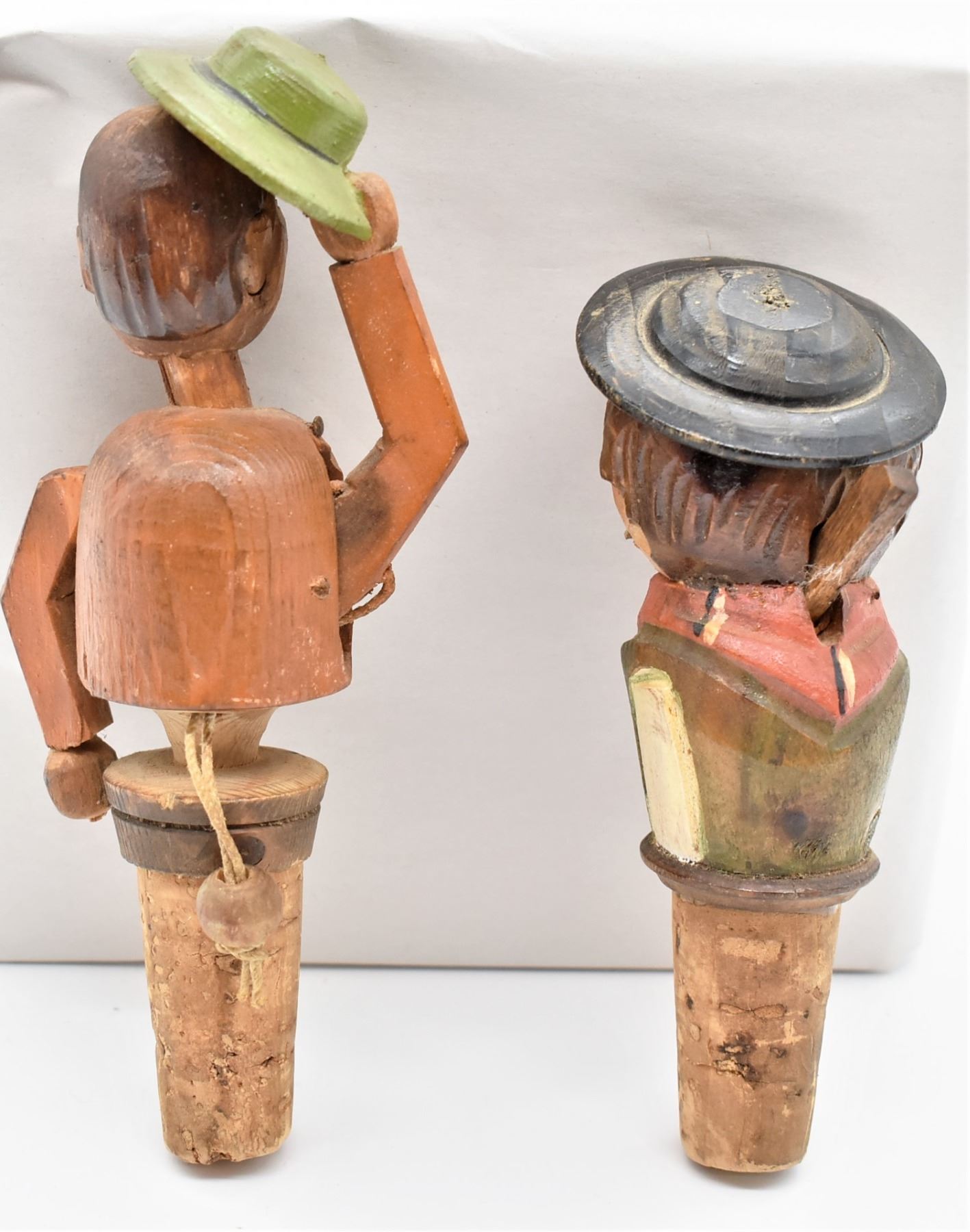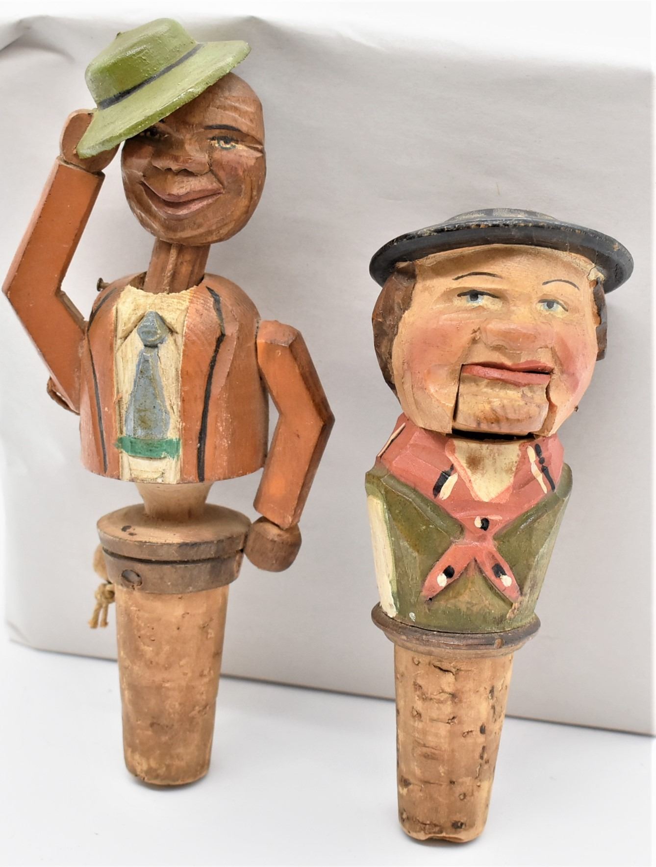 2 Vintage Hand Carved German Wood & Cork Mechanical Bottle Stoppers, each moves, one removes his hat and the other opens and closes his mouth, longest measures 5.5''L