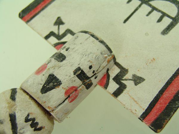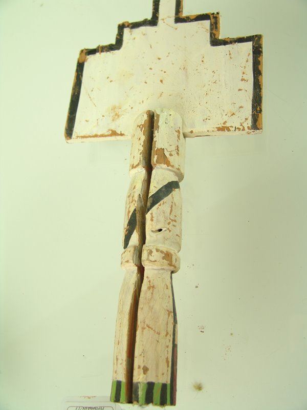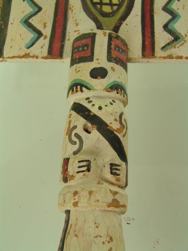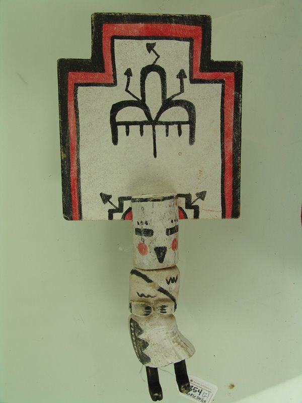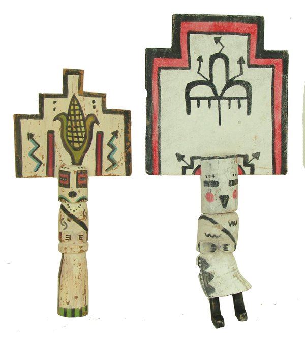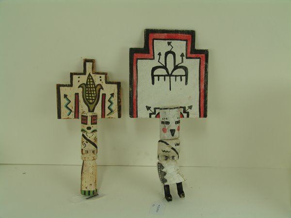 Pair of old style, hand carved and painted cottonwood root kachina dolls, each with large, traditional, tabletta headdress. Very good condition.