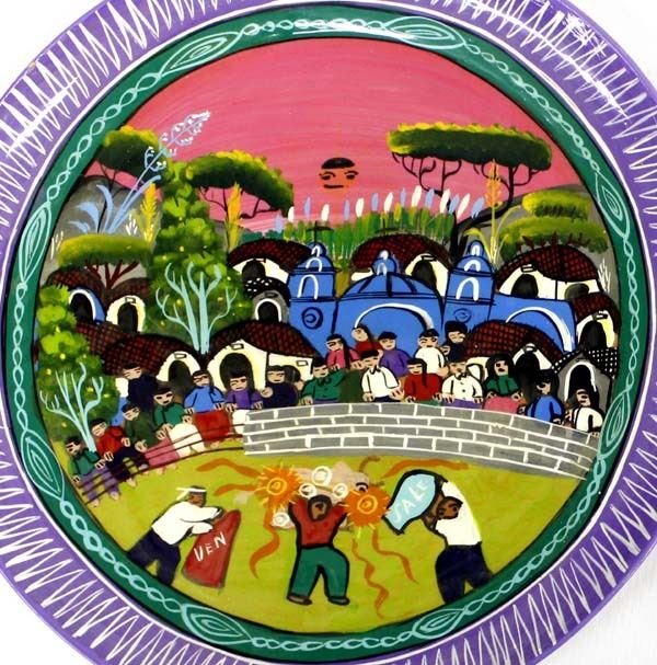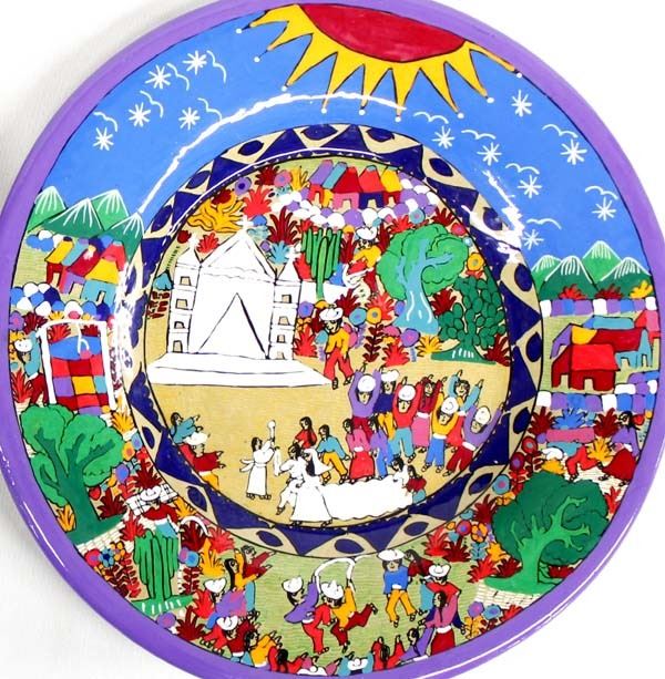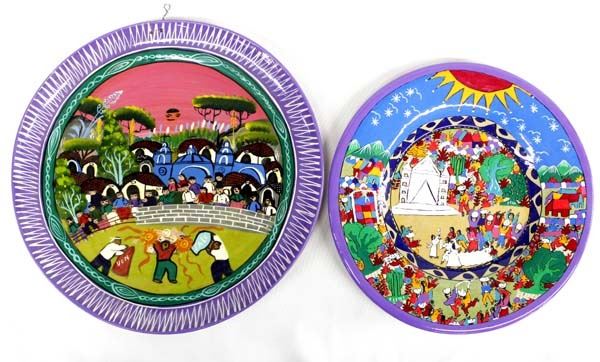 2 Hand Painted Mexican Pottery Plates, Oaxaca Mexico, largest measures 1'' x 14''D, beautiful vibrant colors