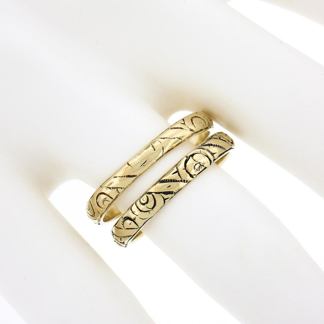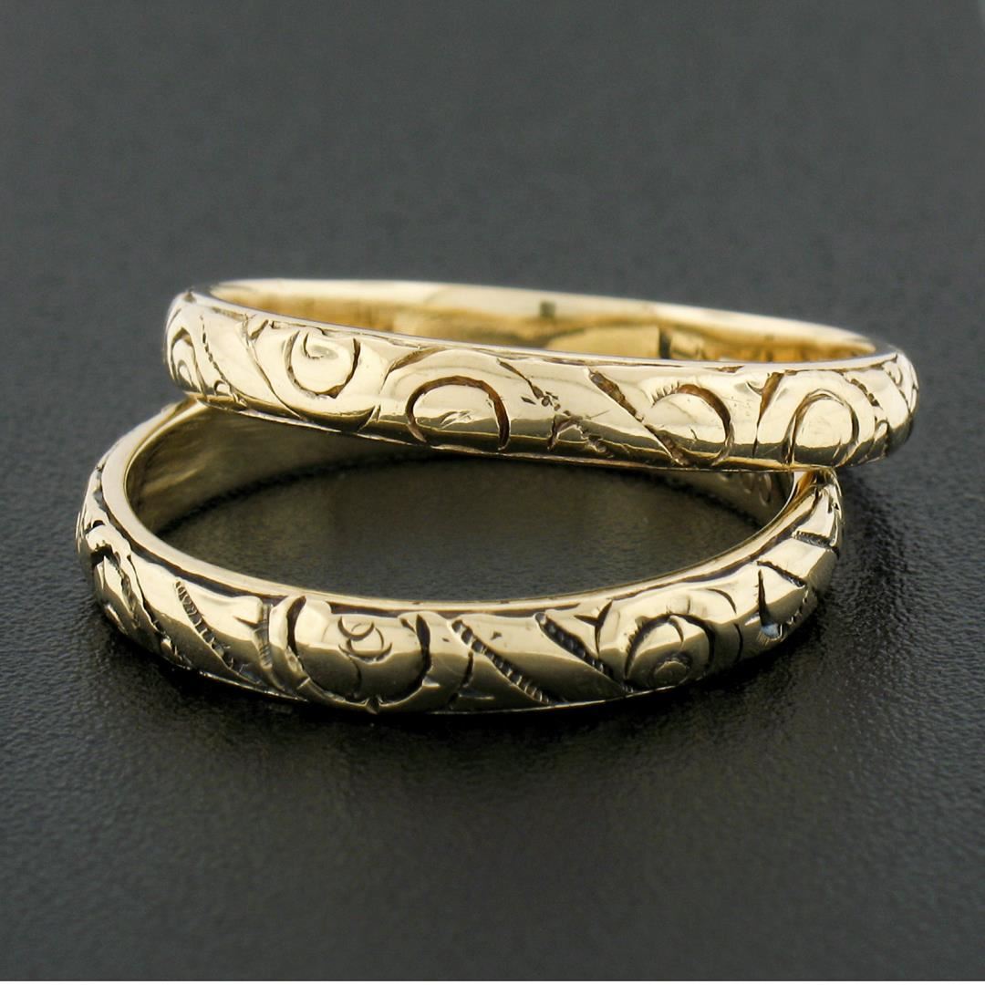 A solid 14k yellow gold set of 2 band rings. The rings are size 8.5 & 9.5, weighs a total of 6.26 grams, and measures 3.1 & 3.2mm wide.
