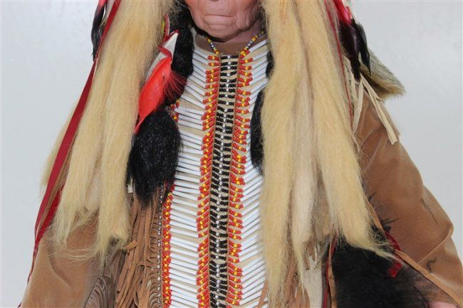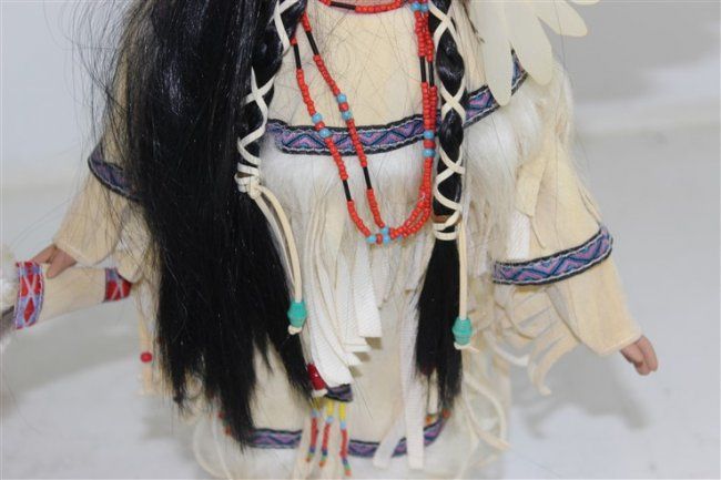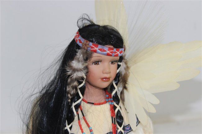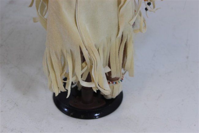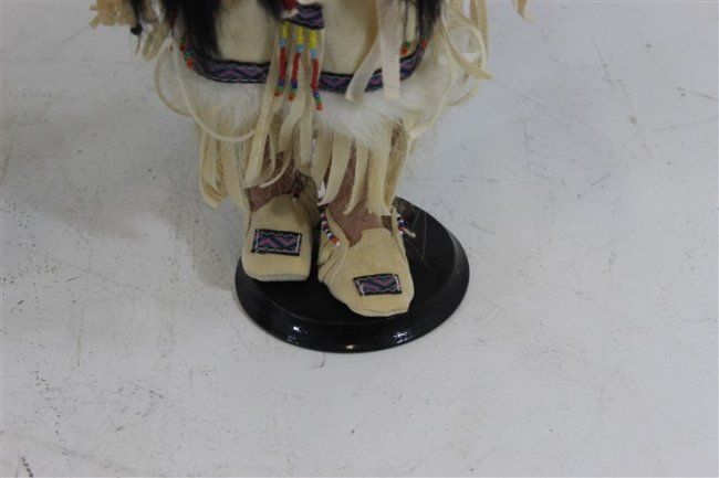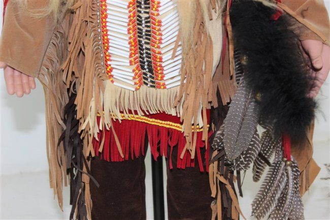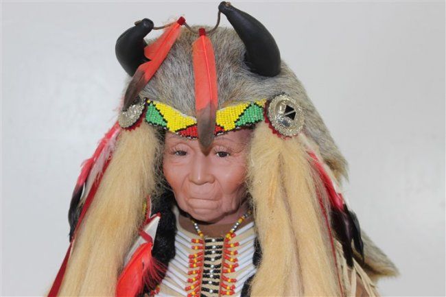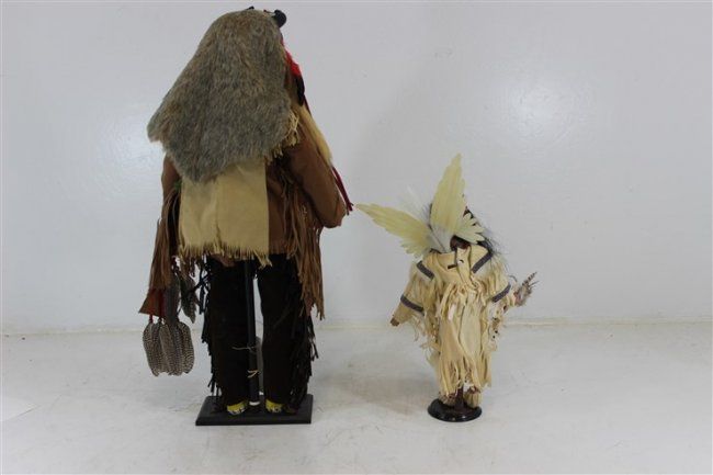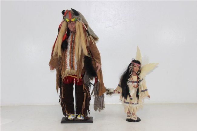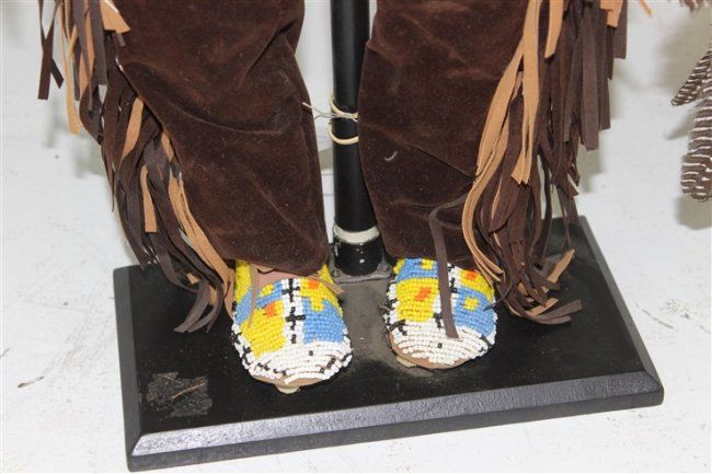 1 indian chief with full handmade leather outfit , leather and bone breast plate, buffalo horn and fur headdress with beaded headband and moccasins approx 33" tall x 14" wide on a stand , Indian princess in full leather outfit, with feather wings, and natural hair, beaded necklace and leather moccasins approx 21" tallx 12" wide