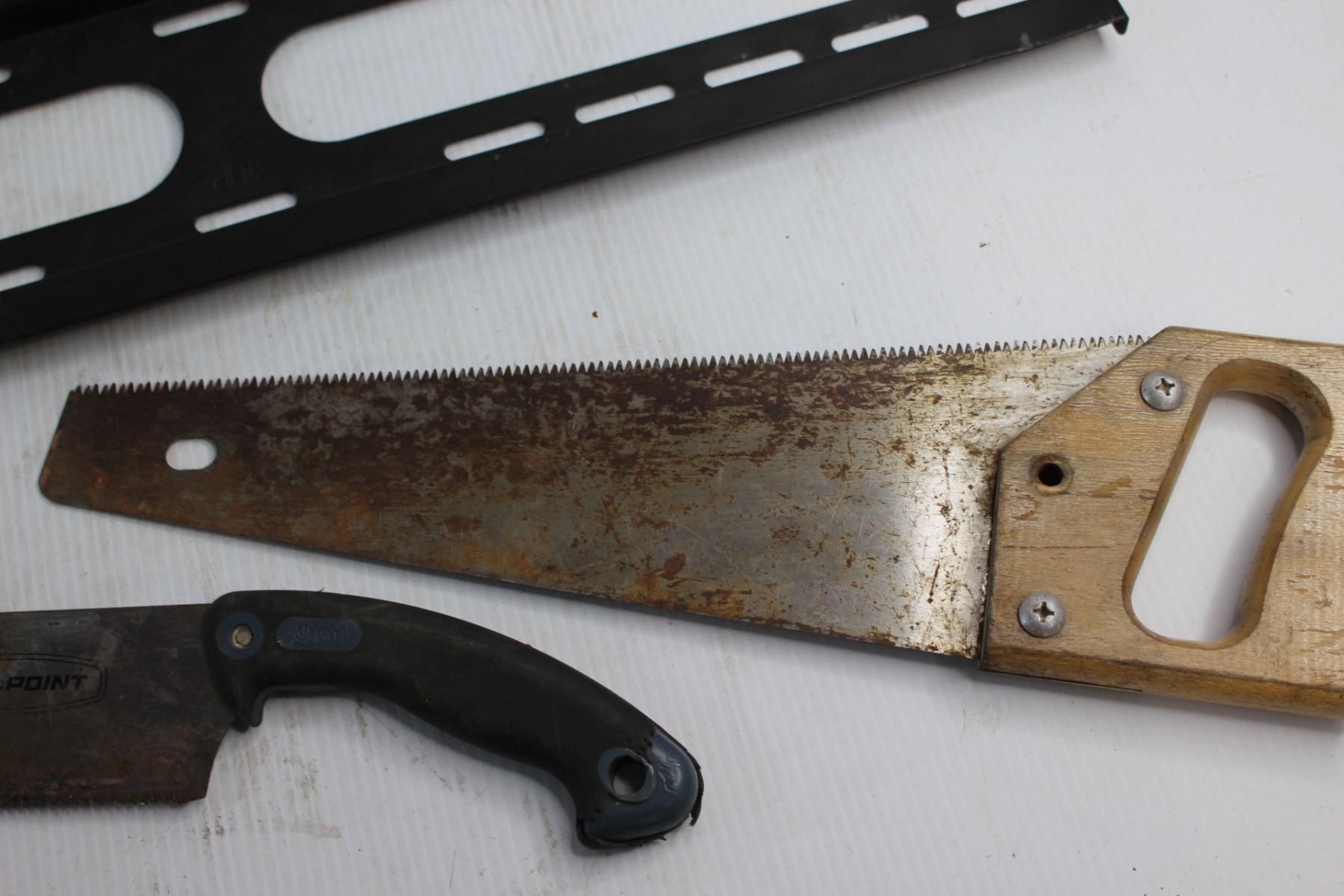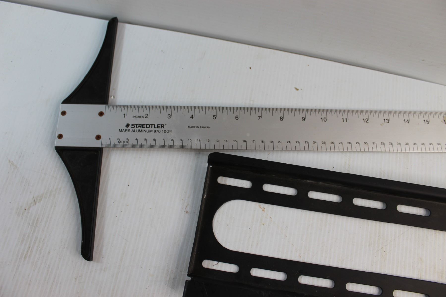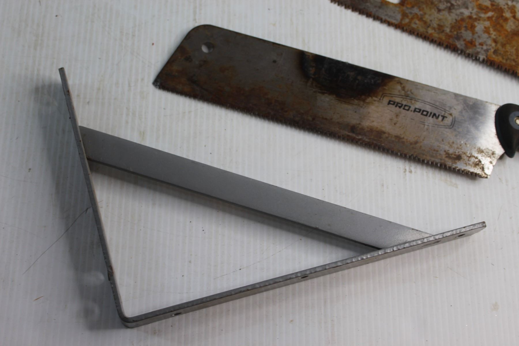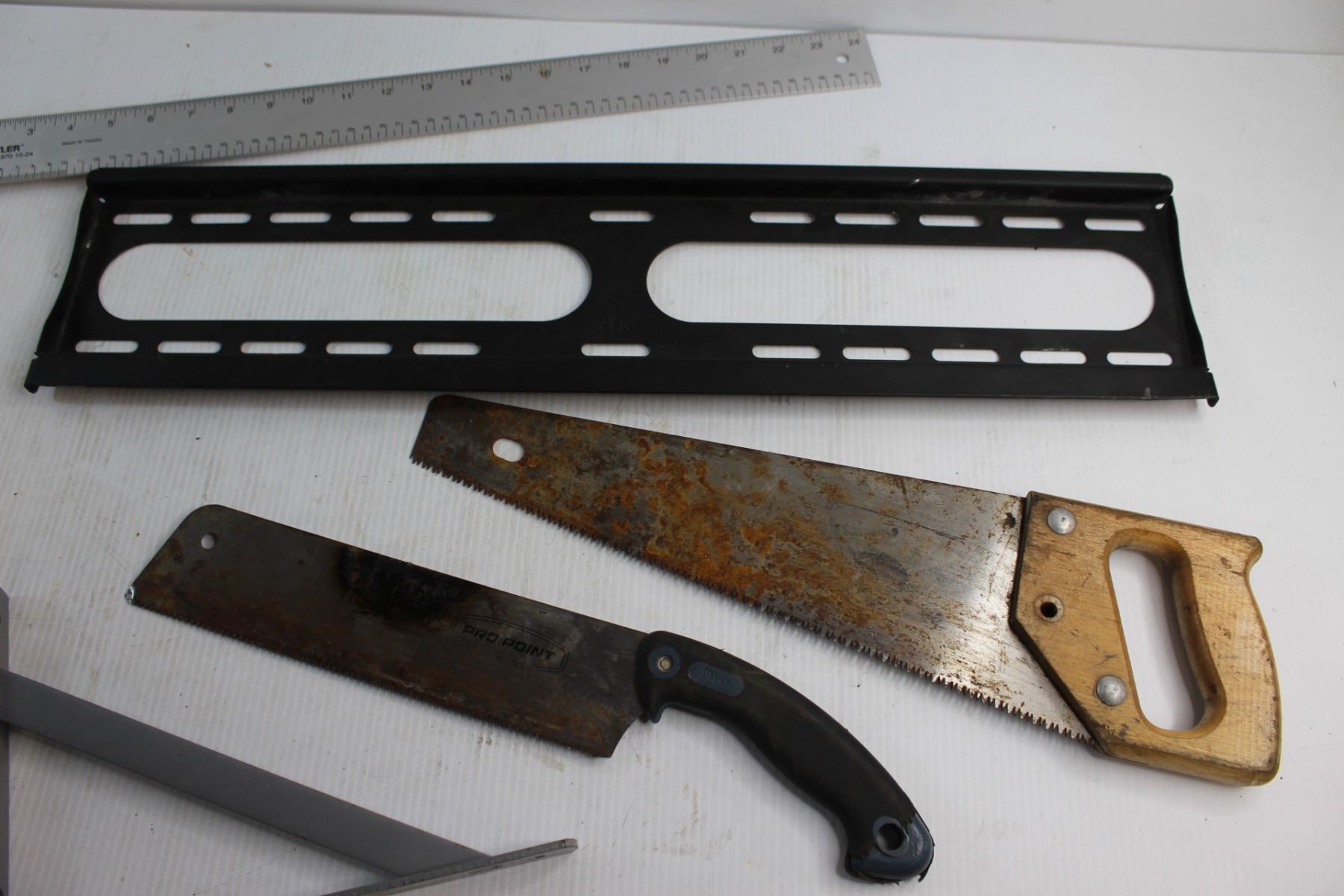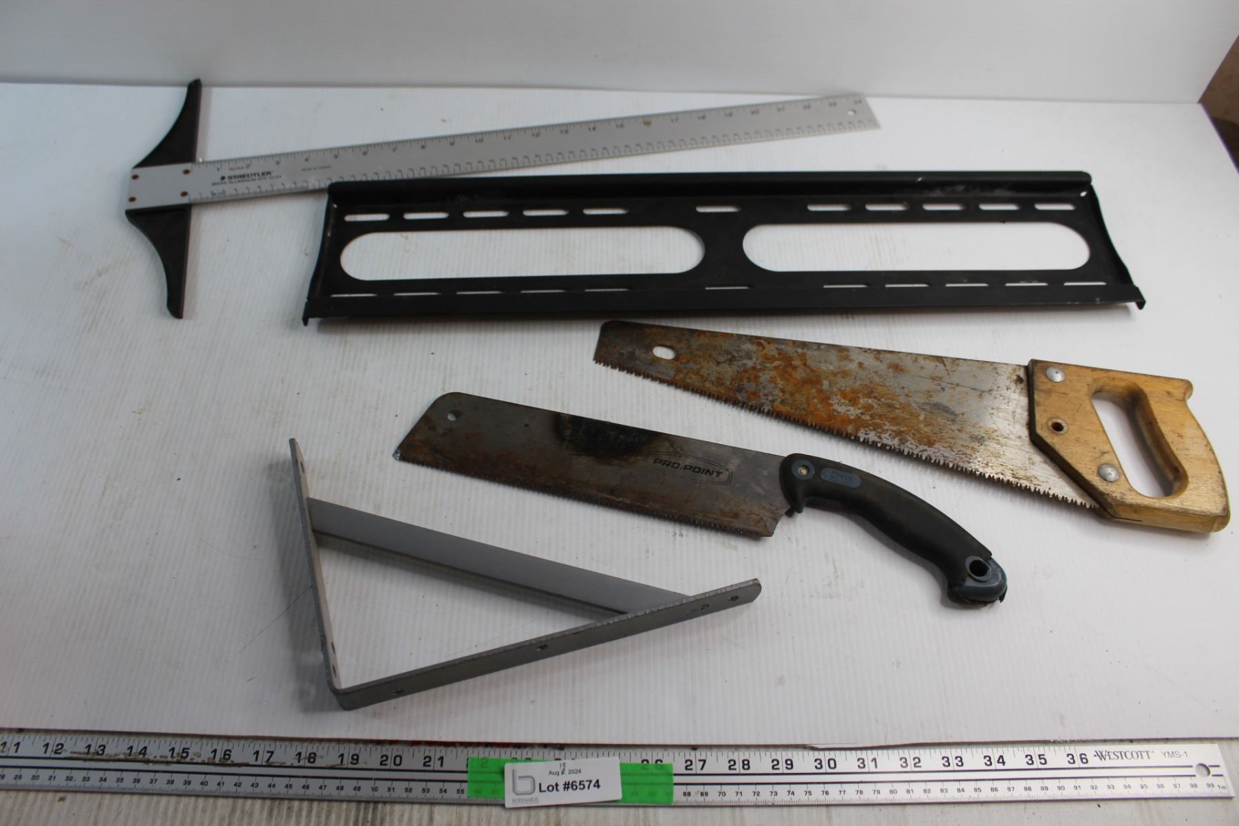 (2) Handsaws, Square, Tool Rack and Staedtler Drafting Square - As Is
