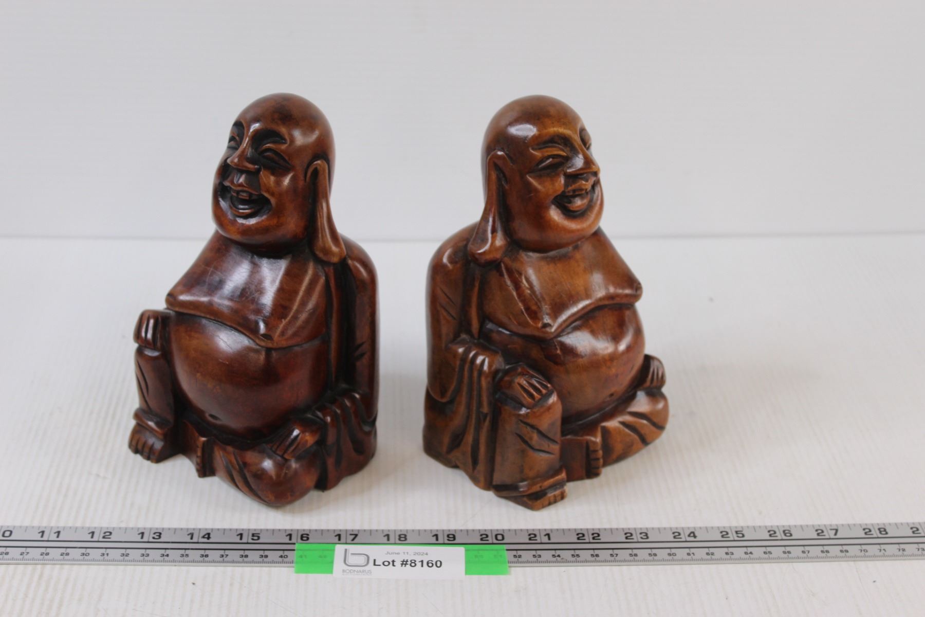 (2) Happy Budda Wooden Book Ends (8"tall)
