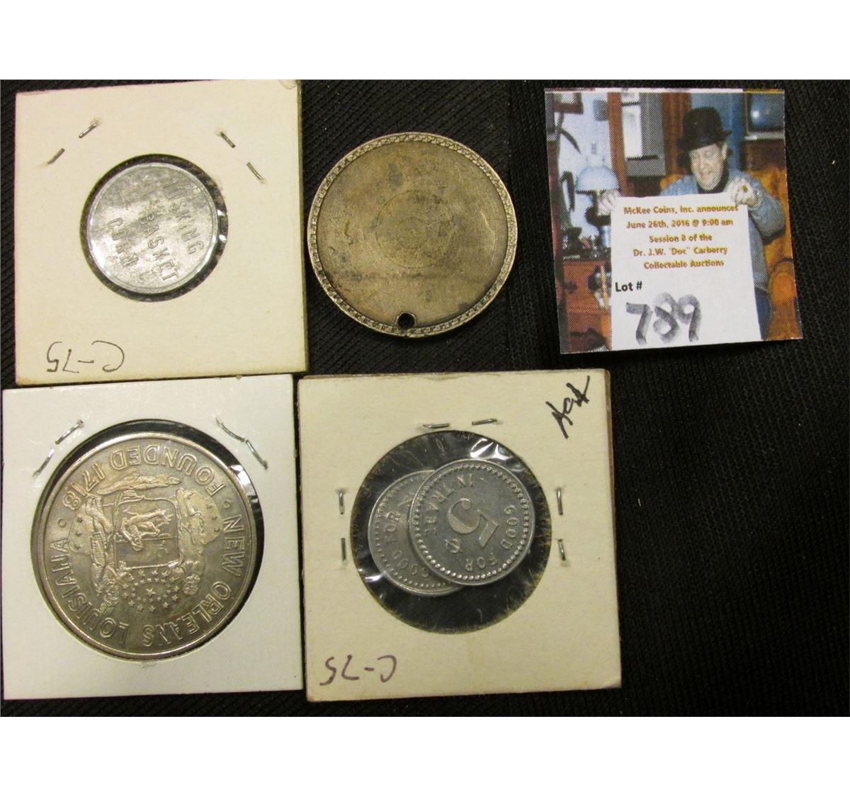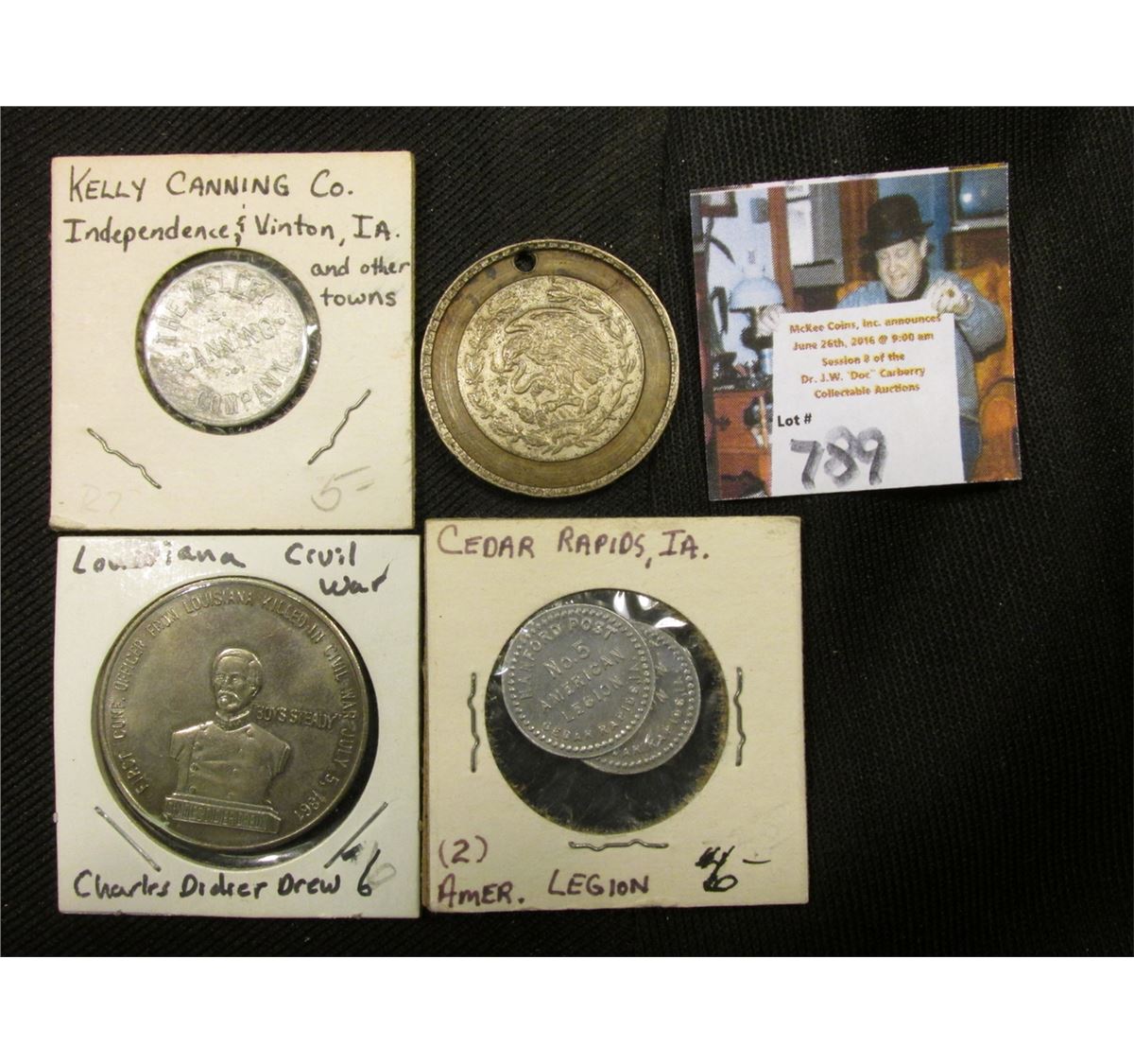 (2) "Hayford Post/No.5/American/Legion/Cedar Rapids, Ia.", Good for 5c & 10c Tokens; "First Conf. Officer from Louisiana Killed in Civil War July 5, 1861/Charles Didier Dreux/"Boys Steady" medal; "The Kelley/Canning/Company", "Husking/Basket/Corn" token; & a Bi-metal Mexico Silver/Brass Medal with hole.