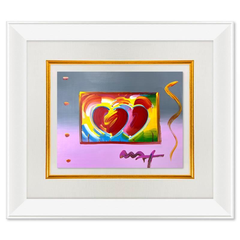 "2 Hearts" is a hand signed one-of-a-kind acrylic mixed media on paper by Peter Max. The piece comes custom framed with a backside cutout to display Peter Max Studio registration number 238027 certifying authenticity. Measures approximately 26" x 30" (frame), 13" x 17" (image). This item requires special handling and may have a longer than usual turnaround.